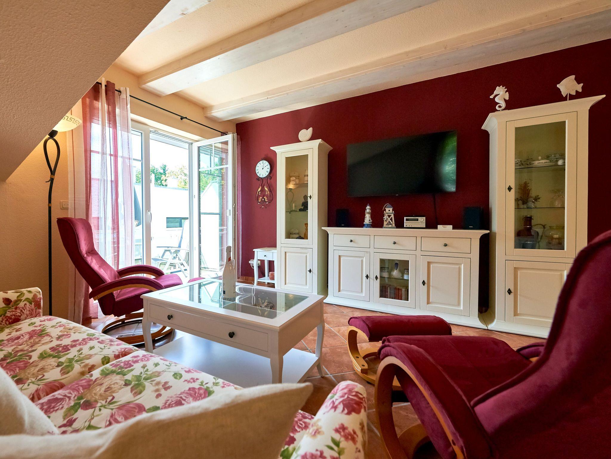Das große Wohnzimmer (Klick zum Video) mit sichtbaren Deckenbalken verfügt über ein gemütliches Sofa mit Schlaffunktion (hochwertige Matratze für angenehmen Schlafkomfort), einen Esstisch, einen 50 Zoll Smart-TV und eine Musikanlage mit Radio/CD/USB- sowie Smartphoneanschluss. Kostenfreies W-LAN mit 20 Mbit/s steht Ihnen in der Wohnung ebenfalls zur Verfügung.