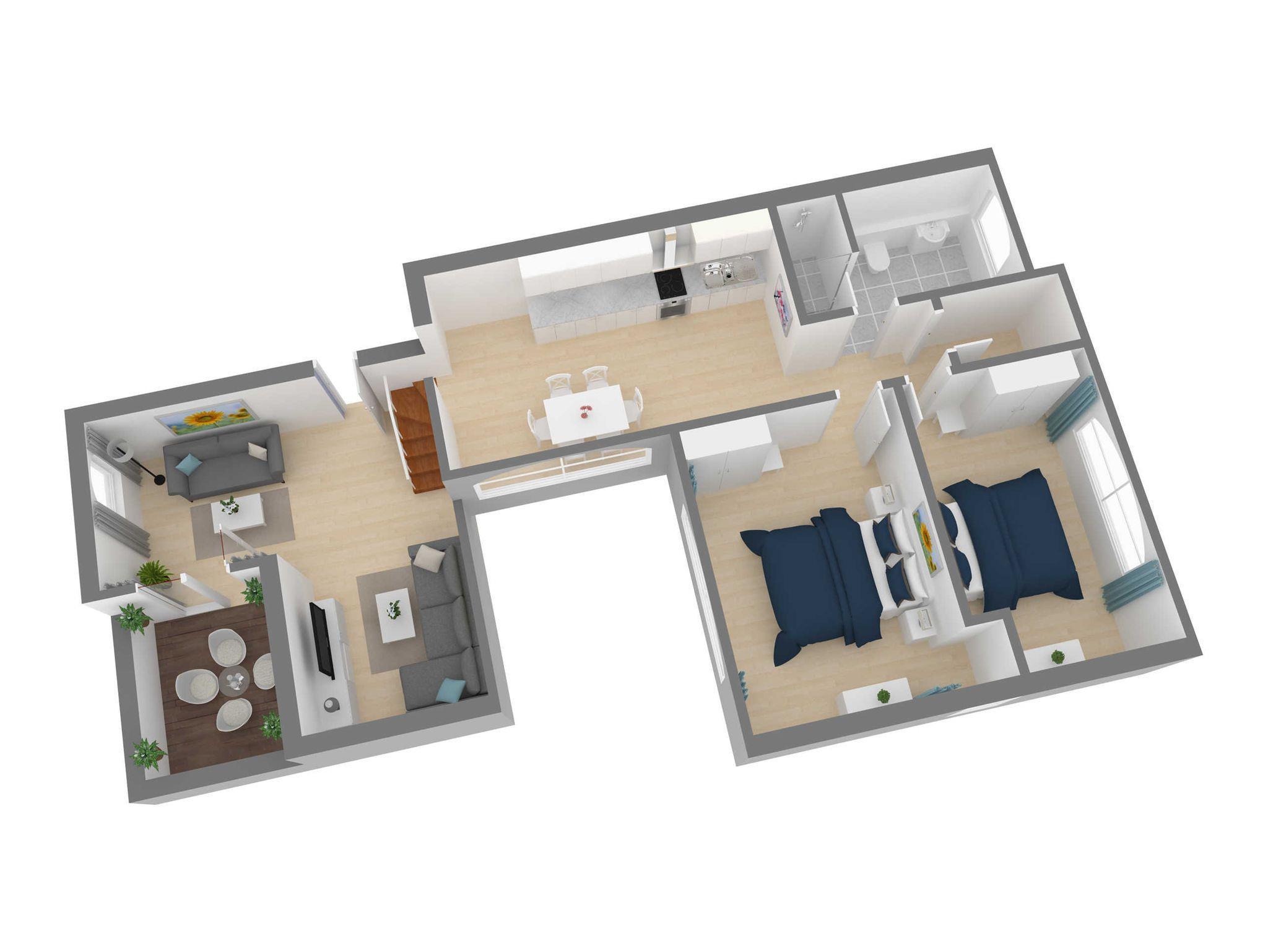 Starten Sie hier idyllisch in Ihren Urlaubstag und genießen Sie ein leckeres Frühstück direkt auf Ihrem Balkon. Die Ausrichtung der Balkone sind nach Süd bzw. Nord. Eine Treppe führt Sie direkt in den Küchenbereich, in dem die große Küchenzeile über alles verfügt, was das Herz zum Kochen begehrt. Nutzen Sie den Backofen sowie das moderne 4-Platten-Cerankochfeld und lassen Sie doch den Geschirrspüler das Abwaschen übernehmen. Am großzügigen Esstisch finden alle Gäste dieser Wohnung bequem Platz. Von hier aus erreichen Sie auch die beiden separaten Schlafzimmer, die jeweils mit einem bequemen Doppelbett und einem großen Kleiderschrank ausgestattet sind. Ebenso grenzt hier das Tageslicht durchflutete, moderne Bad mit 2 Waschbecken, WC und ebenerdiger Dusche an.