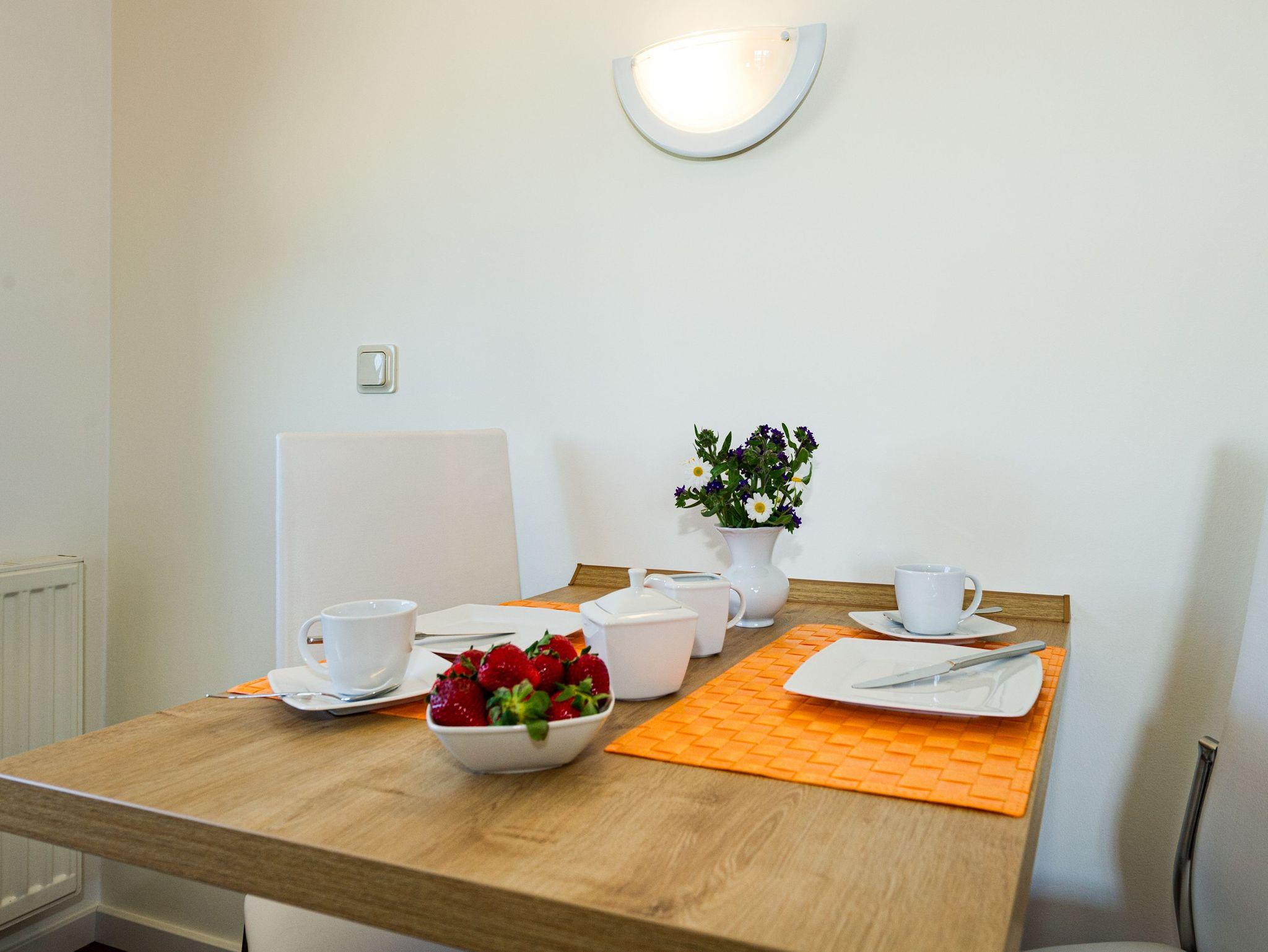 Im Wohnraum befinden sich eine bequeme Sitzcouch mit Tisch und ein modernes Flachbild-TV-Gerät. Hier befindet sich ein Esstisch mit Sitzgelegenheiten. Die moderne offene Küchenzeile ist mit einem Herd, Backofen, Spülmaschine, Wasserkocher, Kaffevollautomat, Toaster und Kühlschrank sowie jeweiliges Zubehör komplett ausgestattet.