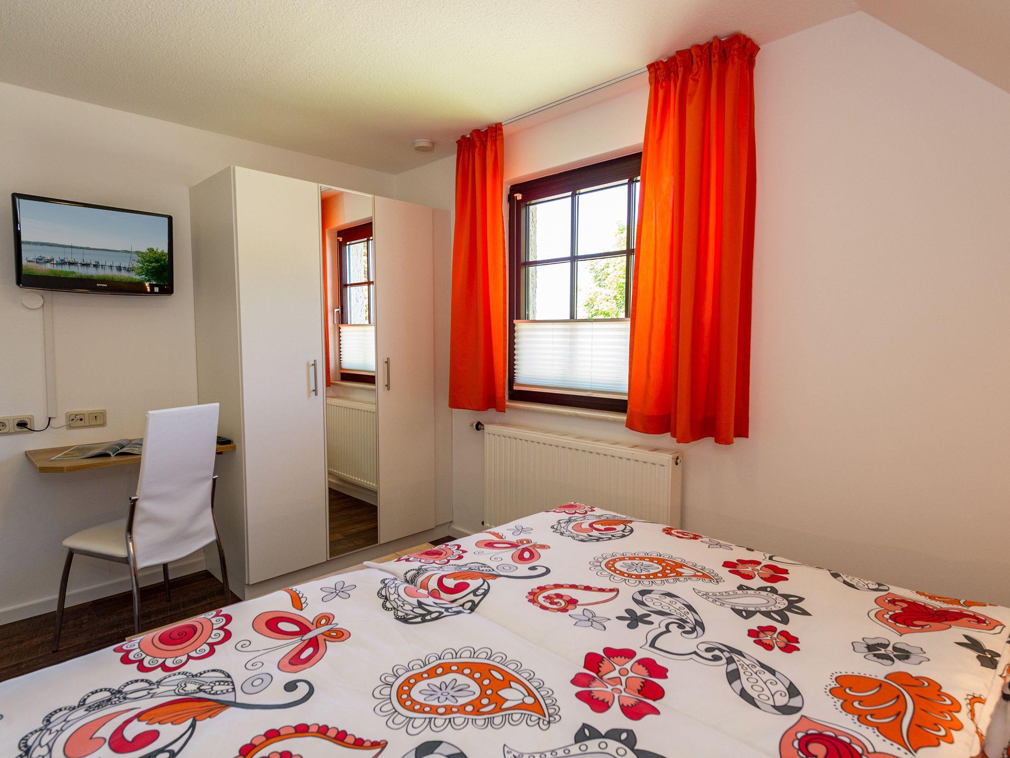 Im Schlafzimmer stehen ein Schreibtisch, ein bequemes Doppelbett mit Nachtschränken und Leselampen sowie ein dreitüriger Kleiderschrank mit Spiegel. Das Schlafzimmer verfügt darüber hinaus auch über ein modernes Flachbild-TV-Gerät. Gegen Aufpreis je Gast liegen für Sie frische Handtücher bereit und sind die Betten bereits mit Bettwäsche bezogen. Das Bad ist mit Dusche, WC und Waschtisch ausgestattet.