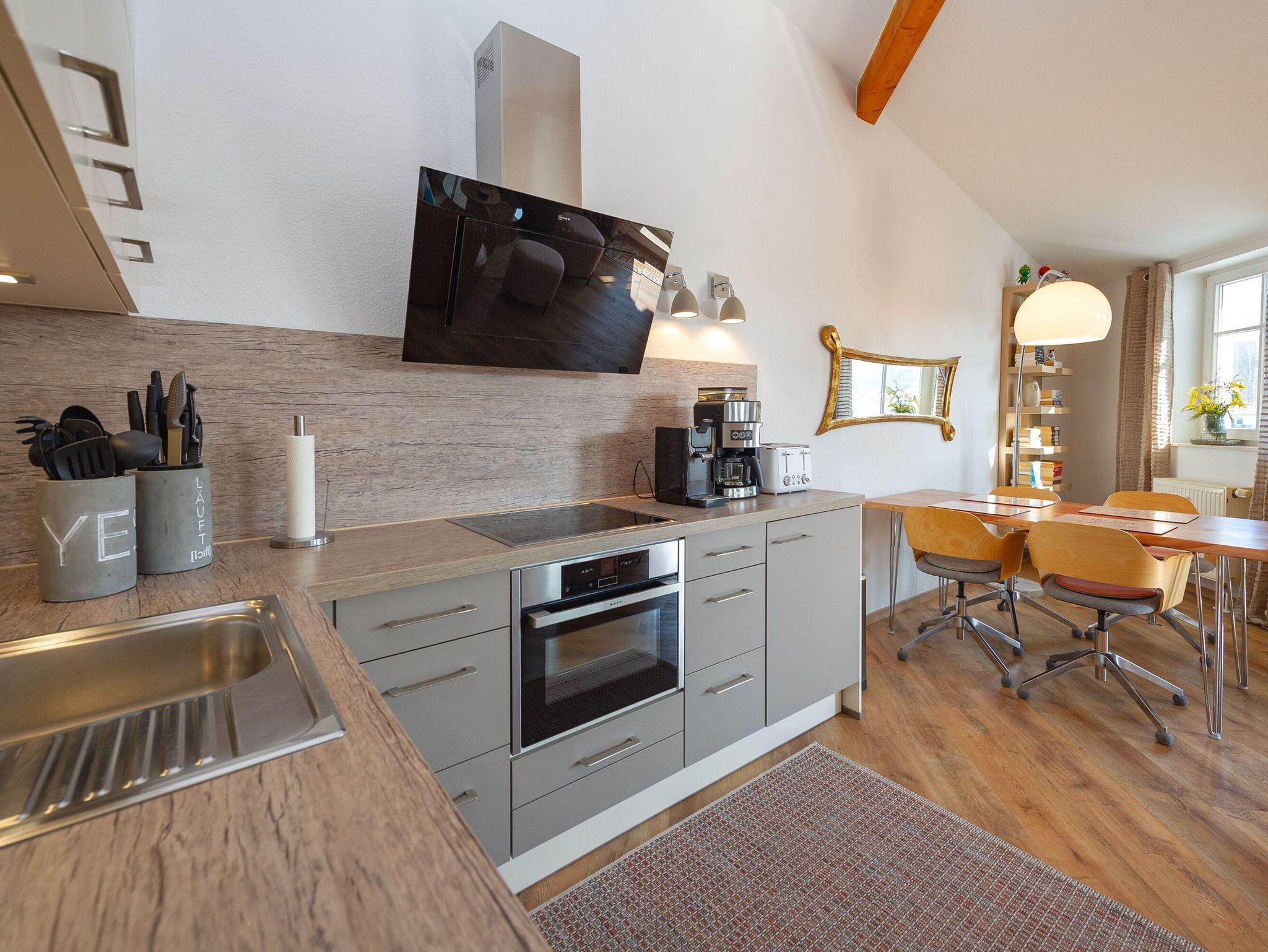 Voll ausgestattete Küche mit multifunktionalem Backofen, integrierter Mikrowellenfunktion, Pad- und Filterkaffeemaschine und vieles mehr. ideal für entspannte Mahlzeiten