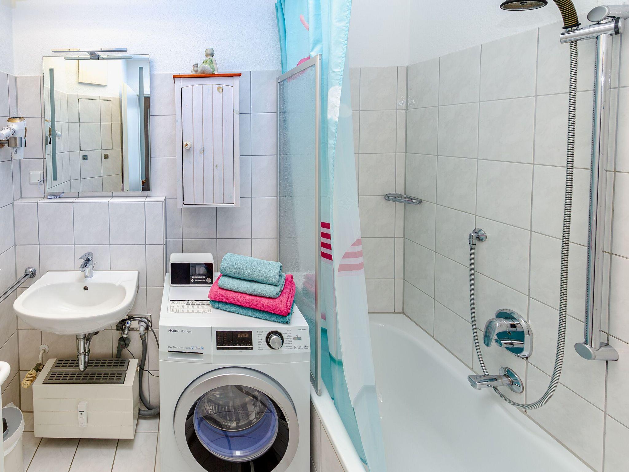 Helles Bad mit Oberlicht, Badewannen-Duschkombination, Waschmaschine, WLAN-Radio dazu ein separates WC für noch mehr Komfort
