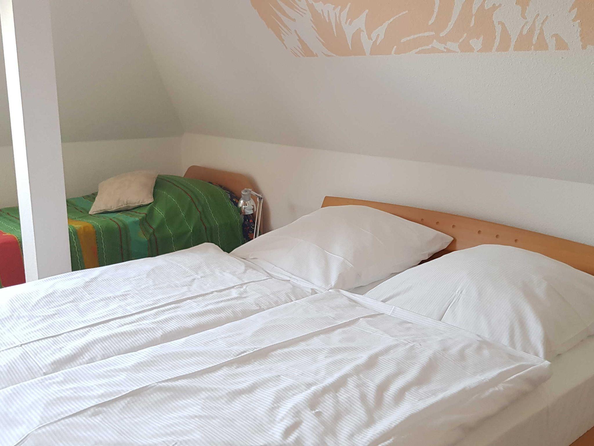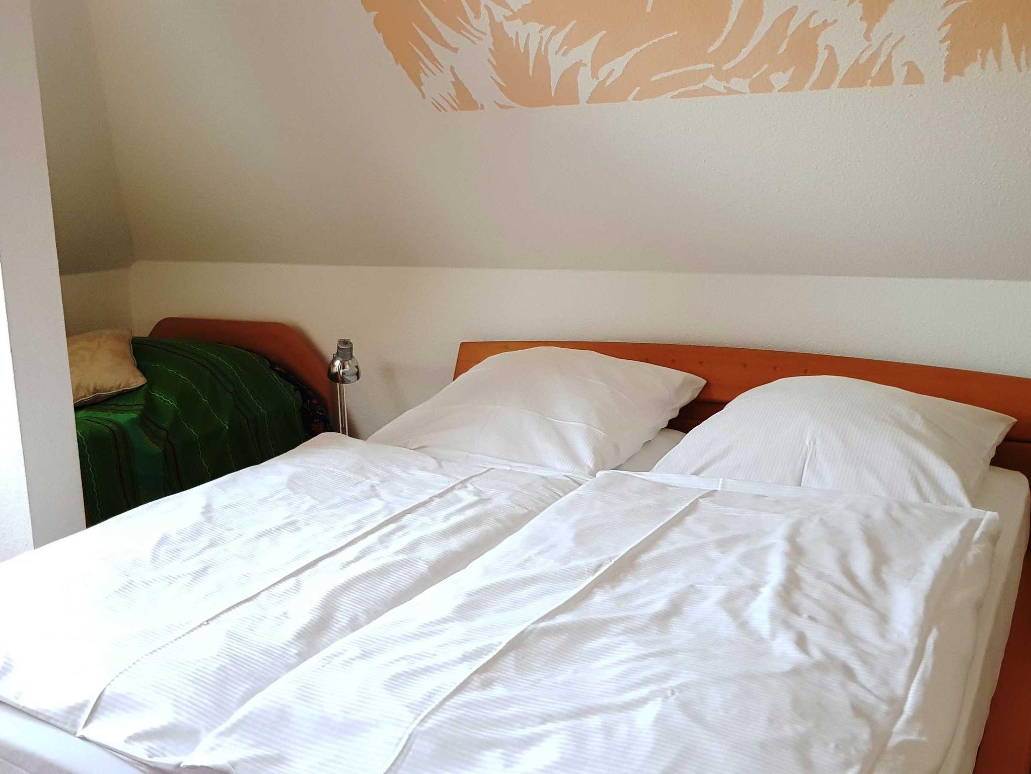 Das Schlafzimmer befindet sich im Dachgeschoss, welches über eine Spartreppe erreichbar ist.