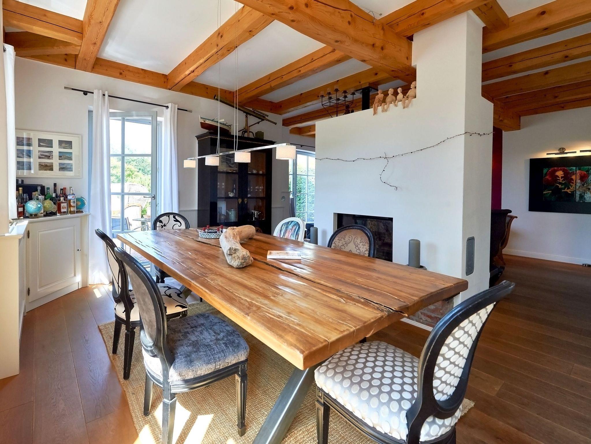 Im Essbereich erwartet Sie ein großer Esstisch für 6 - 8 Personen aus urwüchsiger Mooreiche, der mit den Designerbezügen der alten Kaffeehausstühle angenehm kontrastiert.