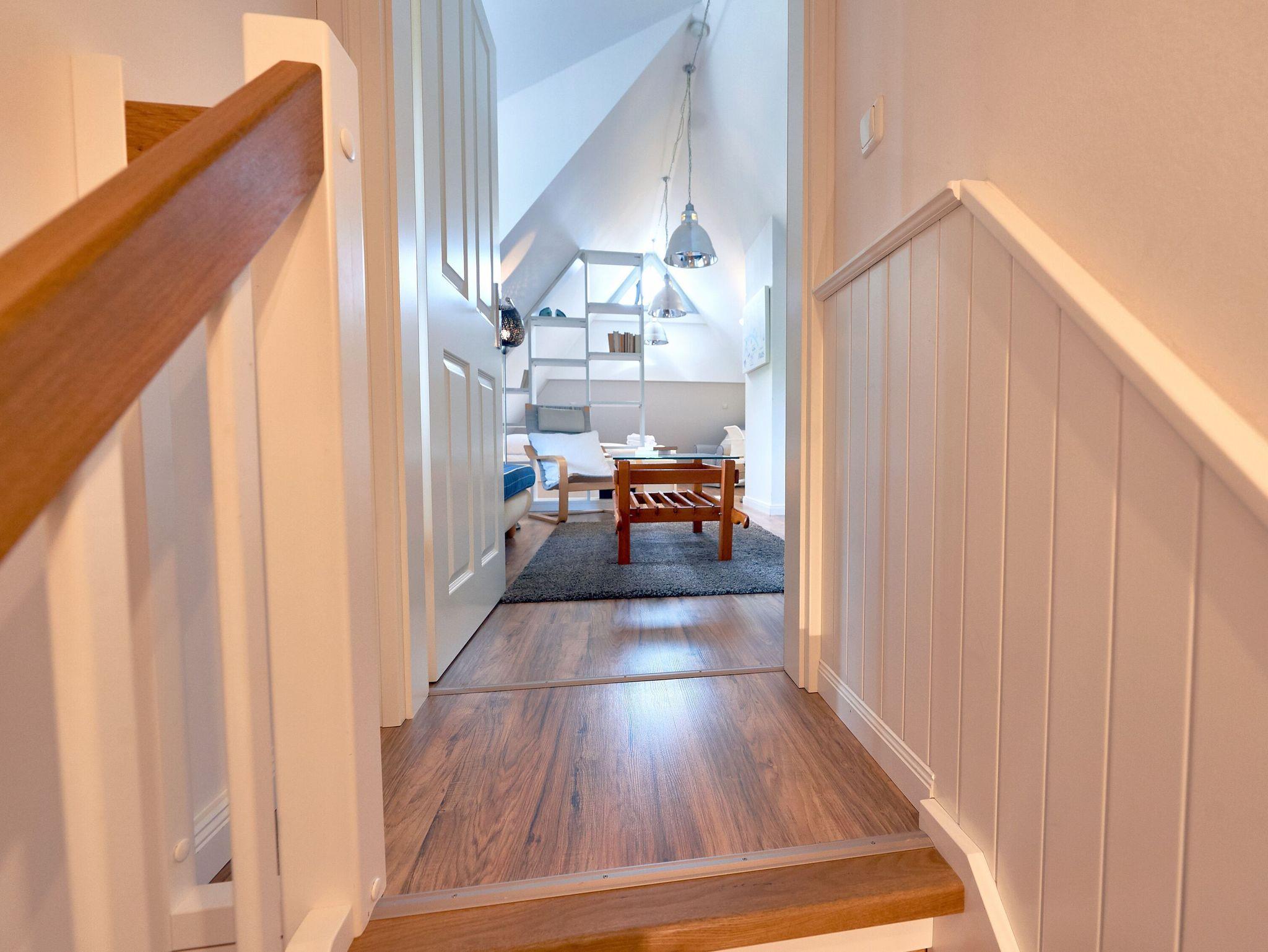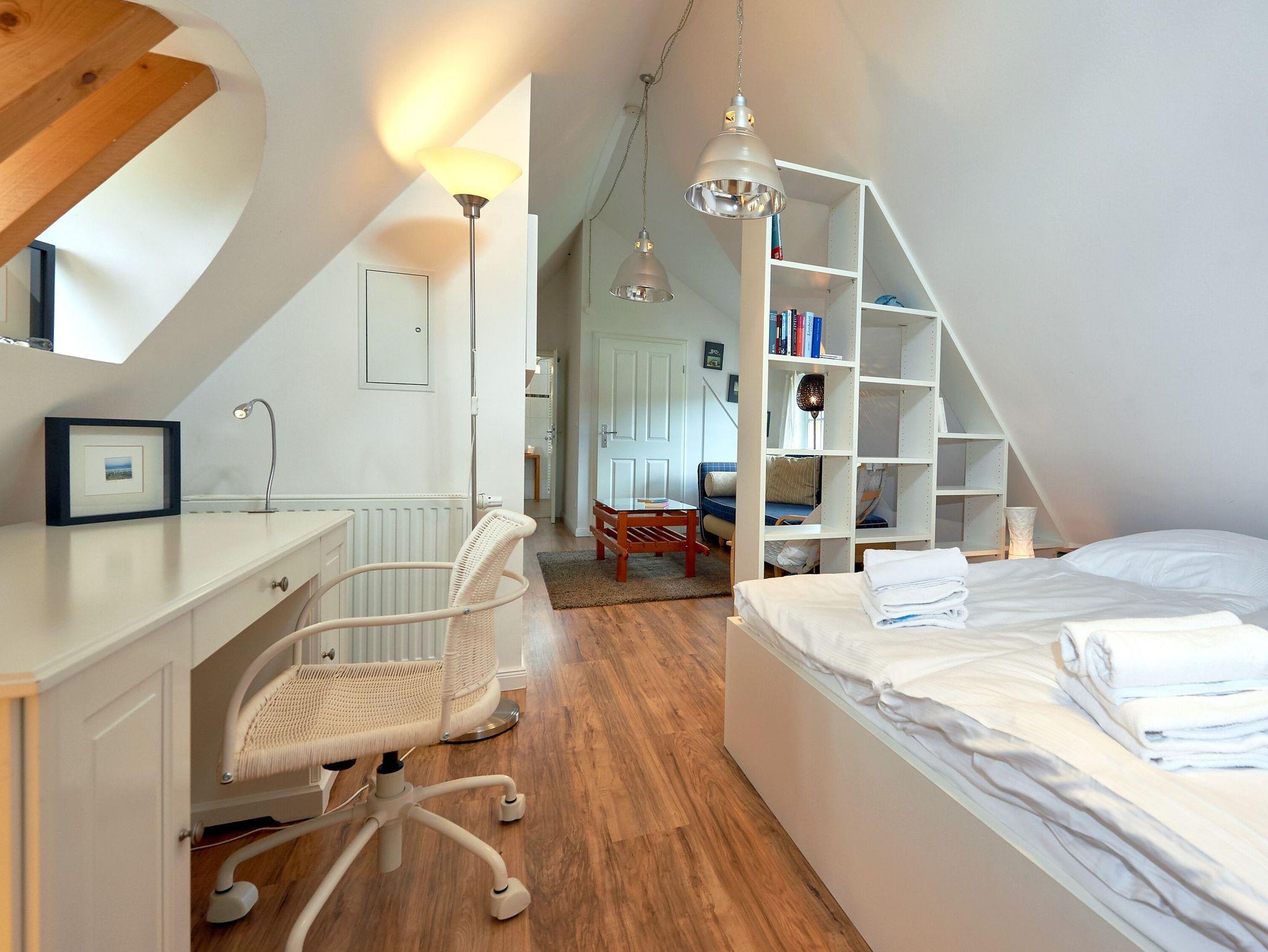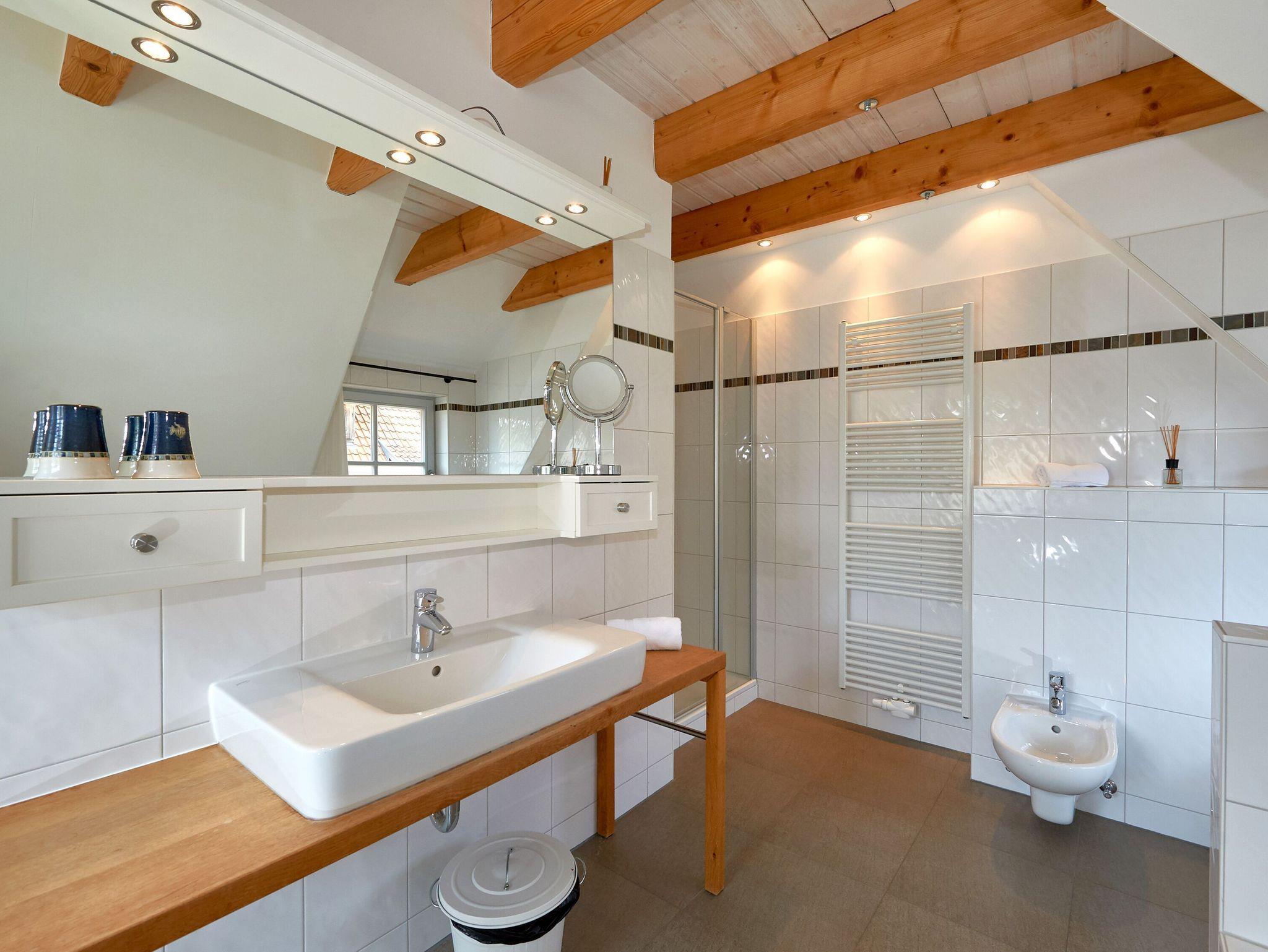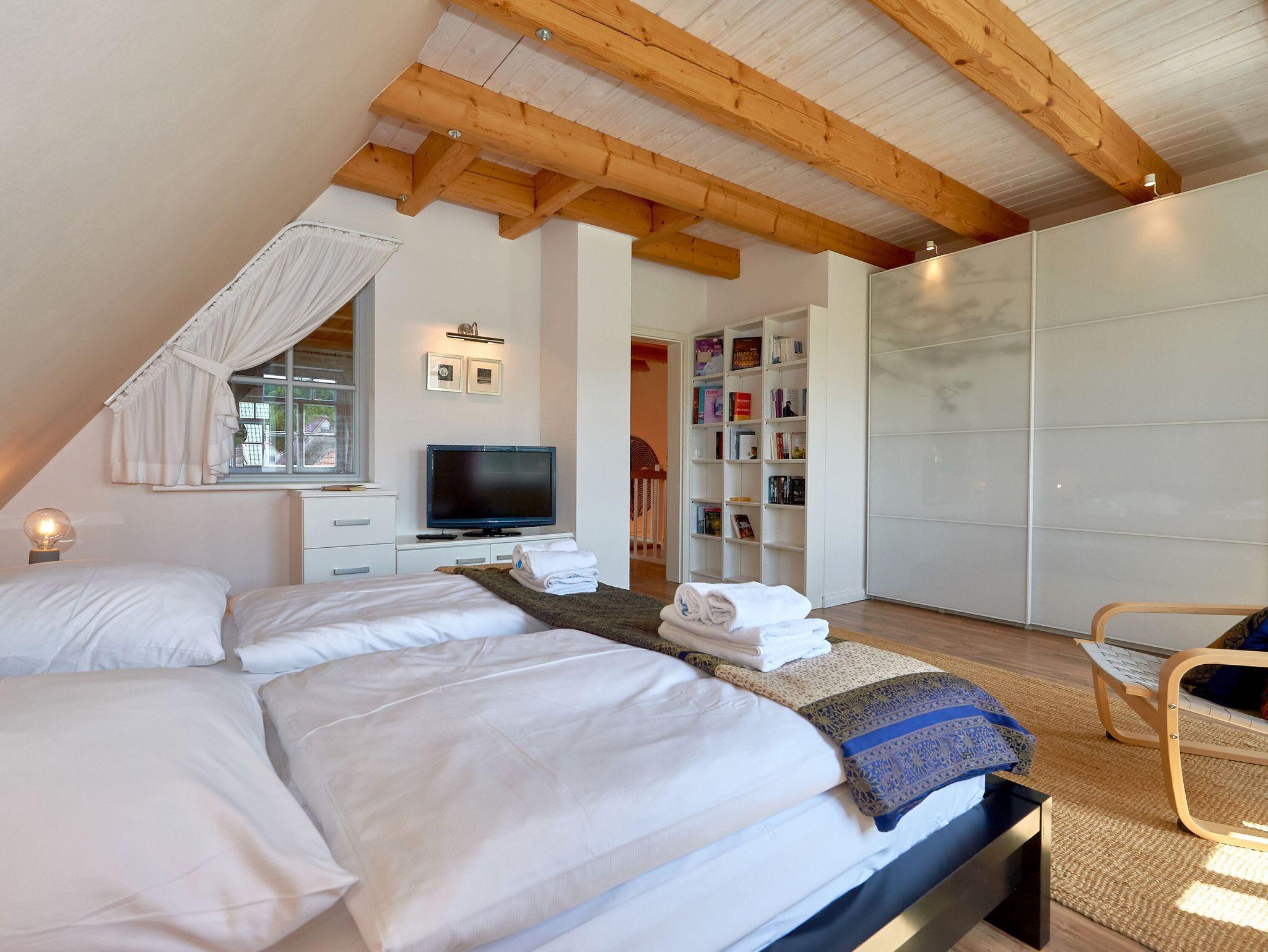 Im mit Laminat ausgelegten Obergeschoss befindet sich das große Schlafzimmer mit zwei Einzelbetten, die zu einem Doppelbett (200 x 200 cm) zusammen gestellt wurden. Ein Flachbild-TV, ein großer Kleiderschrank sowie das angrenzende großzügige Badezimmer mit Dusche, WC, Bidet, Handtuchheizung, Badewanne und mit einem schönen Blick zur Having gehören ebenfalls dazu.