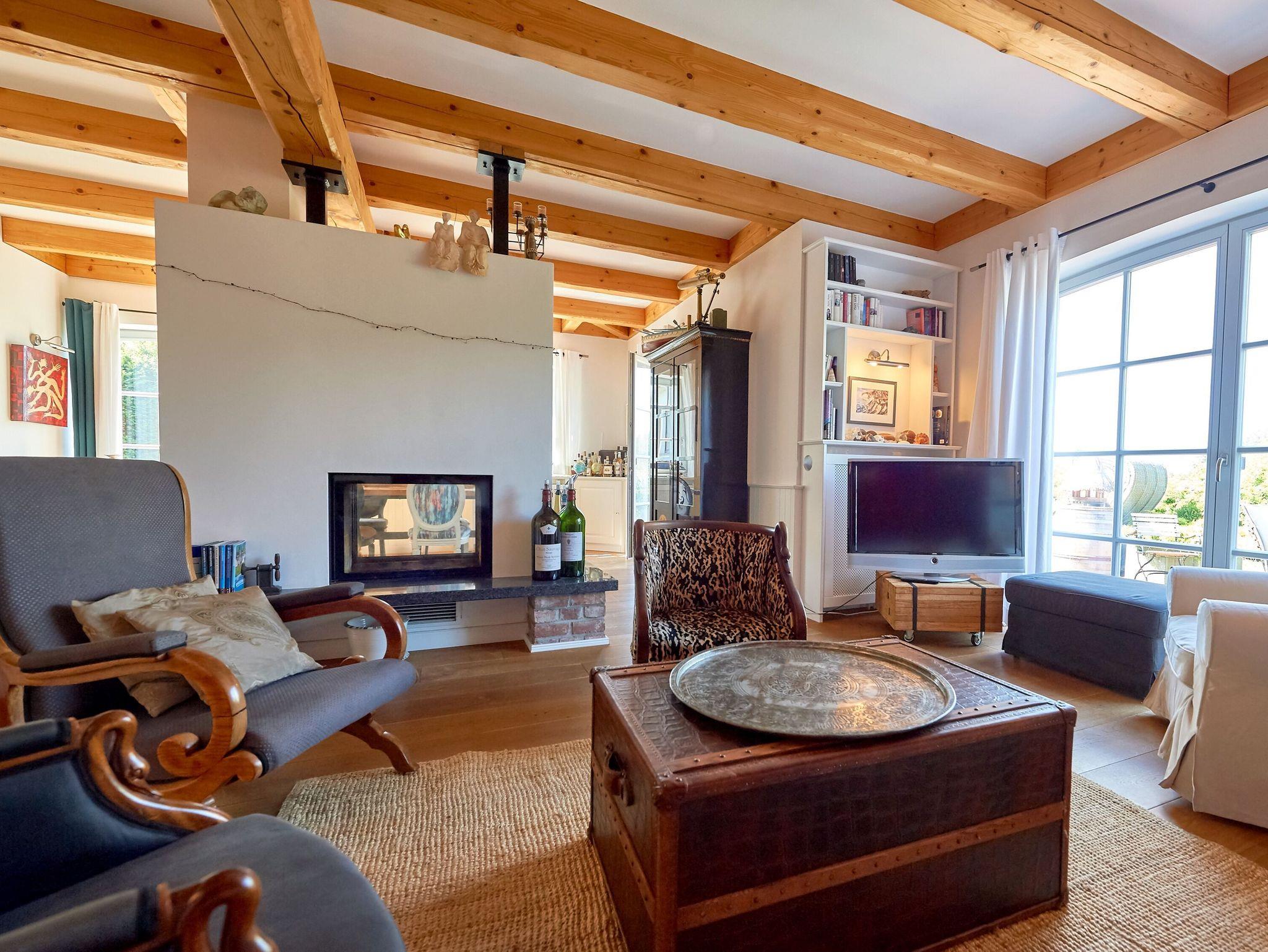 Das ca. 50 m² große Wohn-/Esszimmer mit der angrenzenden offenen Küche (auch mit einer stilvollen Schiebetür verschließbar) besticht durch die großzügigen Ausmaße unter gemütlichen Holzbalken und den Kamin. Der Wohnbereich mit der bequemen Couch und den vier Sesseln in verschiedenen Stilrichtungen wirkt durch eine wunderschön rot-gewachste Wand besonders edel und ist durch den zweiseitig verglasten Kamin als Raummittelpunkt optisch vom Esszimmerbereich getrennt. Kaminholz ist ebenso vorhanden wie eine Stereoanlage mit CD-Player. Ein in schwarzem Schellack ausgeführter Vitrinenschrank im Empirestil bildet den Übergang zum Essbereich.