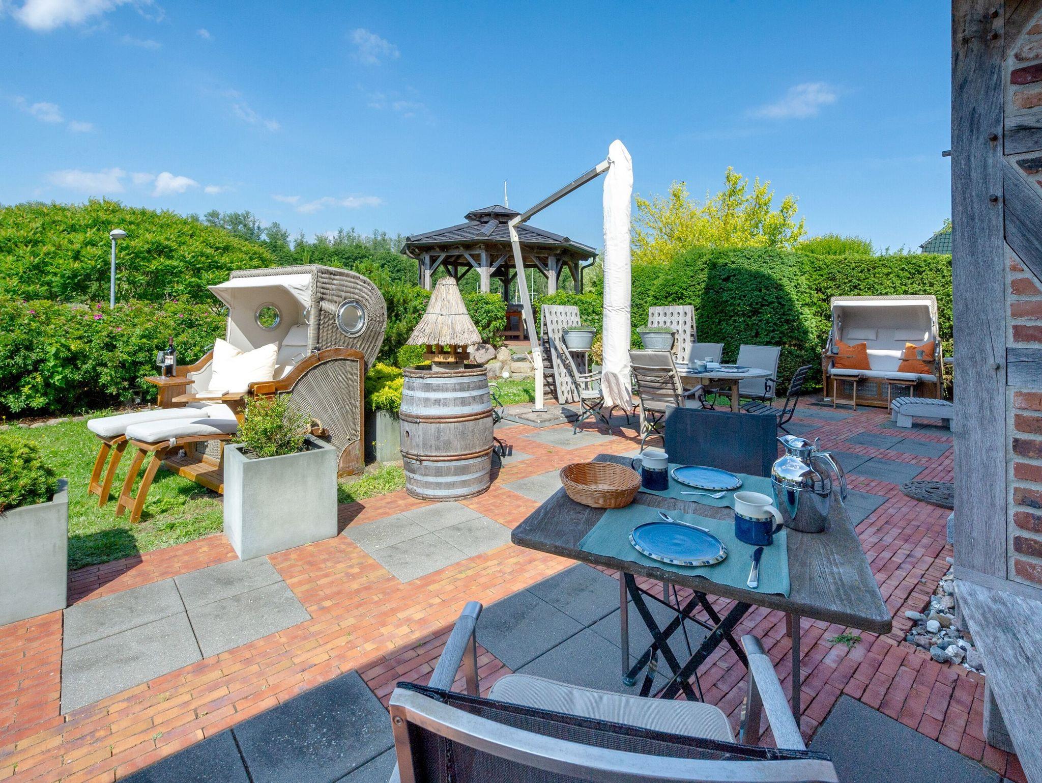 Sonnenliegen und eine Sitzgruppe auf der Terrasse nach Südwesten führen die sehr gute Ausstattung auch im Außenbereich fort und bieten die Möglichkeit, sich rundum wohl zu fühlen. Ein erhöhter Pavillon im Vorgarten mit einer Grillecke und einem herrlichen Ausblick über das verträumte Fischerdörfchen und auf die Having vervollkommnen dieses Arrangement.