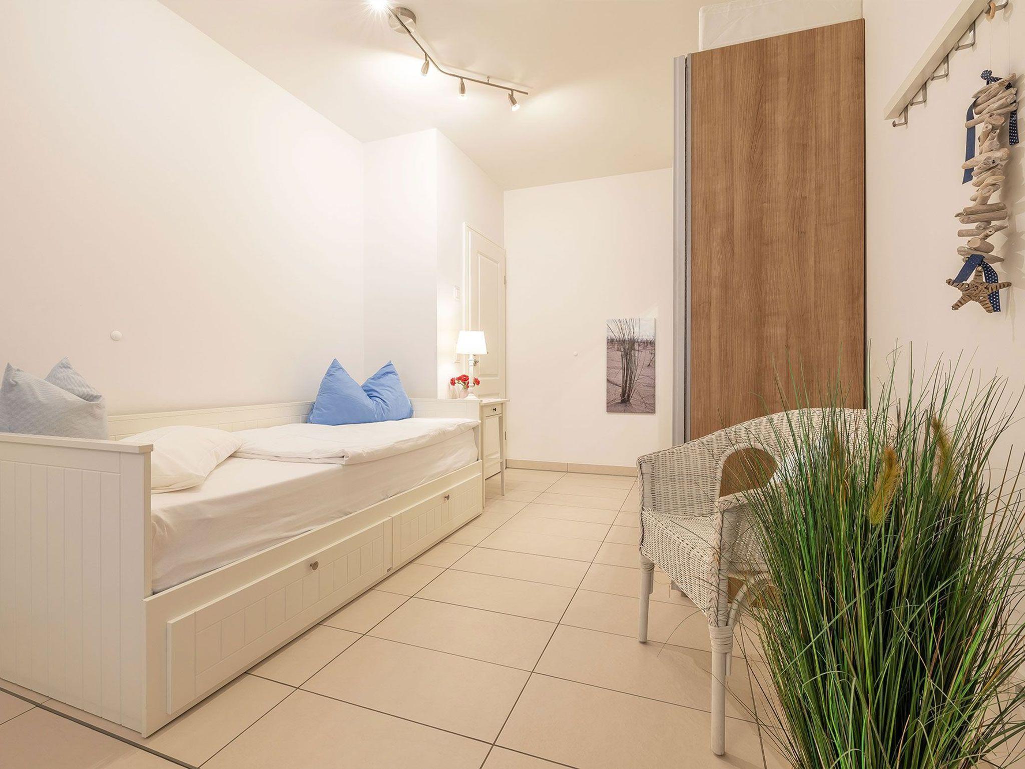 Das Schlafzimmer überzeugt mit einem komfortablen Doppelbett (180x200 cm), sowie einem zusätzlichen Einzelbett (Möglichkeit zur Aufbettung, ausziehbar auf 140x200 cm). Für einen erholsamen Schlaf und einen guten Start in den Tag, haben Sie die Möglichkeit durch Plissees und Rollladen das Zimmer zu verdunkeln.