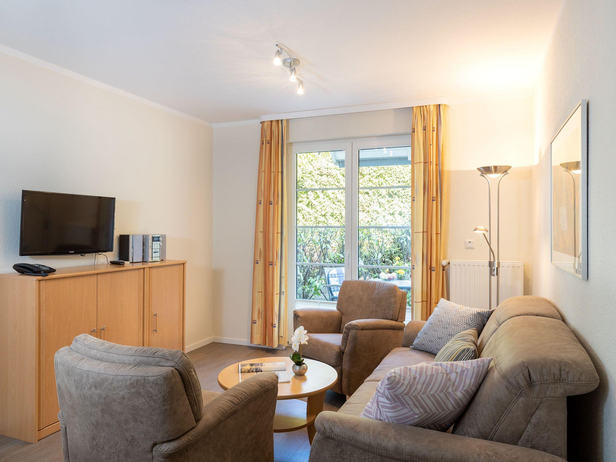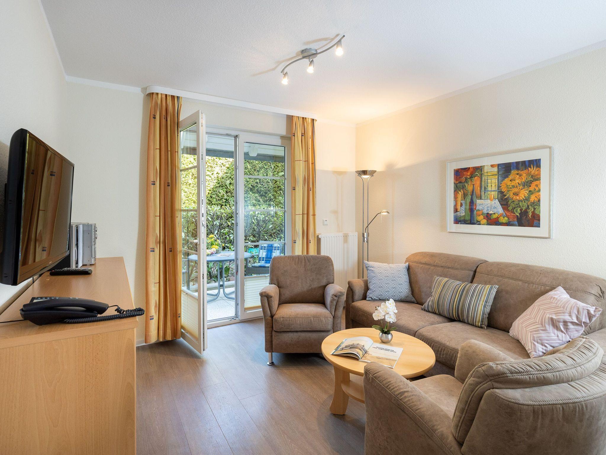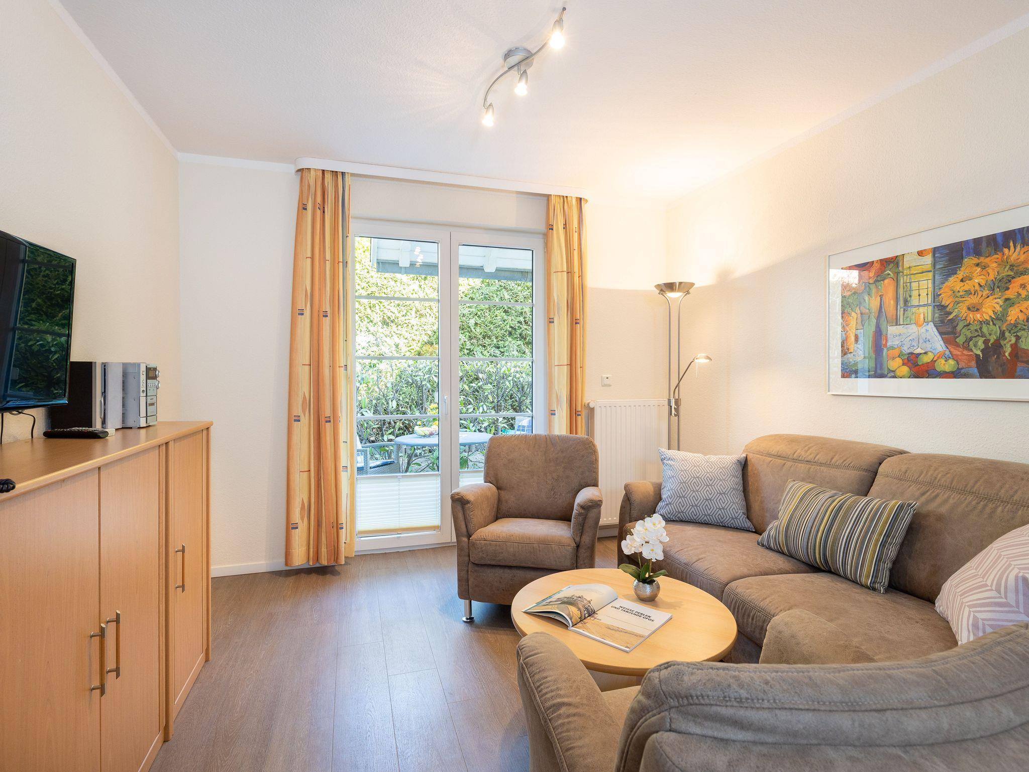 Das helle Wohnzimmer verfügt über eine Couchgarnitur, einen TV und einem kostenfreien WLAN-Zugang. Zudem erreichen Sie von hier aus die sonnige Terrasse inkl. Terrassenmöbel.