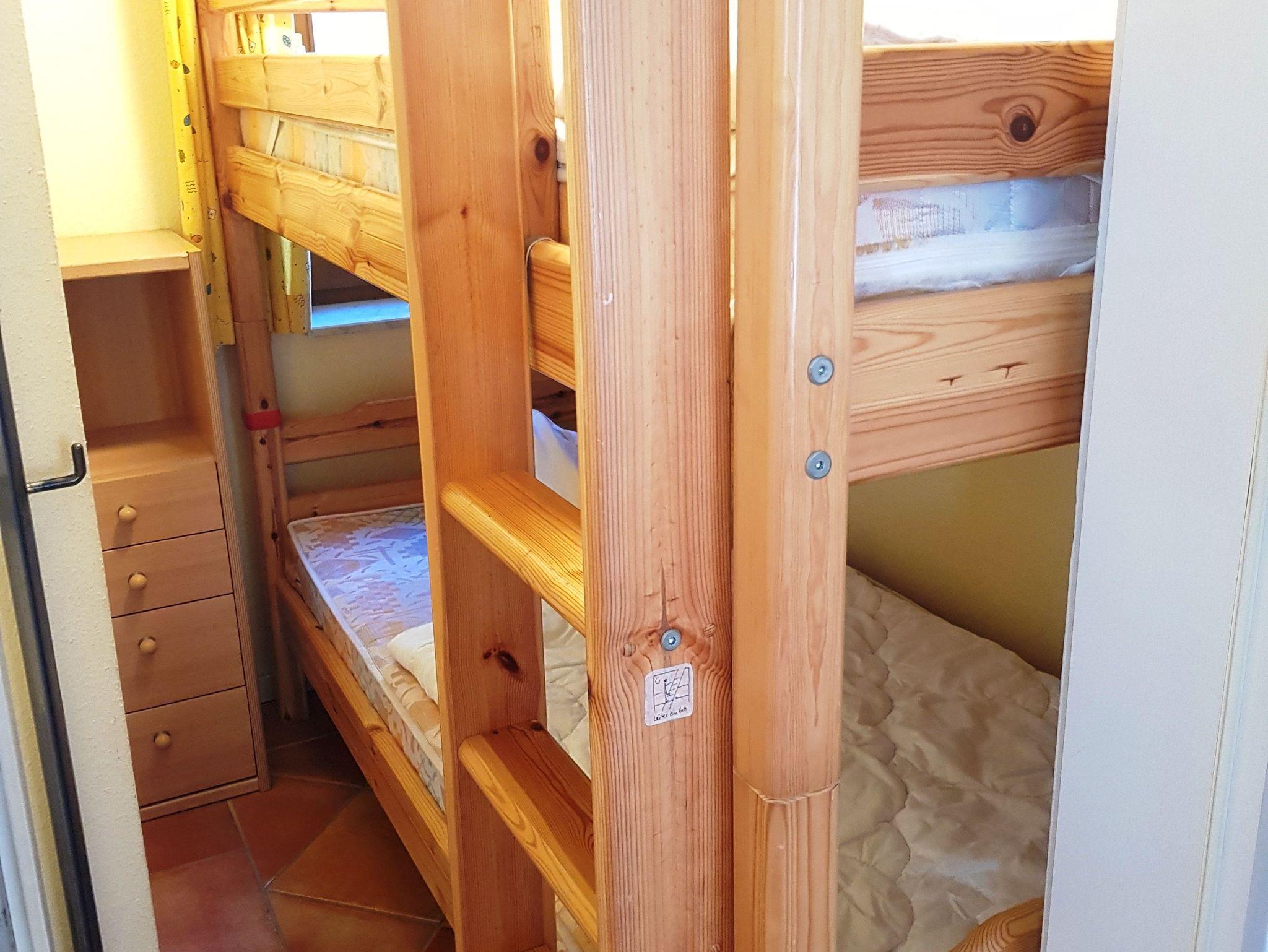 Das erste Schlafzimmer ist mit einem Doppelbett sowie einem großzügigen Kleiderschrank ausgestattet. Das zweite Schlafzimmer ist eine Koje für Kinder mit Etagenbett und einem Fenster.