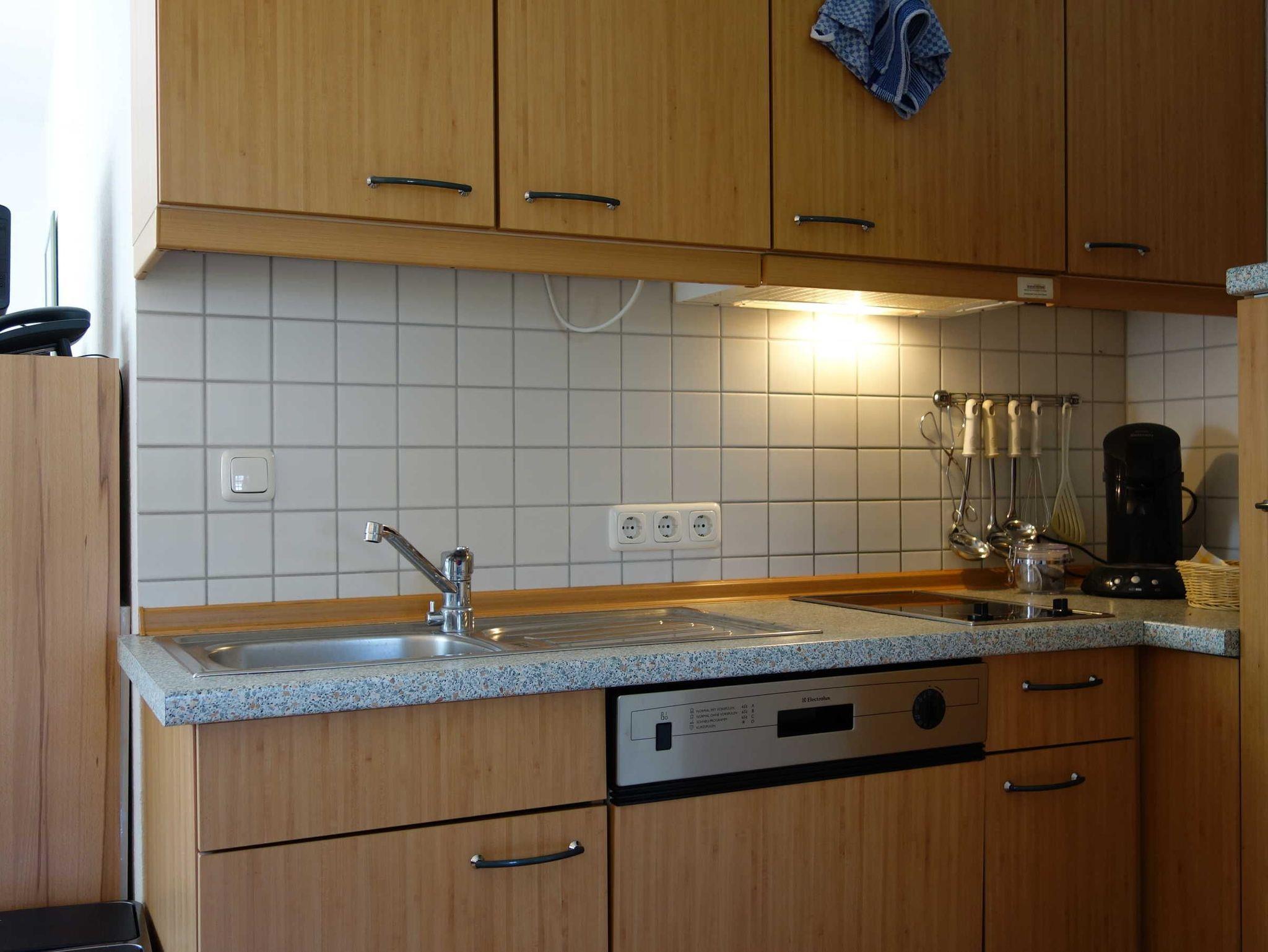 Die Küchenzeile ist komplett ausgestattet mit Mikrowelle, Geschirrspüler und Kühlschrank mit Gefrierfach. Alle nötigen Küchenutensilien, sowie ausreichend Besteck sind selbstverständlich auch vorhanden.