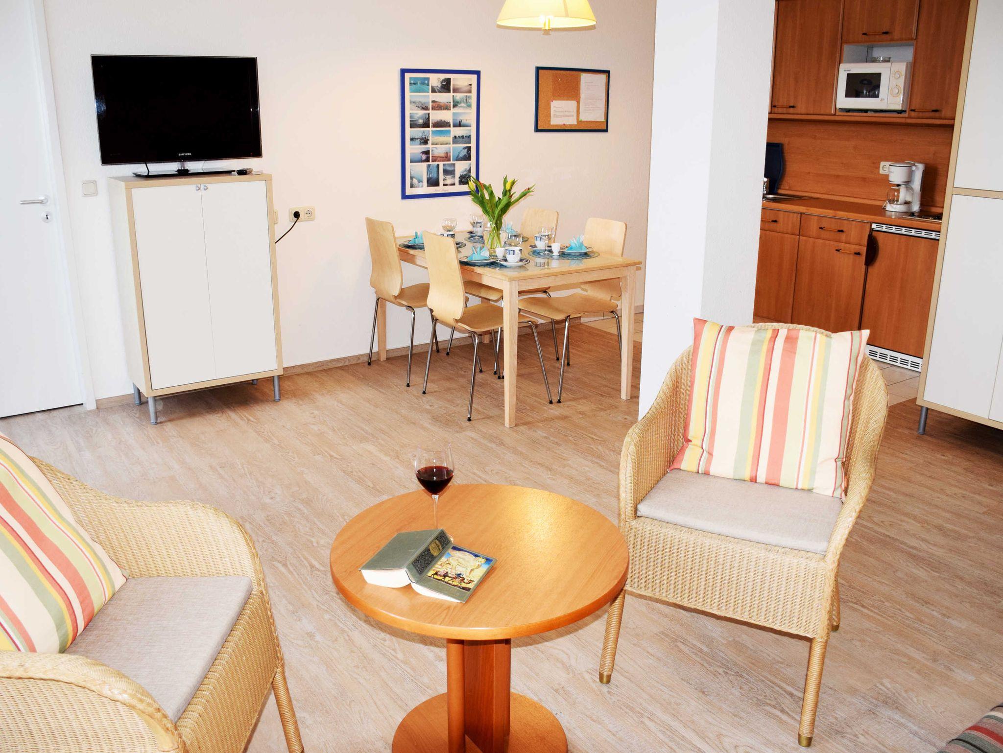 Im Wohnraum stehen eine Sitzgruppe und ein Flachbild-TV zur Verfügung. Vom Wohnzimmer aus gelangen Sie auch auf den schönen Balkon mit Sitzgelegenheiten. Die Sitzgruppe kann für zwei Gäste aufgebettet werden. Im Schlafzimmer stehen ein bequemes Doppelbett mit Nachttischen und Leselampen sowie ein Kleiderschrank. Die Küchenzeile ist mit Herd, Wasserkocher, Kaffeemaschine, Mikrowelle, Toaster und Kühlschrank ausgestattet.