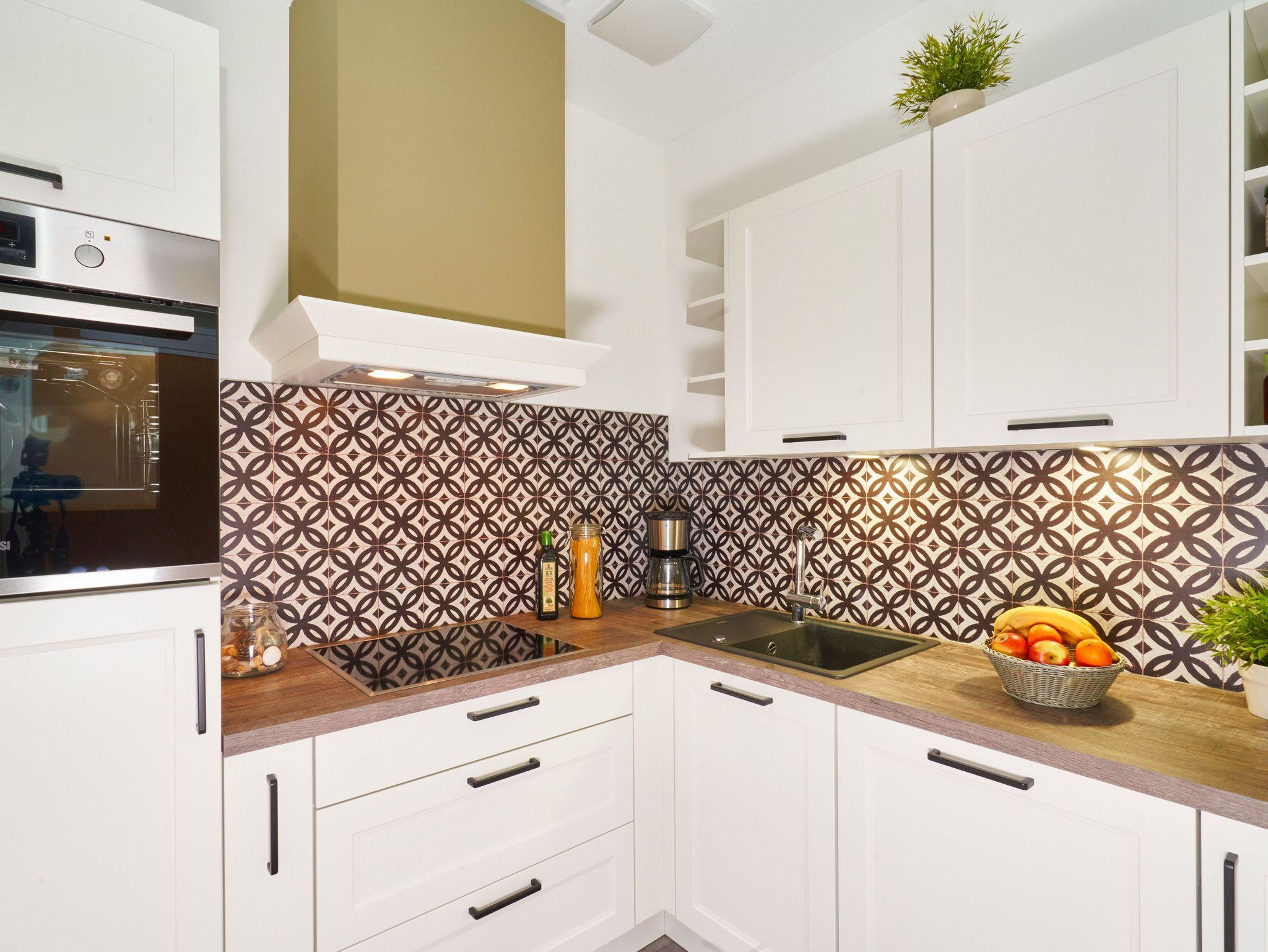Die Küche im hinteren Bereich ist voll ausgestattet und ermöglicht somit die Zubereitung leckerster Speisen. Dank Cerankochfeld, Backofen, Dunstabzugshaube, Kühlschrank mit Gefrierfach uvm. lässt sich kochen, backen und aufbewahren.
