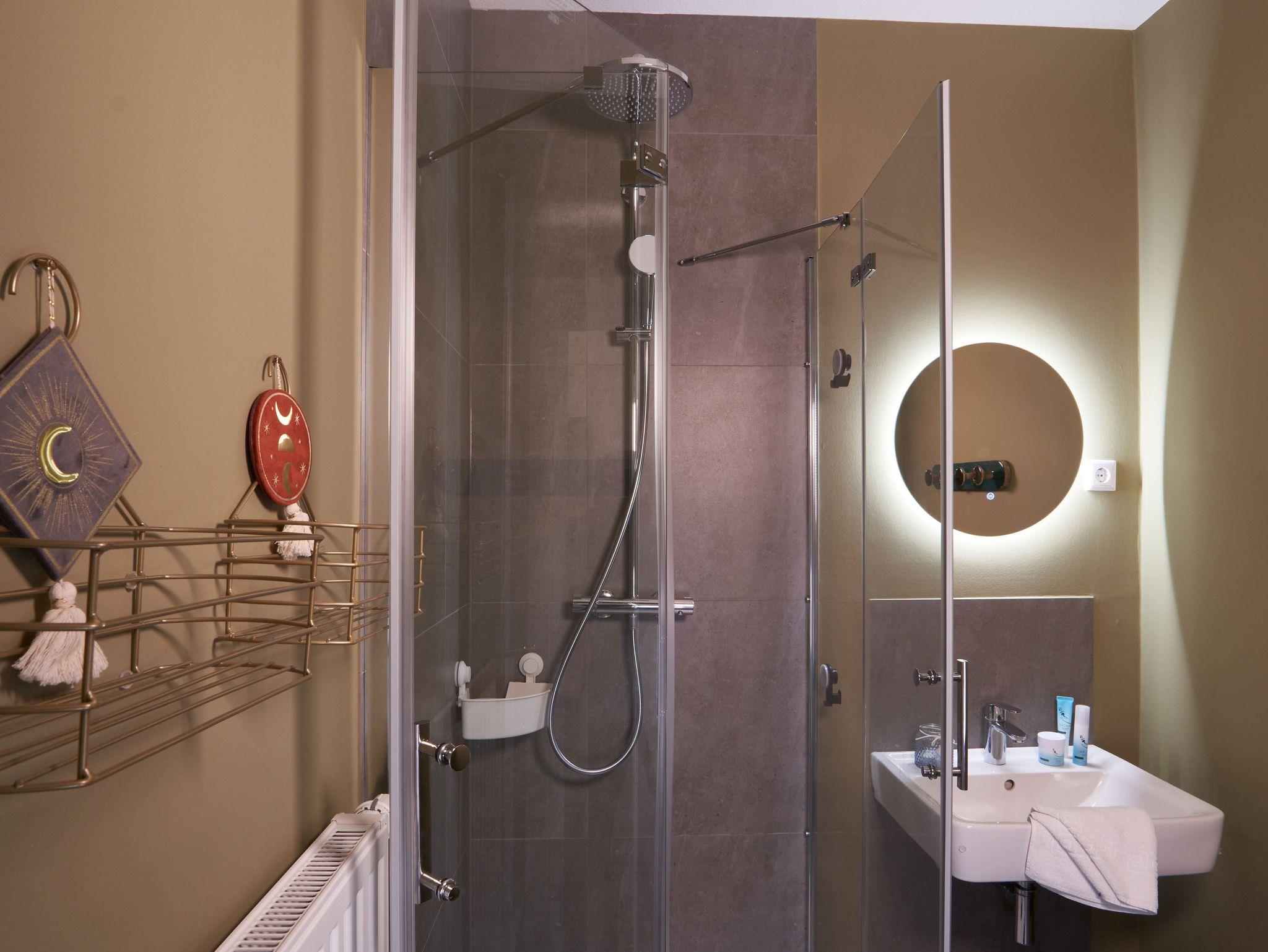 Ein helles Duschbad mit Regendusche und WC, sowie ein kleineres WC mit Handwaschbecken runden die Einrichtung dieses komfortablen Appartements ab.