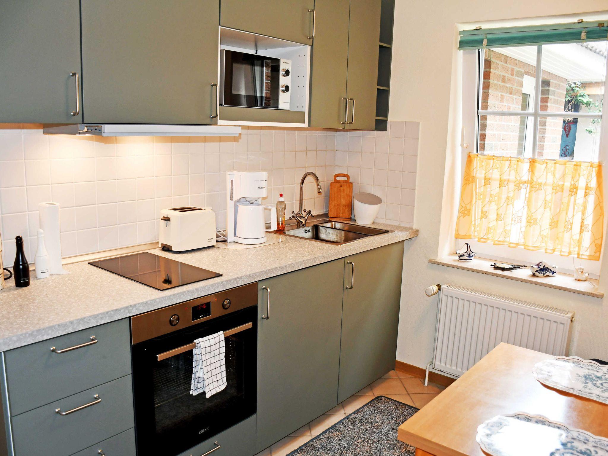Die moderne Küche ist mit einem Herd, Abzugshaube, Wasserkocher, Kaffeemaschine, Toaster und Kühlschrank komplett ausgestattet.