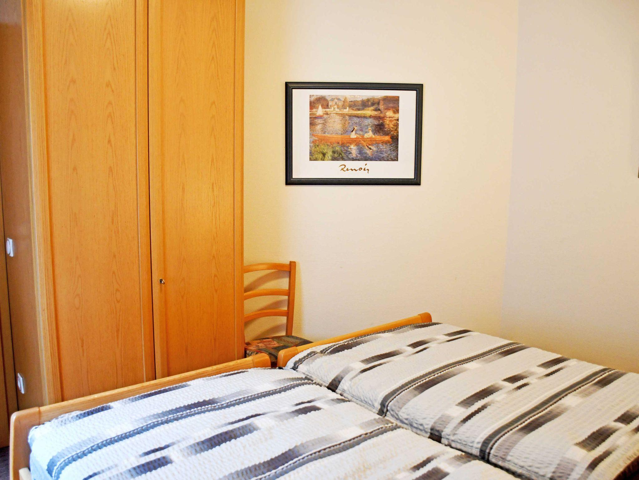 Das Schlafzimmer ist mit einem bequemen Doppelbett mit Nachttischen und Leselampen sowie einem Kleiderschrank ausgestattet.
