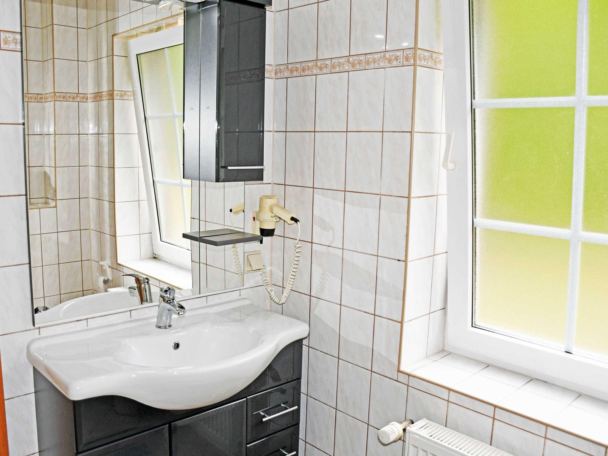 Das moderne Bad ist mit Dusche, WC und Waschtisch ausgestattet und verfügt über Tageslicht.