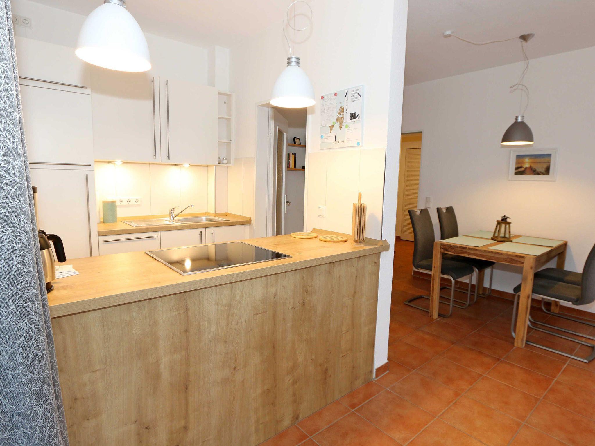 Die ausgestattete 2-Raum-Nichtraucher-Wohnung im 1. OG des ?Haus Holstein? liegt am erweiterten Kurpark, direkt am Friedensberg mit hervorragender Wohnqualität und verfügt über ca. 63 qm Wohnfläche. Der geräumige Flur ist mit einer Garderobe sowie einem integrierten Abstellraum ausgestattet. Der 13 qm große und überdachte Balkon (Süden) mit Komfort-Bestuhlung und Sonnenliege ist vom Wohnbereich aus begehbar. Die Wohnung ist für 2 bis max. 4 Erwachsene ausgestattet und besteht aus einem Wohnbereich mit einer Couch (Aufbettung für 3./4. Person, 1,50 m x 2,00 m), massivem Couchtisch, einem Funktions-Sessel, einer Stehlampe sowie einer Vitrine. Der technische Bereich wird durch einen LED-TV, einen DVD-Player, einer Mini-Stereo-Anlage mit Bluetooth und USB-Anschluss sowie Internet (WLAN) abgerundet. Der Internetzugang (WLAN) ist für Sie inklusive. Die großzügige Essecke umfasst einen massiven Vollholz-Tisch und vier dazugehörige Stühle. Die angrenzende und offene Küchenzeile bietet Ihnen einen Kühlschrank mit Gefrierfach, einen Backofen mit 4 Zonen Induktionskochfeld, einen Geschirrspüler, einer Mikrowelle, einer Kaffeemaschine, einen Toaster, einen Eierkocher, einen Handmixer, einen Wasserkocher sowie viele kleine Küchenutensilien. Im Schlafzimmer befindet sich ein Doppelbett (1,80 m x 2,00 m) mit einer Komforthöhe über 60 cm, Kaltschaum-Wendematratzen H2/H3, zwei Nachttischablagen und einen großen Kleiderschrank. Ein großer Ganzkörperspiegel rundet den Raum ab. Das innenliegende Bad ist mit einem Waschplatz mit beleuchtetem Spiegel, einer Dusche mit flachem Einstieg, Fön, WC, Handtuchhalter sowie einer Waschmaschine versehen. Im Abstellraum finden Sie kleine Helfer wie einen Staubsauger, ein Bügeleisen mit Bügelbrett und einen Wäscheständer für den Balkon. Alle Räumlichkeiten sind in der Wohnung gefliest und haben jeweils ein Insektenschutzgitter. Haustiere sind nicht erlaubt. Ein überdachter PKW-Stellplatz Nr. 12 (max. 2 m Höhe) befindet sich direkt unterm Haus. Im Gemeinschaftskeller stehen Ihnen eine Münzwaschmaschine und ein Münztrockner zur Verfügung. Abstellmöglichkeiten für Fahrräder sind gegeben. Die Erstausstattung eines Wäschepaketes (komplette Bettwäsche, 1 Duschhandtuch, 1 kleines Handtuch) können Sie bis 14 Tage vor Anreise gegen einen Aufpreis dazu buchen oder durch eigene ergänzen. Ab 2 gebuchten Paketen erhalten Sie einmalig 1 Geschirrhandtuch und 1 Duschvorleger hinzu.