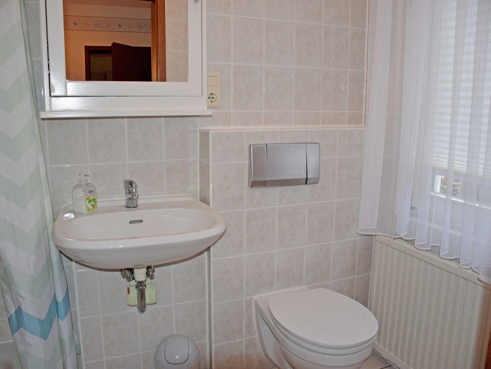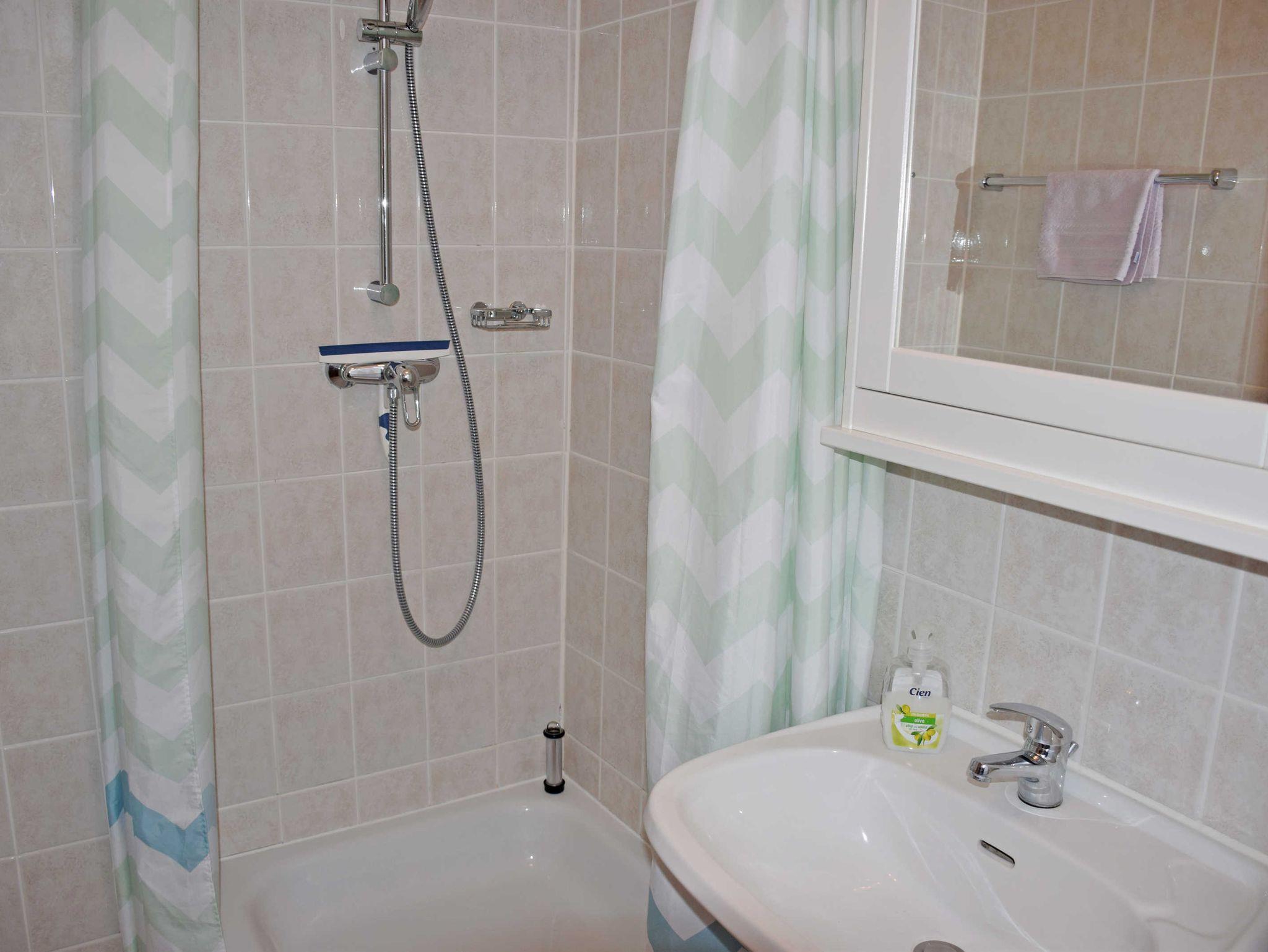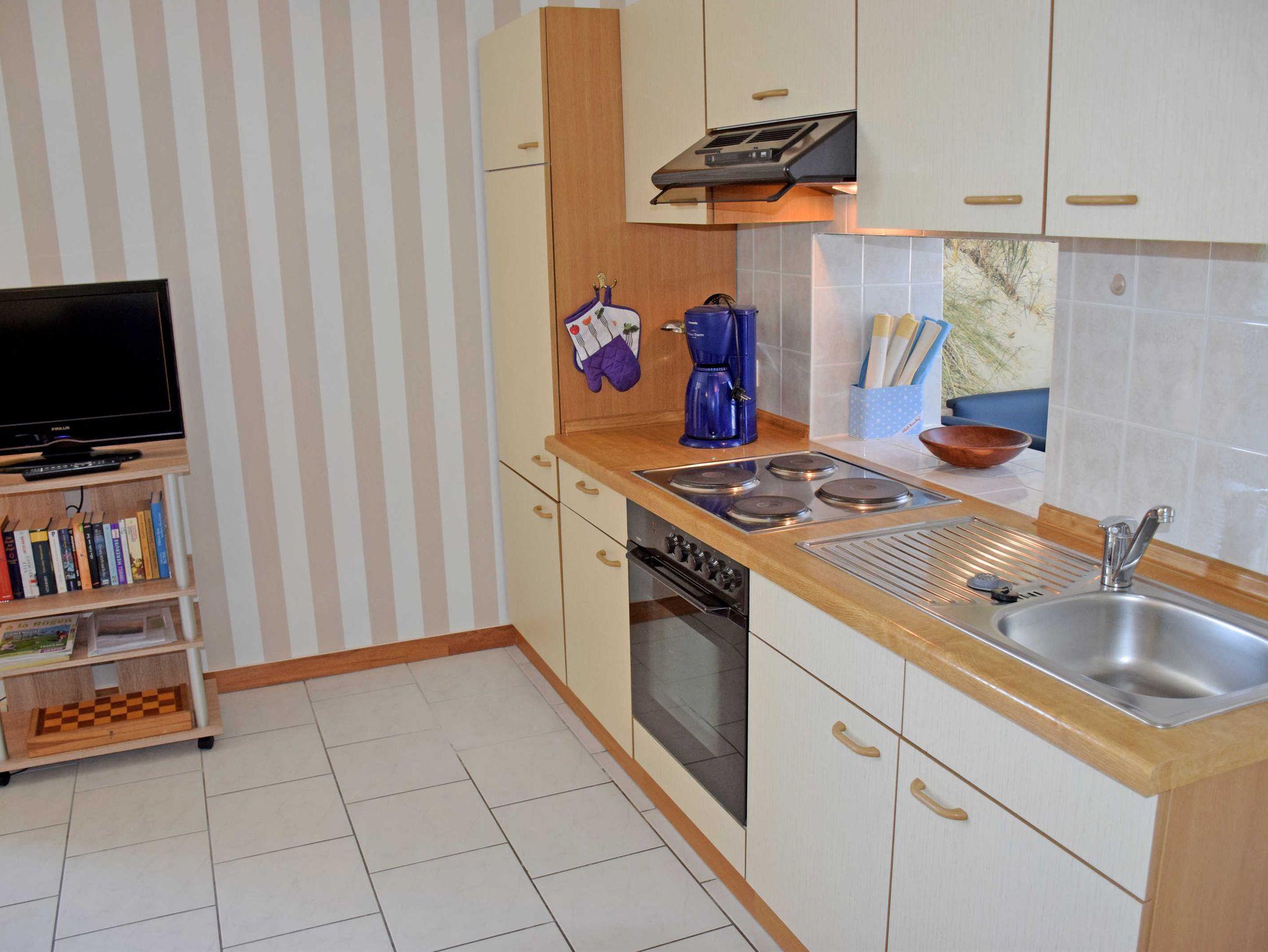 Die Küchenzeile ist mit einem Herd, Abzugshaube, Backofen, Wasserkocher, Kaffeemaschine, Toaster und Kühlschrank komplett ausgestattet. Das moderne Bad ist mit Dusche, WC und Waschbecken ausgestattet.