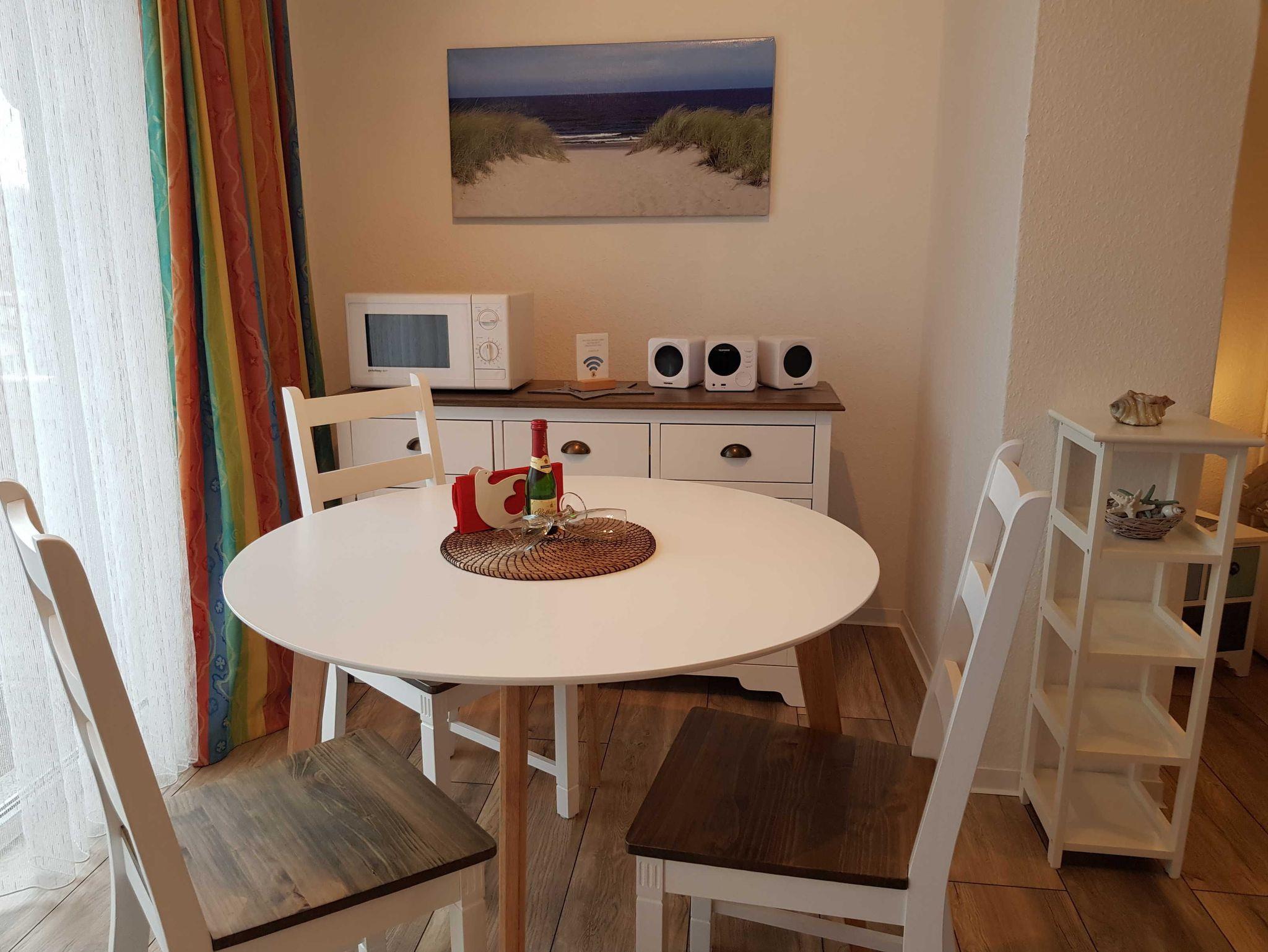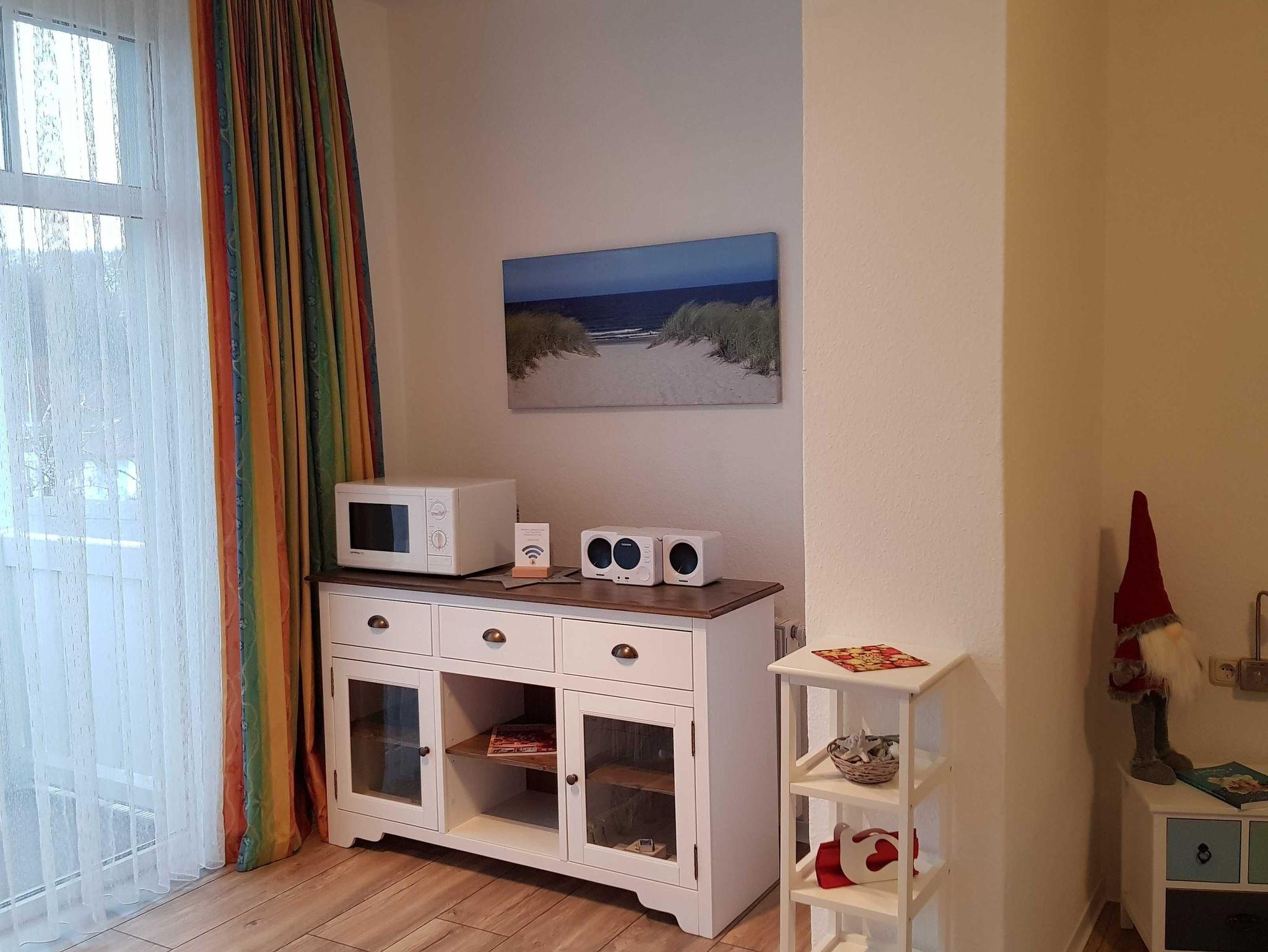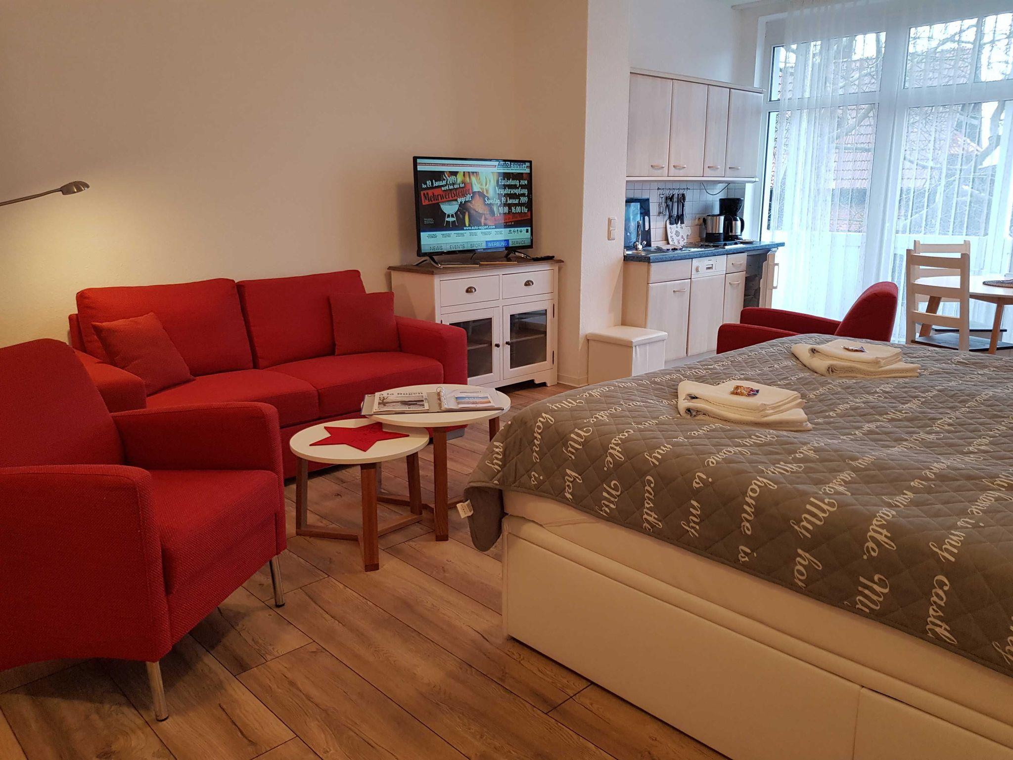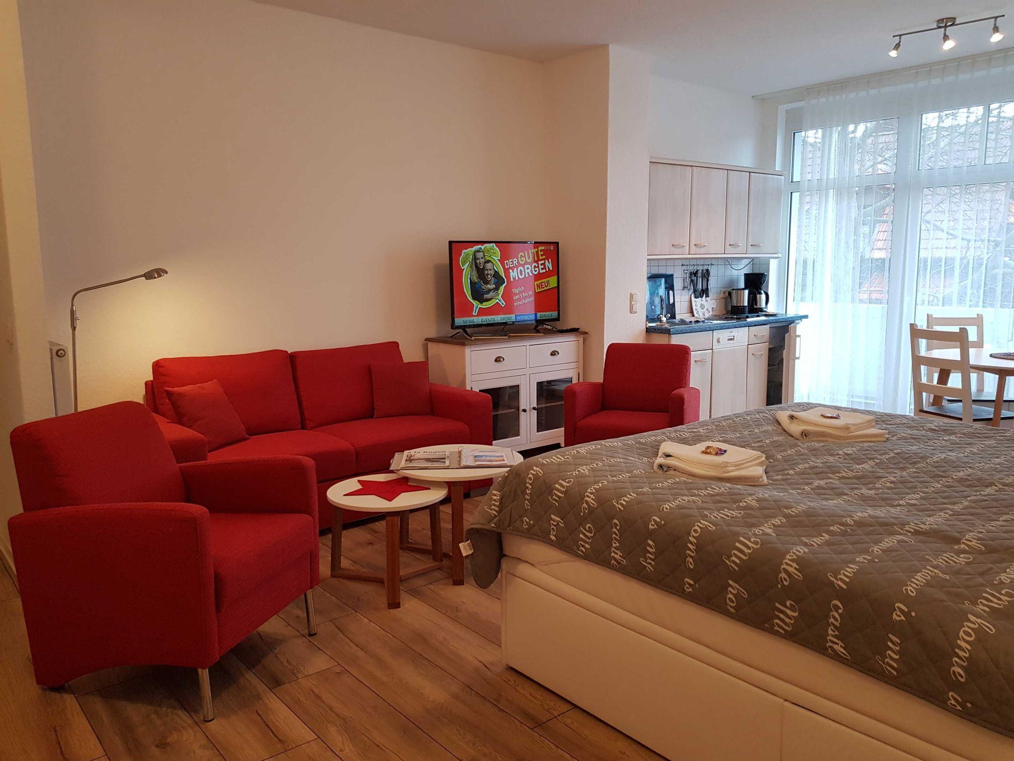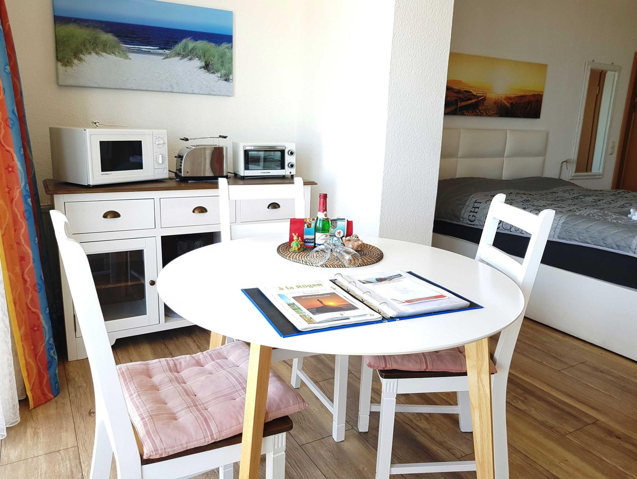 Das 1 Raumappartement hat einen Wohn-Schlafraum mit Doppelbett für 2 Pers.und einer ausziehbaren Couch, Smart -TV ,CD Stereoanlage ,Esstisch, gut ausgestattete Küchenzeile mit Geschirrspüler, Kaffeemaschine, Toaster und Microwelle. Babybett ( ohne Wäsche )und Hochstuhl für die kleinen stellen wir für 10 Euro zur verfügung ( bitte vorbestellen ) .