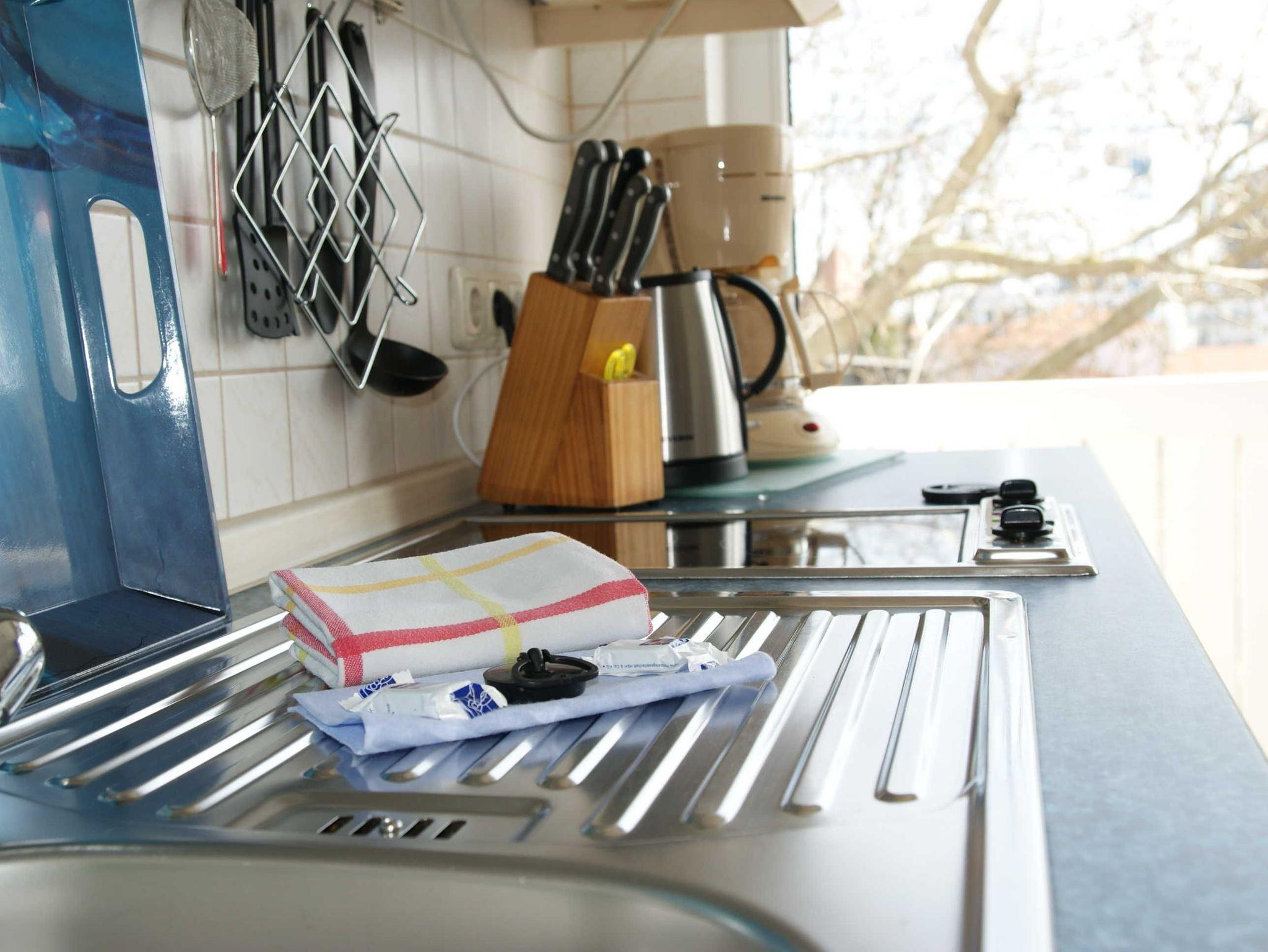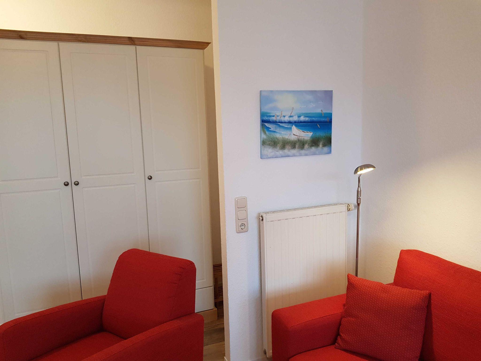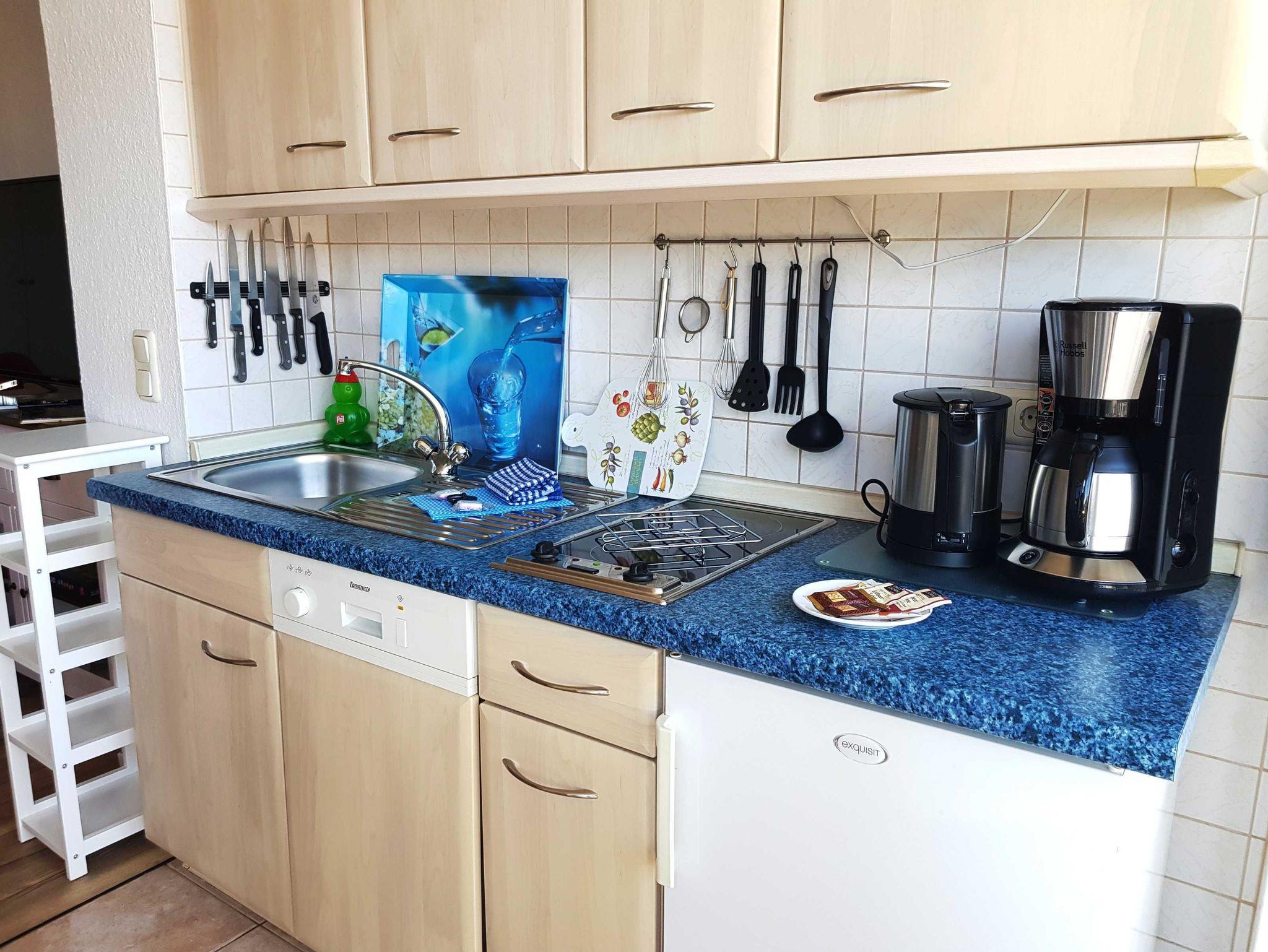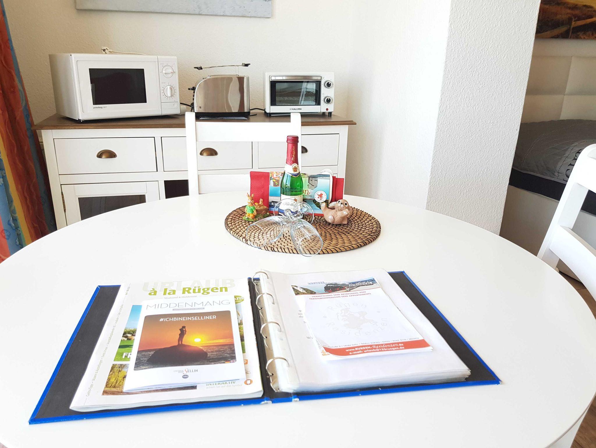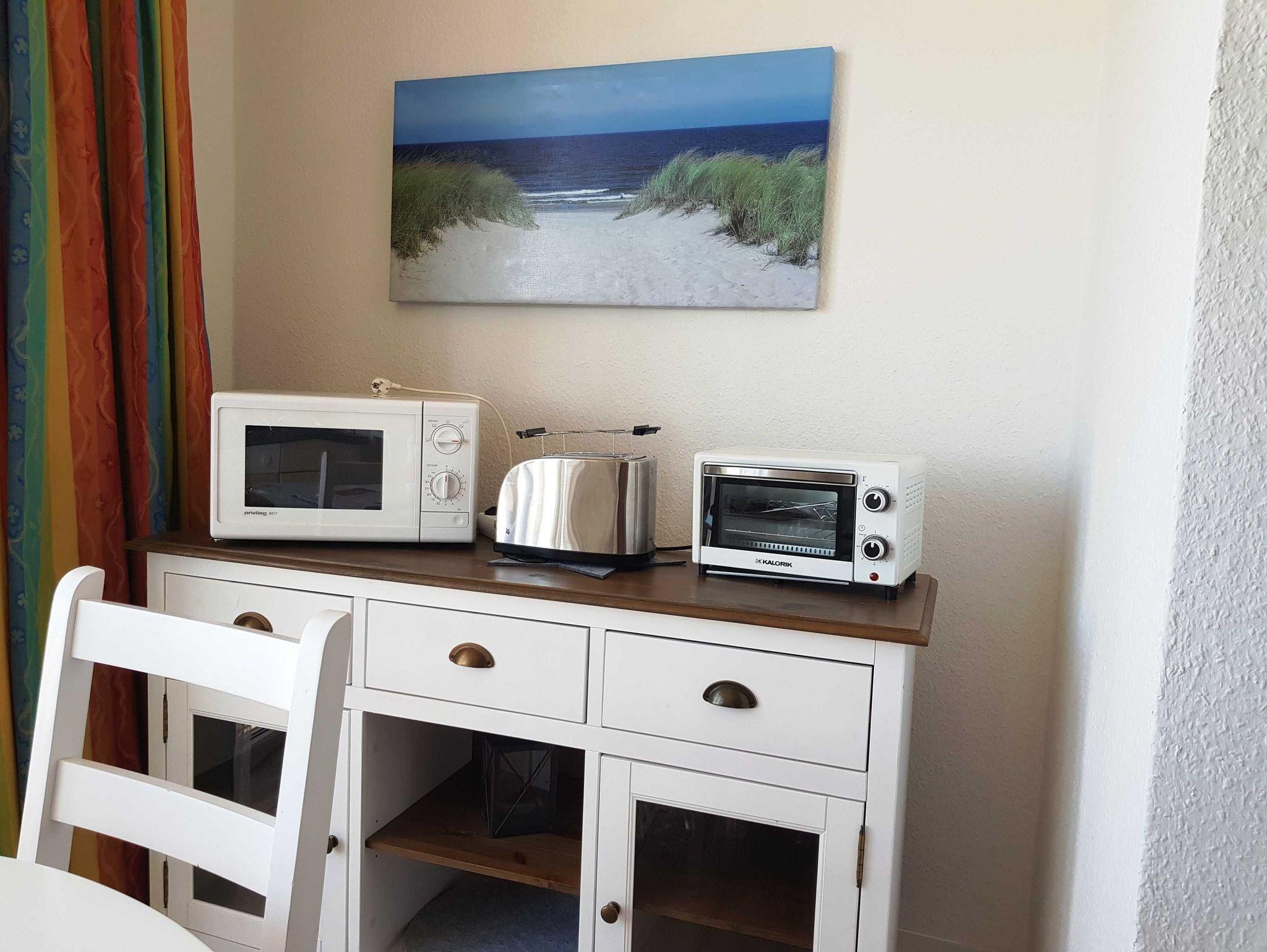 Das 1 Raumappartement hat einen Wohn-Schlafraum mit Doppelbett für 2 Pers.und einer ausziehbaren Couch, Smart -TV ,CD Stereoanlage ,Esstisch, gut ausgestattete Küchenzeile mit Geschirrspüler, Kaffeemaschine, Toaster und Microwelle. Babybett ( ohne Wäsche )und Hochstuhl für die kleinen stellen wir für 10 Euro zur verfügung ( bitte vorbestellen ) .