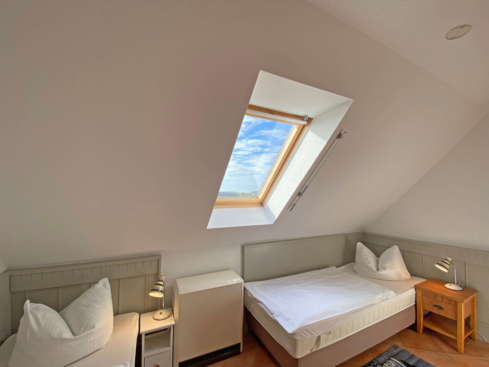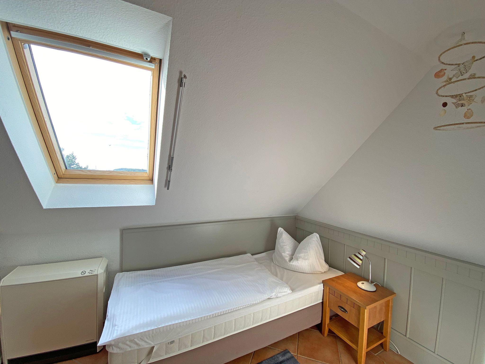 Die Nichtraucherwohnung mit ca. 66qm besticht durch ihre komfortable Raumaufteilung. Die in 1. Etage liegende Maisonettferienwohnung Nr.9 bietet ausreichend Platz für 2 bis 4 Erwachsene + 1 Kleinkind bis 3 Jahre im Kinderreisebett. Im Wohnbereich wird die Unterhaltungstechnik durch einen modernen Smart-TV und ein CD bzw. DVD-Player abgerundet. Auch im Urlaub müssen Sie nicht auf einen Internetanschluss (W-LAN) verzichten. Dieser ist für Sie inklusive. Für die Gemütlichkeit wurde der Wohnbereich mit Massivmöbeln, einer Stehlampe, zwei Sessel und eine Couch ausgestattet. Den bestuhlten Balkon (Westen) mit einem Sonnenschirm können Sie vom Wohnbereich erreichen. Er lädt bei einem Glas Wein zum Entspannen ein. Die angrenzende Küchenzeile verfügt über eine Spülmaschine, eine Mikrowelle, Ceranfeld mit Backofen, Kühlschrank, Wasserkocher, Toaster, Kaffeemaschine und diverse Küchenutensilien. Bei Ihren Mahlzeiten können Sie vom Esstisch aus, den Blick auf den Selliner See genießen. Das 1. Schlafzimmer wurde mit einem Doppelbett (1,80m x 2,00m), Nachtischablagen sowie einen Kleiderschrank ausgestattet. Das 2. Schlafzimmer verfügt über 2 Einzelbetten (0,80m x 2,00m), Nachttischablagen und einen Kleiderschrank. Im Tageslichtbad befinden sich eine Dusche, ein Waschtisch, ein WC und ein Fön. Beide Schlafzimmer sowie das Bad erreichen Sie bequem über die Treppe. Fensterläden und Vorhänge dienen zum Verdunkeln der Räumlichkeiten. In allen Räumlichkeiten finden Sie Nachtspeicheröfen. Ein Wäscheständer sowie Reinigungsutensilien stehen für Sie bereit. Haustiere sind in dieser Wohnung nicht erlaubt. Ein PKW-Stellplatz Nr.09 befindet sich direkt auf dem Grundstück. Ihre mitgebrachten oder geliehenen Fahrräder können Sie nach Verfügbarkeit im abschließbaren Fahrradraum unterstellen. Die Erstausstattung eines Wäschepaketes (komplette Bettwäsche, 1 Duschhandtuch, 1 kleines Handtuch) können Sie bis 14 Tage vor Anreise gegen einen Aufpreis dazu buchen oder durch eigene ergänzen. Ab 2 gebuchten Paketen erhalten Sie einmalig 1 Geschirrhandtuch und 1 Duschvorleger hinzu.