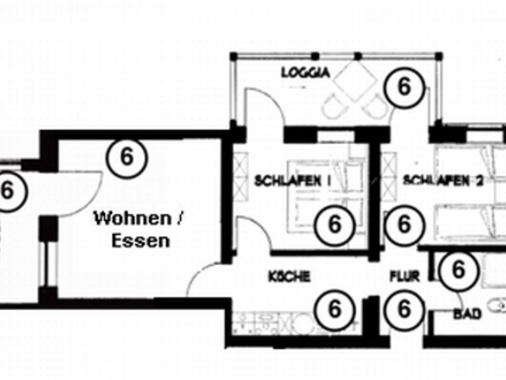Die schöne Drei-Zimmer Ferienwohnung Nr. 6 mit einer Größe von 60 m² für bis zu 6 Personen liegt im 1. Obergeschoss und hat die folgende Einrichtung / Ausstattung: