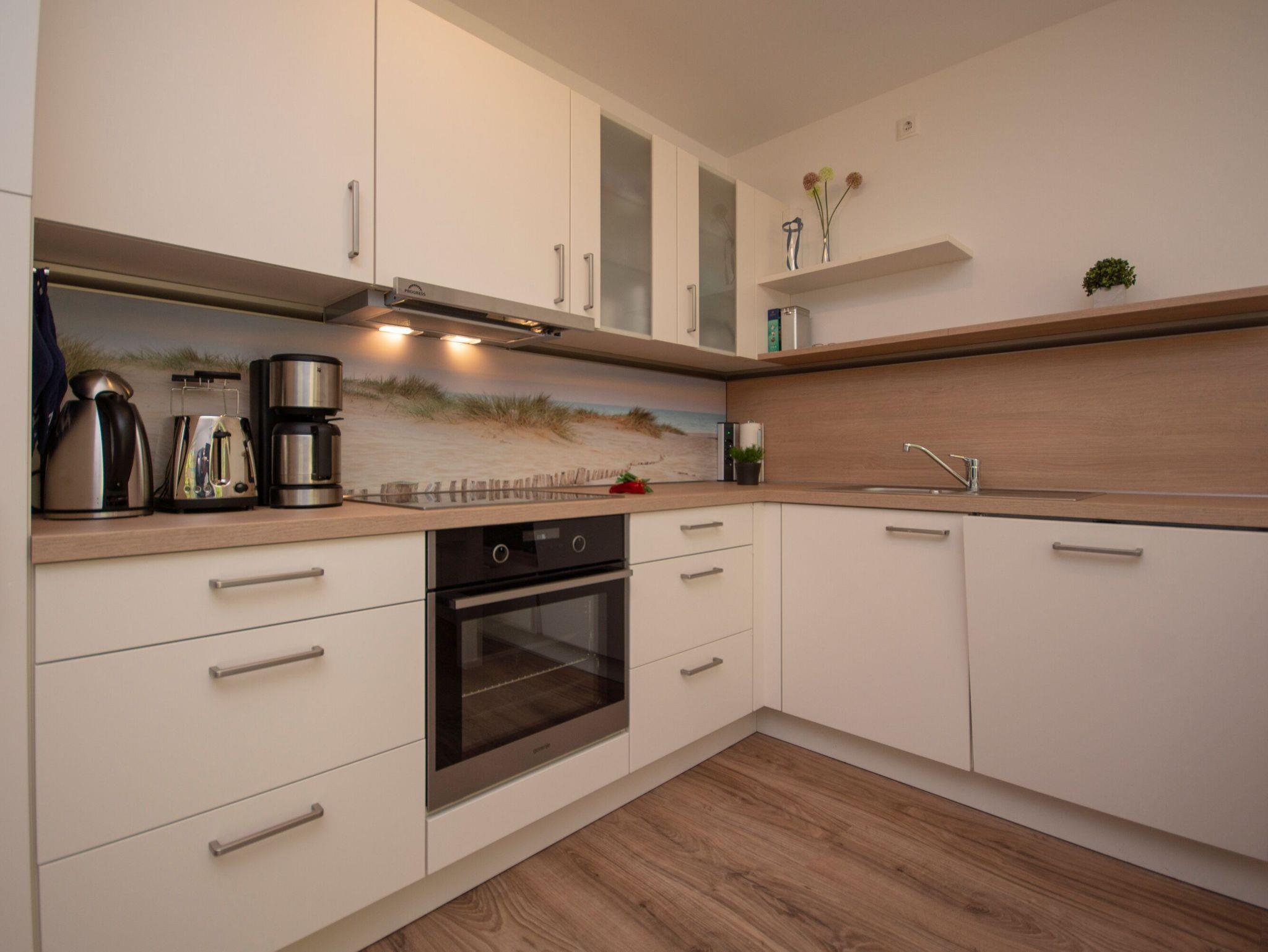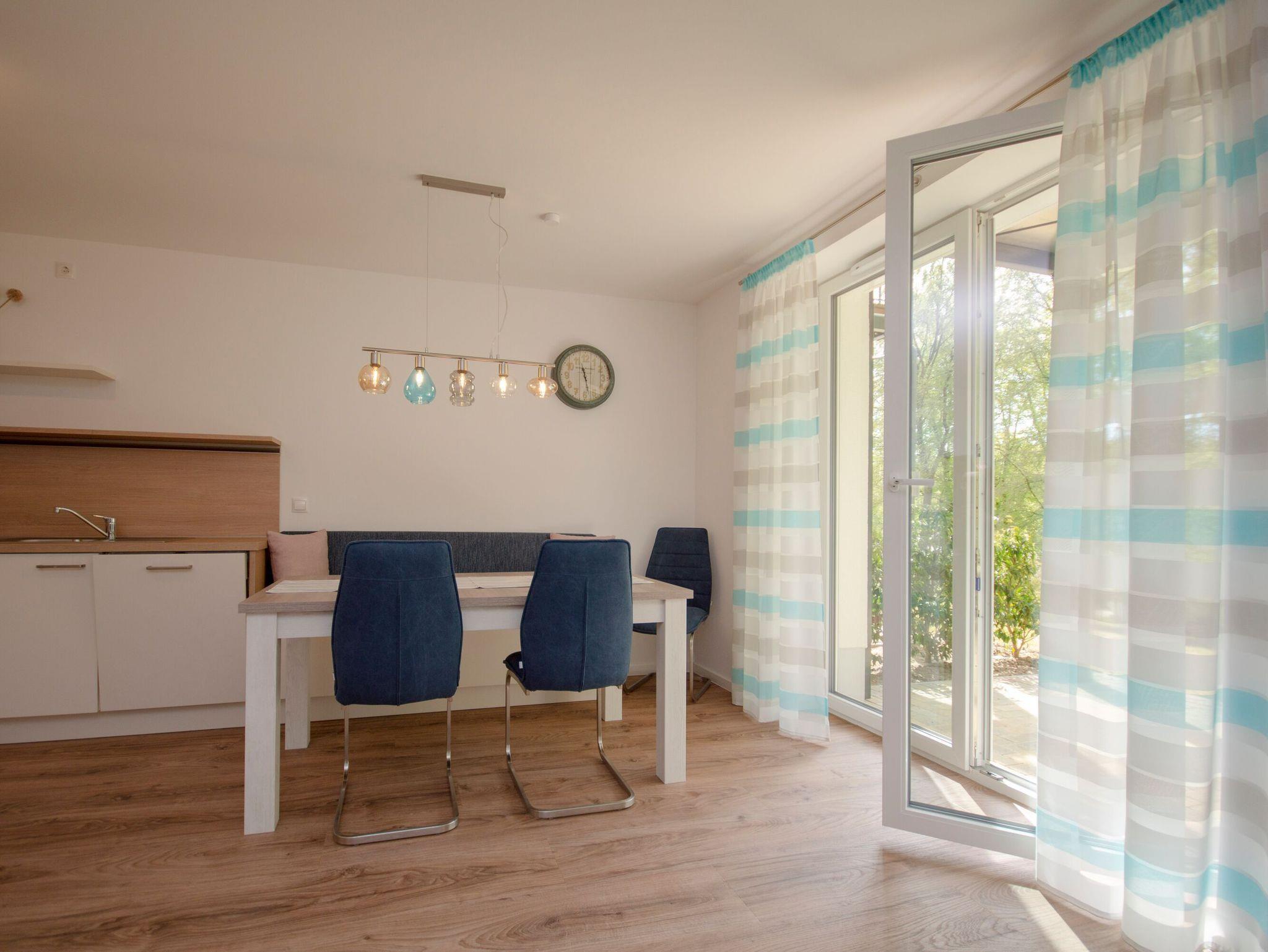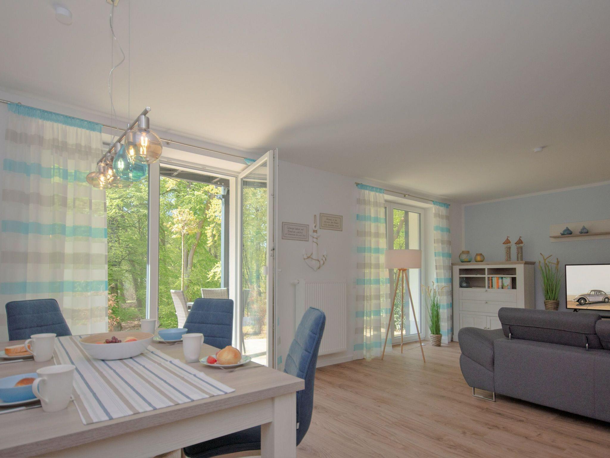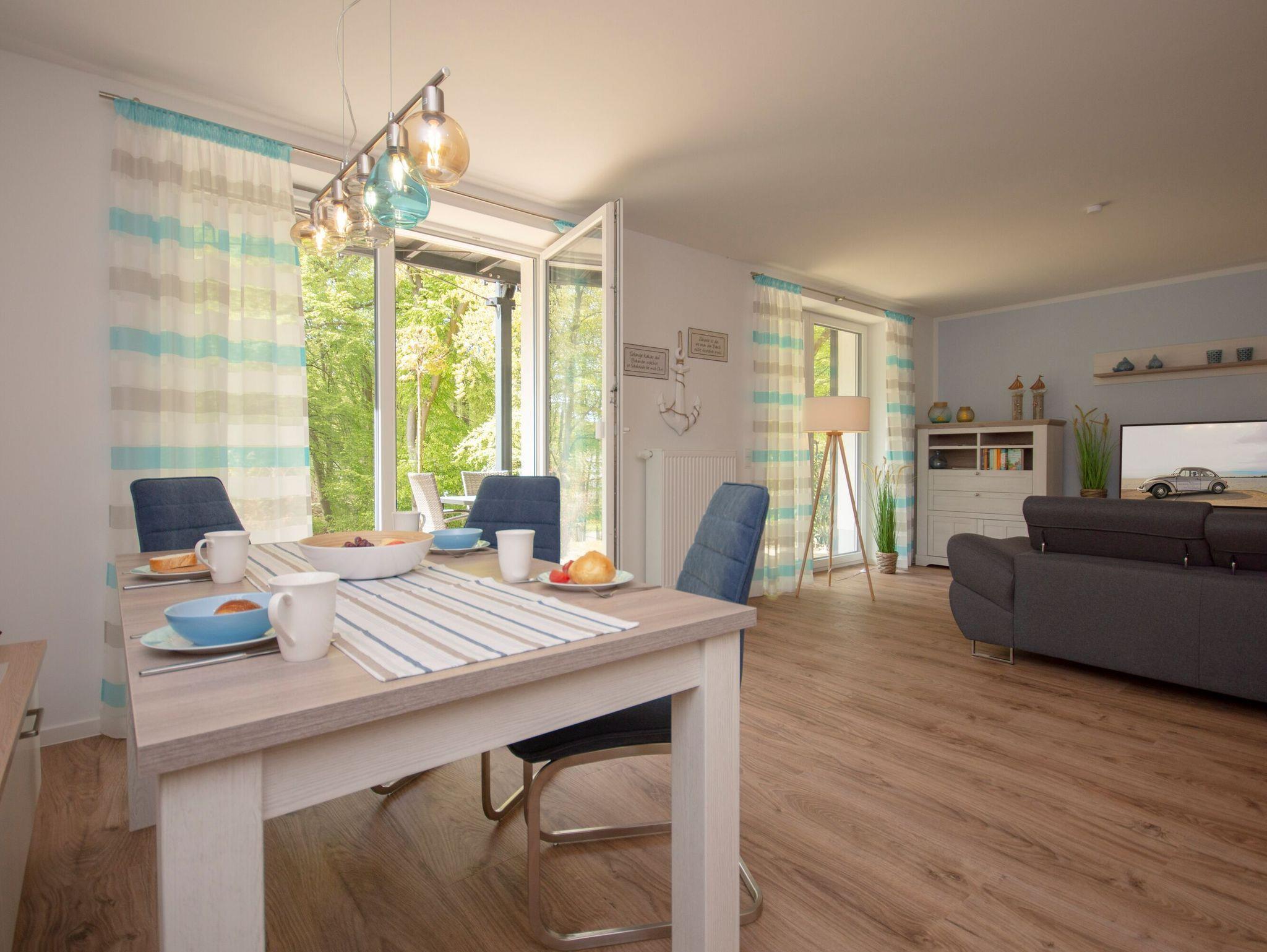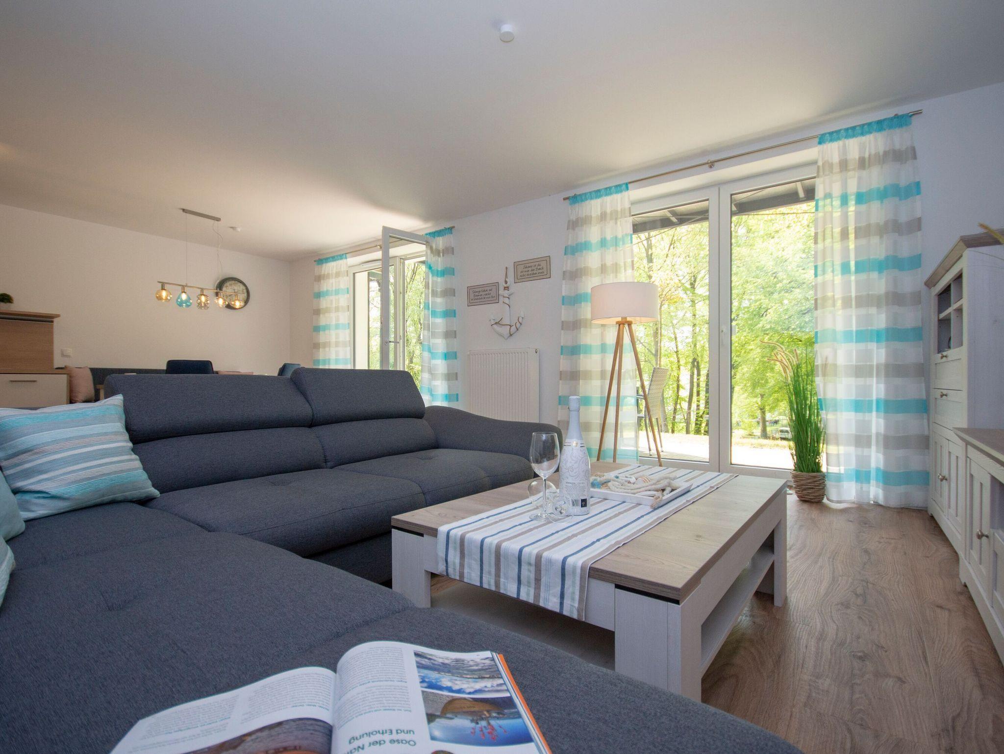 Das gemütliche Wohnzimmer mit Essbereich und offener Küche lädt zum Verweilen ein. Die voll ausgestattete Küche überzeugt in Sachen Hochwertigkeit und Ausstattung auf ganzer Linie. Neben einem Induktionskochfeld, einem Backofen und einer Mikrowelle stehen Ihnen allerlei Küchenkleingeräte zur Verfügung. Auf der komfortablen Couchgarnitur können Sie nach einem anstrengenden Wandertag in den Zicker Alpen einfach mal die Seele baumeln lassen. Im Wohn- sowie in einem der Schlafbereiche befindet sich jeweils ein Smart-TV. Der direkte Zugang zur sonnigen Terrasse mit einer tollen Naturaussicht runden das perfekte Urlaubsgefühl gekonnt ab. Eine Fliegengitter-Tür ist vorhanden. Die Nutzung der Sauna ist für alle Gäste möglich. Die Nutzungszeit beträgt 10 Minuten pro 1 € (es werden 1-€-Münzen benötigt).