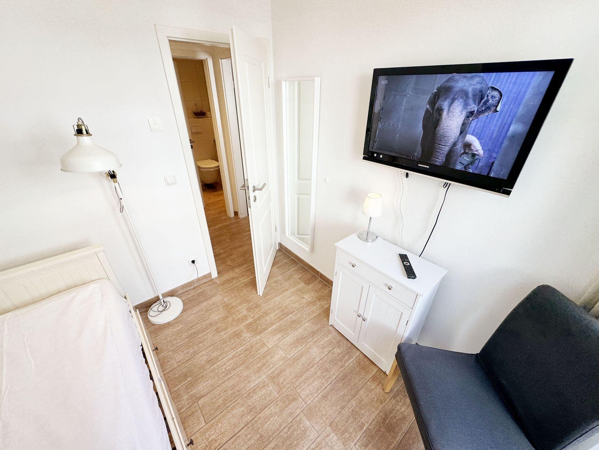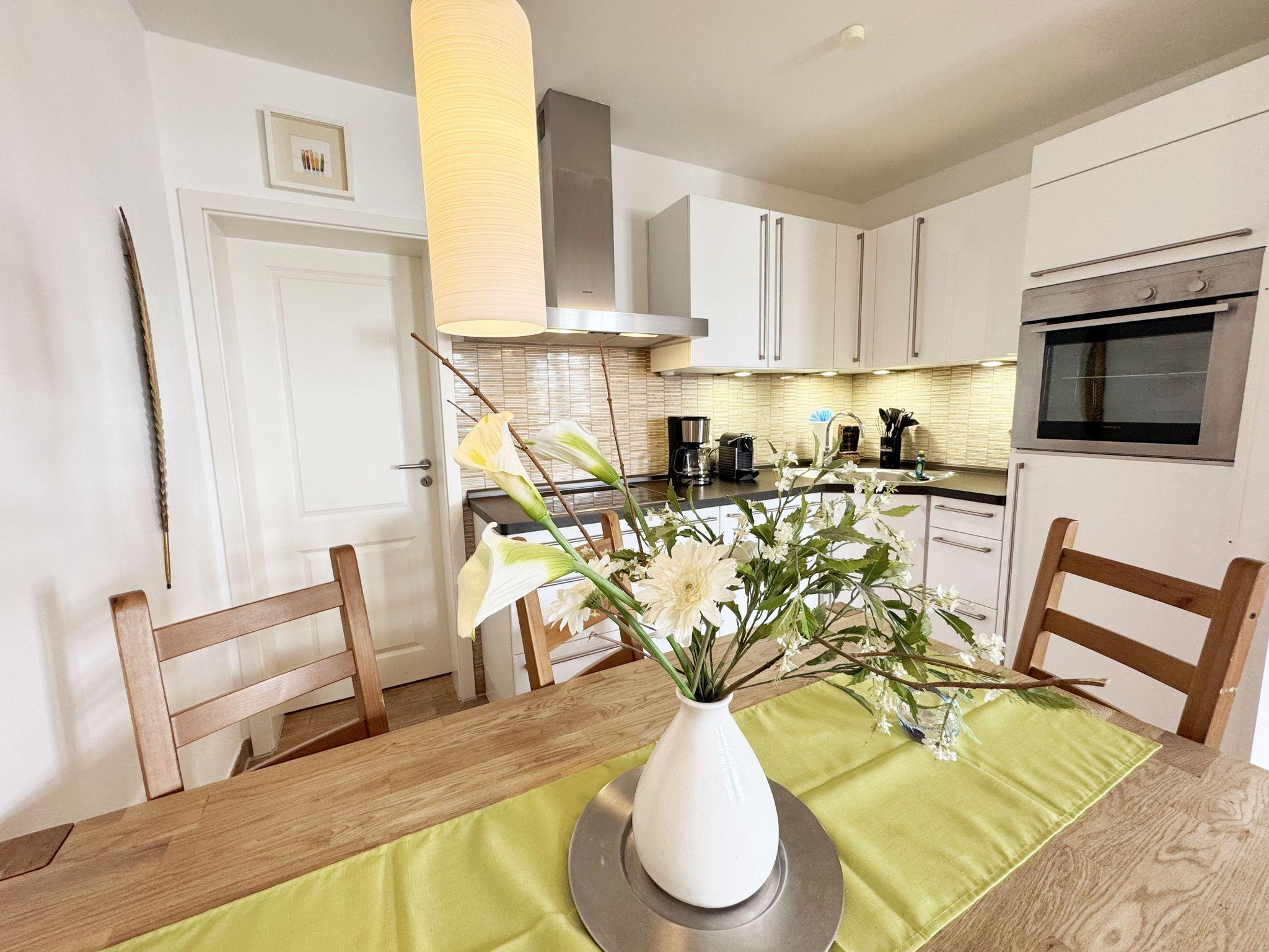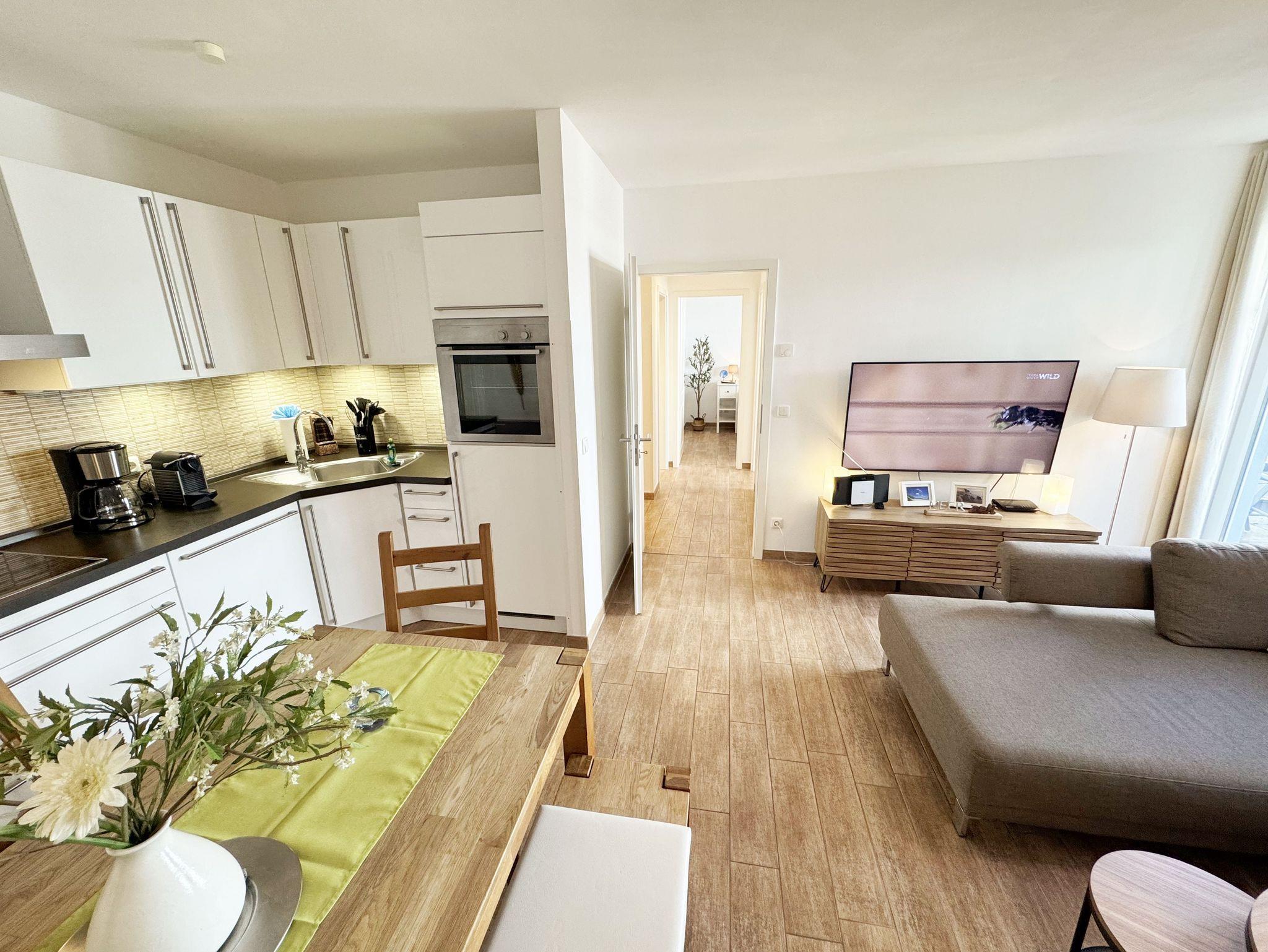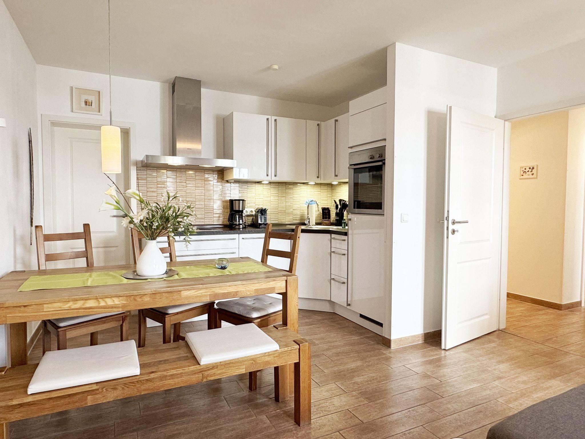Die 3-Zimmer-Nichtraucherwohnung ?Strandgut in der Villa Rosa befindet sich im 1. Obergeschoss und ist von der Tiefgarage bequem per Fahrstuhl zu erreichen. Die Wohnfläche der Wohnung beträgt ca. 56 qm und ist für max. 2 bis 5 Personen geeignet. Der Wohnbereich verfügt über eine Eck-Couch (Aufbettungsmöglichkeit 5.Person / 1,00m x 2,00m) mit Hocker, einen Couchtisch, einer Stehlampe, einem TV-Board, ein Smart-TV sowie ein DAB-Radio mit USB, Bluetooth und CD. Ein WLAN-Anschluss rundet den technischen Bereich ab. Fernab der Technik können Sie aber auch in der Spielesammlung oder bei den Urlaubslektüren Ihren Ruhepol finden. Von hier gelangen Sie auch auf Ihre bestuhlte Nord-/West-Terrasse. Wo Ihnen auch ein Strandkorb und ein Grill zur Verfügung stehen. Angrenzend zum Wohnbereich befindet sich die Küchenzeile, welche mit einem finnischem Marmorfliesenspiegel versehen wurde. Um jede Mahlzeit zu genießen, nutzen Sie gerne das Cerankochfeld, den Backofen, den Kühlschrank mit Gefrierfach, den Geschirrspüler, den Wasserkocher, den Toaster, die Kaffeemaschine, die Nespresso Maschine und diverse Küchenutensilien. Ein Essplatz rundet den Bereich ab. Im Nebenraum befindet sich zusätzlich eine Mikrowelle sowie eine Waschmaschine mit Trocknerfunktion. Das 1. Schlafzimmer, welches Sie vom Flurbereich erreichen ist mit einem hochwertigen Boxspringbett (1,80m x 2,00m) ausgestattet, welches mit einer Komforthöhe von 60 cm das Ein- und Aussteigen vereinfacht. 7-Zonenmatratzen (durchgängiger Matratzenschutz 1,80 m x 2,00 m), 2 Nachttischablagen mit Beleuchtung und ein Flachbild-TV komplettieren den Raum. Ihre Kleidung finde im angrenzenden Ankleideraum mit großem Spiegel Platz. Das 2. Schlafzimmer, welches ebenso vom Flurbereich erreicht wird, verfügt über ein Kojen Bett (0,80m x 2,00m) welches mit wenigen Handgriffen auch für 2 Personen auf eine gleiche Liegehöhe (1,60m x 2,00m) umfunktioniert werden kann. Eine Leselampe, ein Flachbild -TV und eine Kleiderkommode runden das 2. Schlafzimmer ab. Von hier gelangt man zusätzlich auf die Terrasse. Das innenliegende Bad (Villeroy & Boch Fliesen) ist mit einer ebenerdigen Glasdusche, einem WC, einem Waschplatz, einem Fön, einem Kosmetikspiegel und einem beheizbaren Handtuchhalter ausgestattet. In allen Räumen sorgt eine Fußbodenheizung für angenehme Wärme. 1x Hochstuhl ist für unsere kleinen Gäste inklusive. Haustiere sind in der Wohnung nicht erlaubt!!! Der sich im Erdgeschoss befindliche Wellnessbereich (kostenpflichtig) verfügt über eine finnische Sauna, Dampfbad und einen stilvollen Ruhebereich. Die Wertmarken können Sie auf Nachfrage während Ihres Urlaubes erwerben. Der Parkplatz befindet sich in der Tiefgarage (Doppelparker Nr. 09, Einfahrtshöhe 2,00m) und ist für PKW´s und Kombis (bis Höhe 1,80 m) geeignet. Ihre Fahrräder können Sie im hauseigenen Fahrradkeller unterbringen. Ein zusätzlicher Grillplatz und eine Spielecke können auf dem hinteren Teil des Grundstücks genutzt werden. Die Erstausstattung eines Wäschepaketes (komplette Bettwäsche, 1 Duschhandtuch, 2 kleine Handtücher) können Sie bis 14 Tage vor Anreise gegen einen Aufpreis dazu buchen oder durch eigenes Ergänzen. Ab 2 gebuchten Paketen erhalten Sie einmalig 1 Geschirrhandtuch und 1 Duschvorleger hinzu.