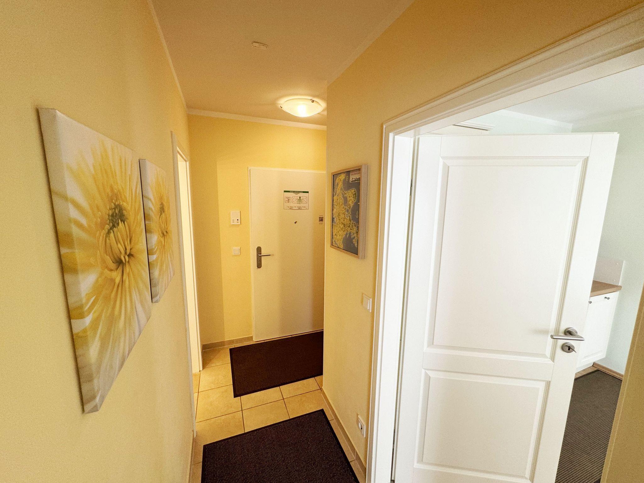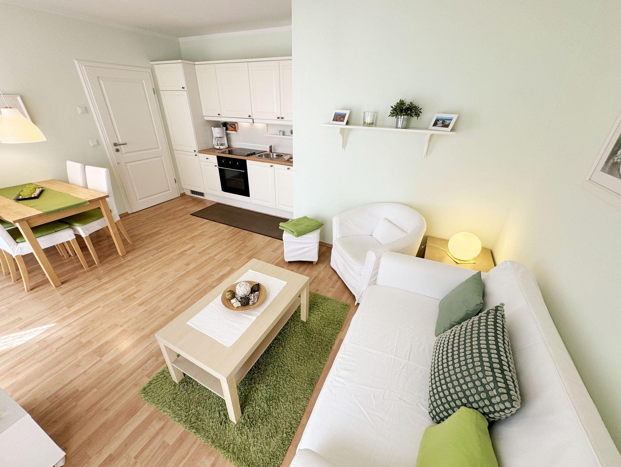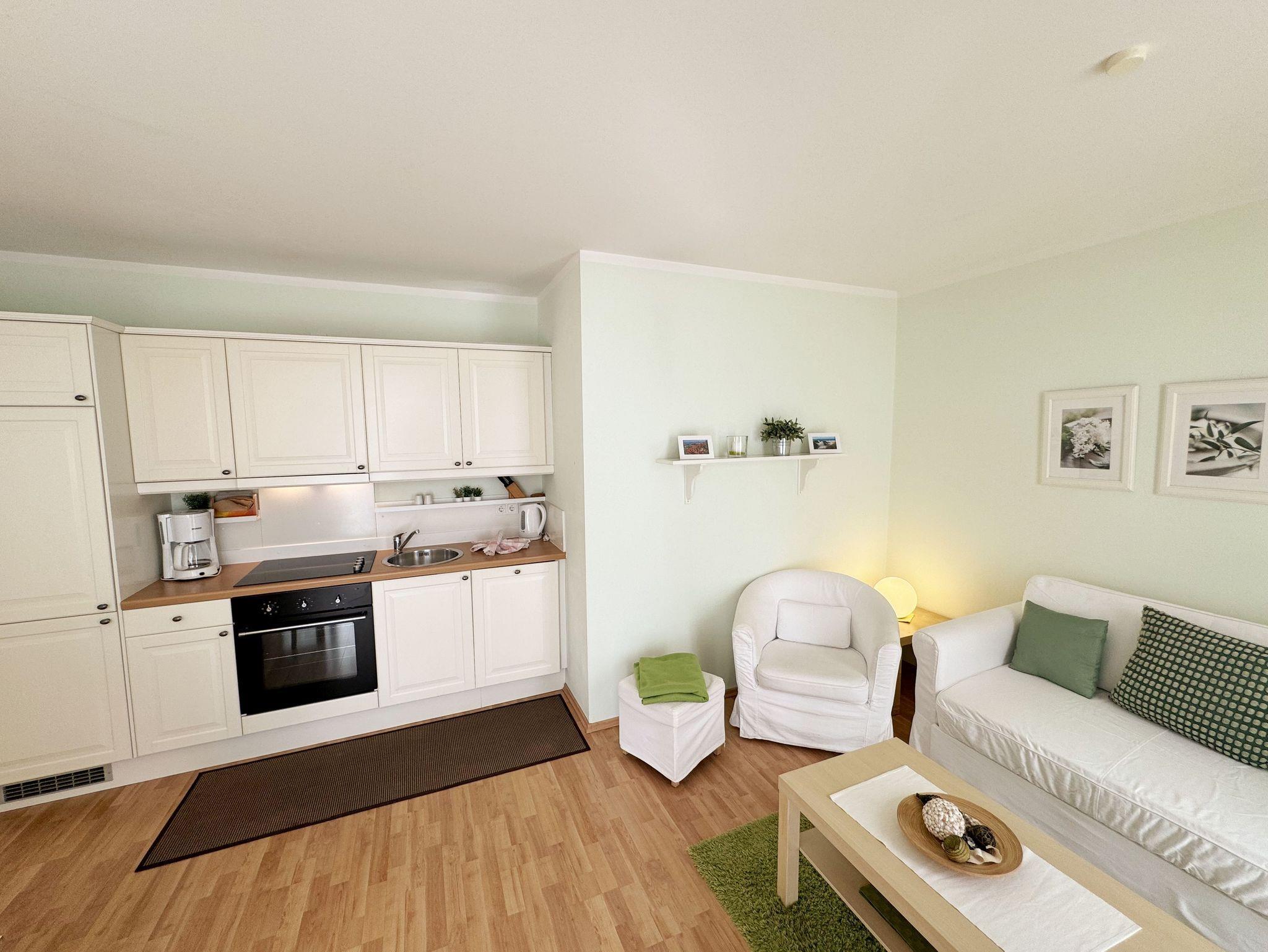 Die freundliche und helle, ca. 45 m² große 2-Raum-Ferienwohnung (Nichtraucher) bietet Ihnen Platz für 2 bis 3 Personen und befindet sich in der ersten Etage, welche Sie bequem per Fahrstuhl von der Tiefgarage aus erreichen. Der geräumige Wohnbereich verfügt über eine Couch (Aufbettungsmöglichkeit für die 3. Person ? 1,20 m x 1,96 m), einen Sessel, einen Couchtisch sowie eine Leselampe. Der technische Bereich wird durch einen LED-TV, eine Mini-Stereoanlage mit CD- und DVD-Player abgerundet. Auch auf einen Internetanschluss (WLAN) brauchen Sie nicht verzichten. Dieser ist für Sie inklusive. Angrenzend befinden sich eine gemütliche Essecke mit Holztisch und 3 Stühlen sowie eine im nordischen Stil angelehnte, vollausgestattete Küchenzeile mit diversen Küchenutensilien. Hochwertige Geräte wie ein 4-Zonenceranfeld, Backofen, Dunstabzugshaube, Kühlschrank mit Gefrierfach, Geschirrspüler, Mikrowelle, Kaffeemaschine, Wasserkocher, Toaster gehören dazu. Das komfortable Schlafzimmer ist mit einem Doppelbett (1,80 m x 2,00 m), welches hochwertige Matratzen und verstellbare Lattenroste beinhaltet sowie 2 Nachttischlampen, einen Flachbild-TV und einem Kleiderschrank eingerichtet. Die Verdunklung erfolgt hier über eine Jalousie. Im Badezimmer befindet sich eine ebenerdige Glasdusche, ein WC, Fön und ein Handtuchheizkörper. Darüber hinaus stehen Ihnen ein Bügelbrett und ein Bügeleisen zur Verfügung. Der nach Süd-West überdachte Balkon verfügt neben der Bestuhlung auch über einen Sonnenschirm, welchen Sie vom Wohnbereich erreichen. Alle Räumlichkeiten verfügen über eine Fußbodenheizung. Ein PKW-Stellplatz (Doppelparker Nr. 3) befindet sich in der Tiefgarage (1,80 m Höhe und 5 m Länge; Tiergarageneinfahrt ? Höhe ca. 2,00 m). Im Hauswirtschaftsraum des Hauses können Sie gegen eine Extragebühr eine Waschmaschine und einen Trockner nutzen. Ein separater Fahrradunterstand ist auf dem Hintergrundstück durch einen kleinen Fußweg erreichbar. Für einen kurzen Weg zum Brötchenholen sorgt der im Haus zu findende Bäcker. Mit einem eigenen Schlafplatz ist auch 1 Haustier gegen eine Gebühr ein gern gesehener Gast. Die Erstausstattung eines Wäschepaketes (komplette Bettwäsche, 1 Duschhandtuch, 1 kleines Handtuch) können Sie bis 14 Tage vor Anreise gegen einen Aufpreis dazu buchen oder durch eigene ergänzen. Ab 2 gebuchten Paketen erhalten Sie einmalig 1 Geschirrhandtuch und 1 Duschvorleger hinzu.