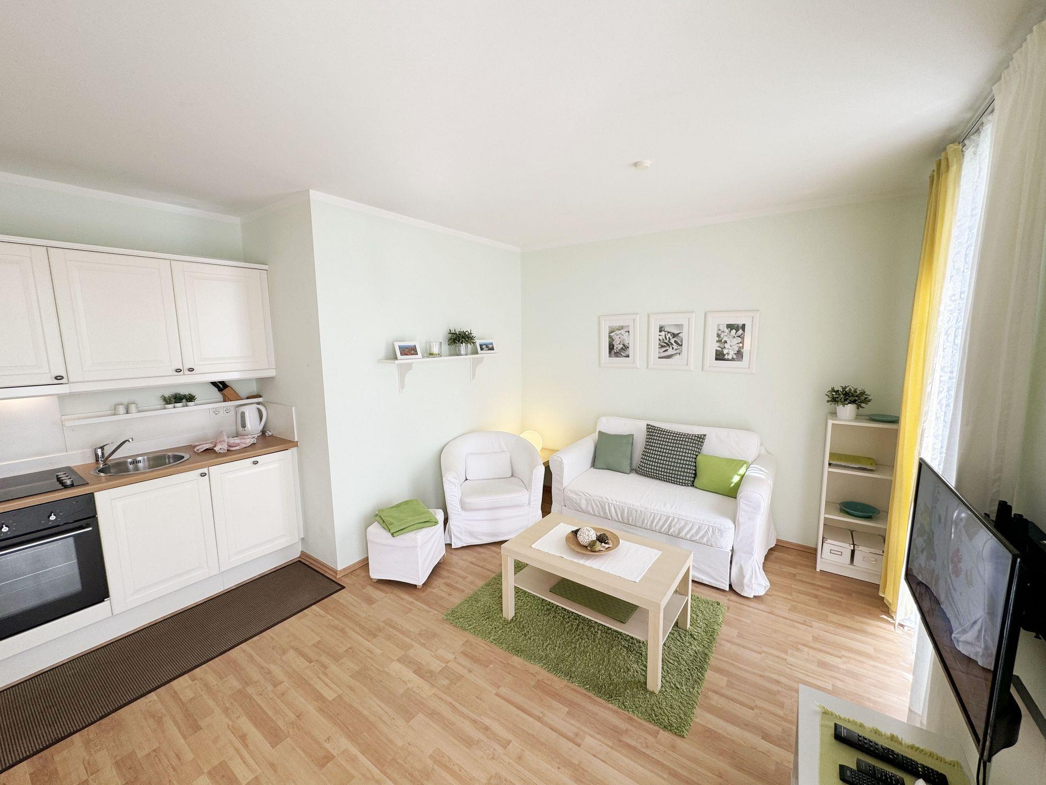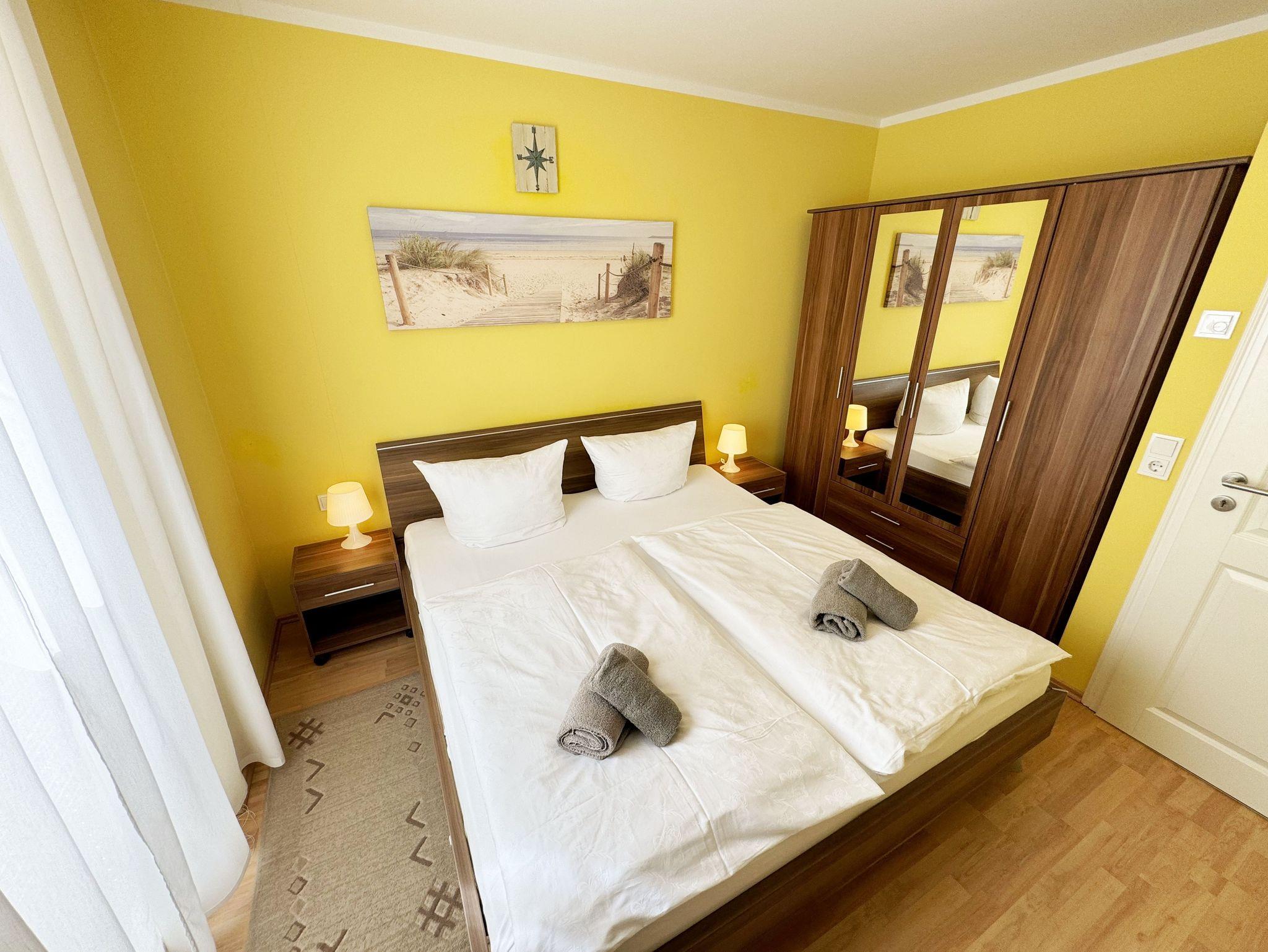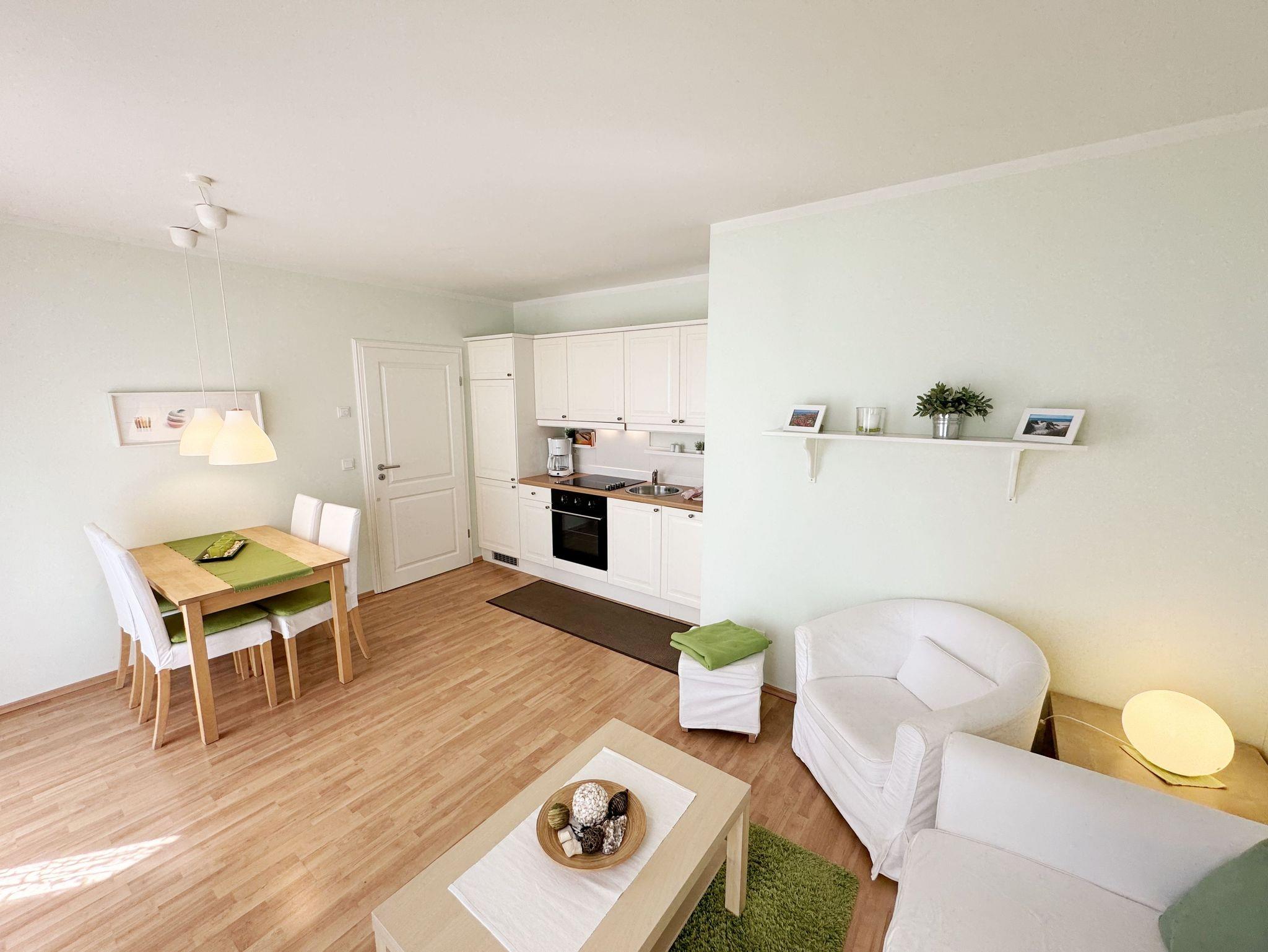 Die freundliche und helle, ca. 45 m² große 2-Raum-Ferienwohnung (Nichtraucher) bietet Ihnen Platz für 2 bis 3 Personen und befindet sich in der ersten Etage, welche Sie bequem per Fahrstuhl von der Tiefgarage aus erreichen. Der geräumige Wohnbereich verfügt über eine Couch (Aufbettungsmöglichkeit für die 3. Person ? 1,20 m x 1,96 m), einen Sessel, einen Couchtisch sowie eine Leselampe. Der technische Bereich wird durch einen LED-TV, eine Mini-Stereoanlage mit CD- und DVD-Player abgerundet. Auch auf einen Internetanschluss (WLAN) brauchen Sie nicht verzichten. Dieser ist für Sie inklusive. Angrenzend befinden sich eine gemütliche Essecke mit Holztisch und 3 Stühlen sowie eine im nordischen Stil angelehnte, vollausgestattete Küchenzeile mit diversen Küchenutensilien. Hochwertige Geräte wie ein 4-Zonenceranfeld, Backofen, Dunstabzugshaube, Kühlschrank mit Gefrierfach, Geschirrspüler, Mikrowelle, Kaffeemaschine, Wasserkocher, Toaster gehören dazu. Das komfortable Schlafzimmer ist mit einem Doppelbett (1,80 m x 2,00 m), welches hochwertige Matratzen und verstellbare Lattenroste beinhaltet sowie 2 Nachttischlampen, einen Flachbild-TV und einem Kleiderschrank eingerichtet. Die Verdunklung erfolgt hier über eine Jalousie. Im Badezimmer befindet sich eine ebenerdige Glasdusche, ein WC, Fön und ein Handtuchheizkörper. Darüber hinaus stehen Ihnen ein Bügelbrett und ein Bügeleisen zur Verfügung. Der nach Süd-West überdachte Balkon verfügt neben der Bestuhlung auch über einen Sonnenschirm, welchen Sie vom Wohnbereich erreichen. Alle Räumlichkeiten verfügen über eine Fußbodenheizung. Ein PKW-Stellplatz (Doppelparker Nr. 3) befindet sich in der Tiefgarage (1,80 m Höhe und 5 m Länge; Tiergarageneinfahrt ? Höhe ca. 2,00 m). Im Hauswirtschaftsraum des Hauses können Sie gegen eine Extragebühr eine Waschmaschine und einen Trockner nutzen. Ein separater Fahrradunterstand ist auf dem Hintergrundstück durch einen kleinen Fußweg erreichbar. Für einen kurzen Weg zum Brötchenholen sorgt der im Haus zu findende Bäcker. Mit einem eigenen Schlafplatz ist auch 1 Haustier gegen eine Gebühr ein gern gesehener Gast. Die Erstausstattung eines Wäschepaketes (komplette Bettwäsche, 1 Duschhandtuch, 1 kleines Handtuch) können Sie bis 14 Tage vor Anreise gegen einen Aufpreis dazu buchen oder durch eigene ergänzen. Ab 2 gebuchten Paketen erhalten Sie einmalig 1 Geschirrhandtuch und 1 Duschvorleger hinzu.
