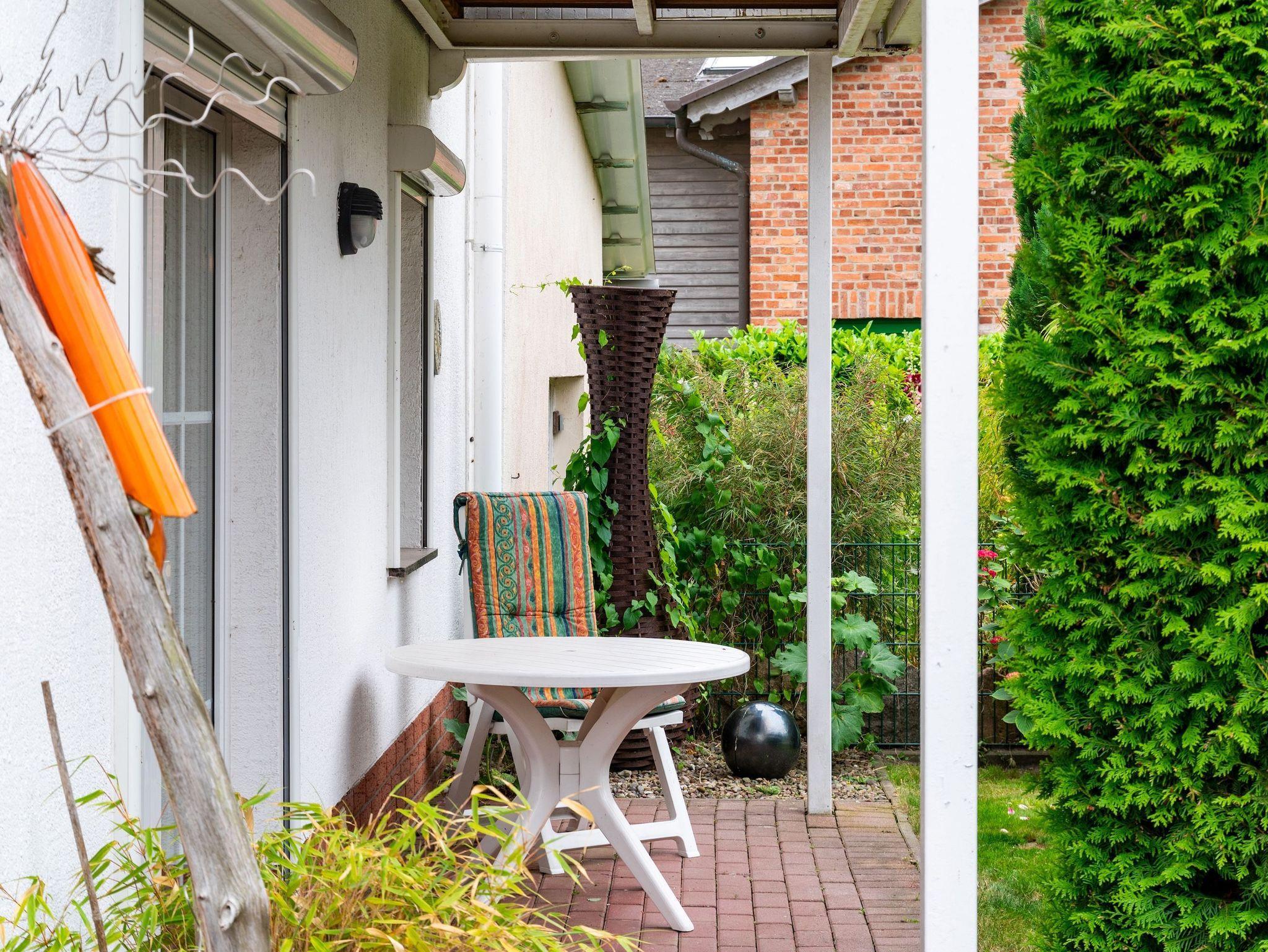 Das separate Schlafzimmer sorgt für erholsame Nächte, während das moderne Badezimmer mit seiner klaren Gestaltung zum Frischwerden nach einem Strandtag oder einer Radtour einlädt.