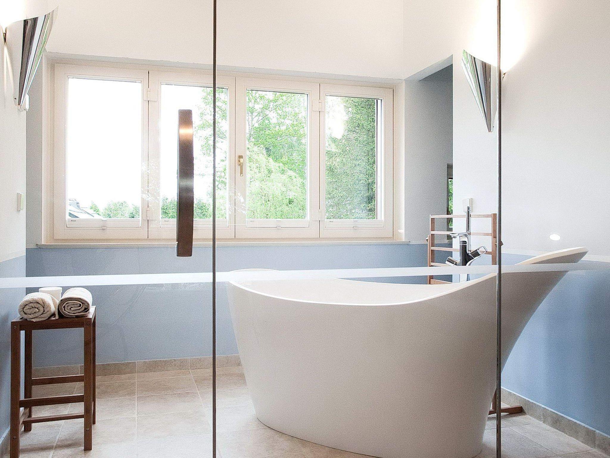 Das geflieste Bad ist durch eine Glasfront vom Schlafzimmer getrennt und verfügt über eine optisch extrem ansprechende, freistehende, englische Badewanne mit einem atemberaubenden Blick über die Lankener Bek in den Yachthafen von Seedorf mit den wundervollen Segelbooten. So kann man herrlich entspannen - unabhängig vom Wechsel der Jahreszeiten.