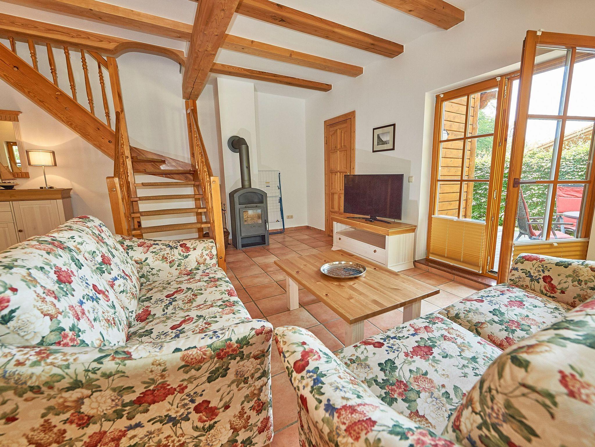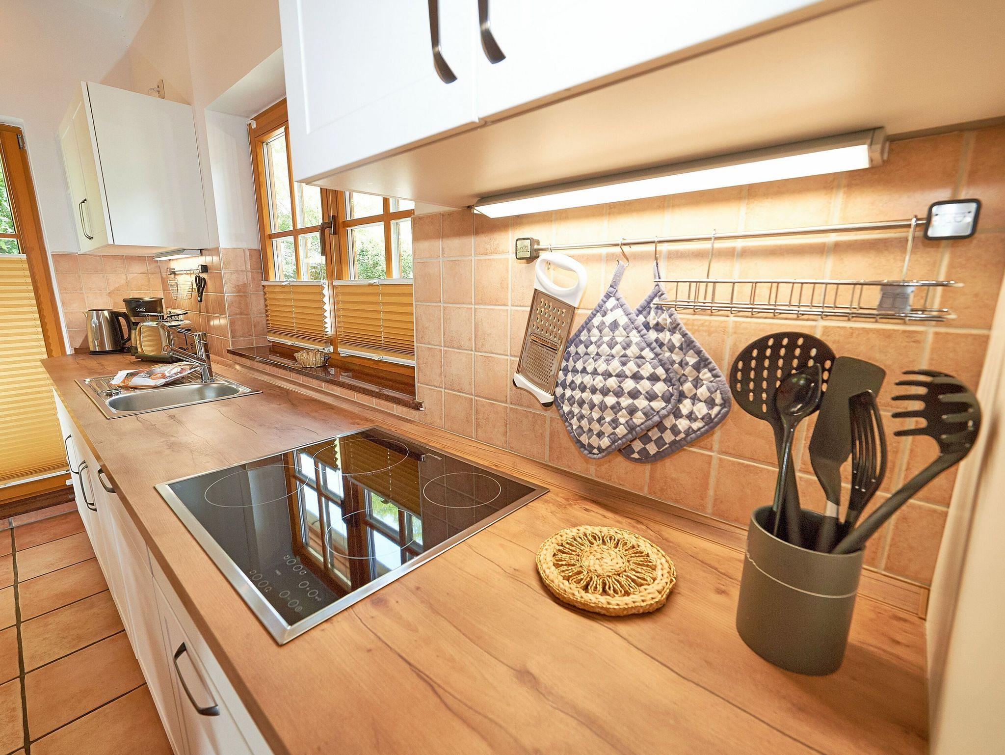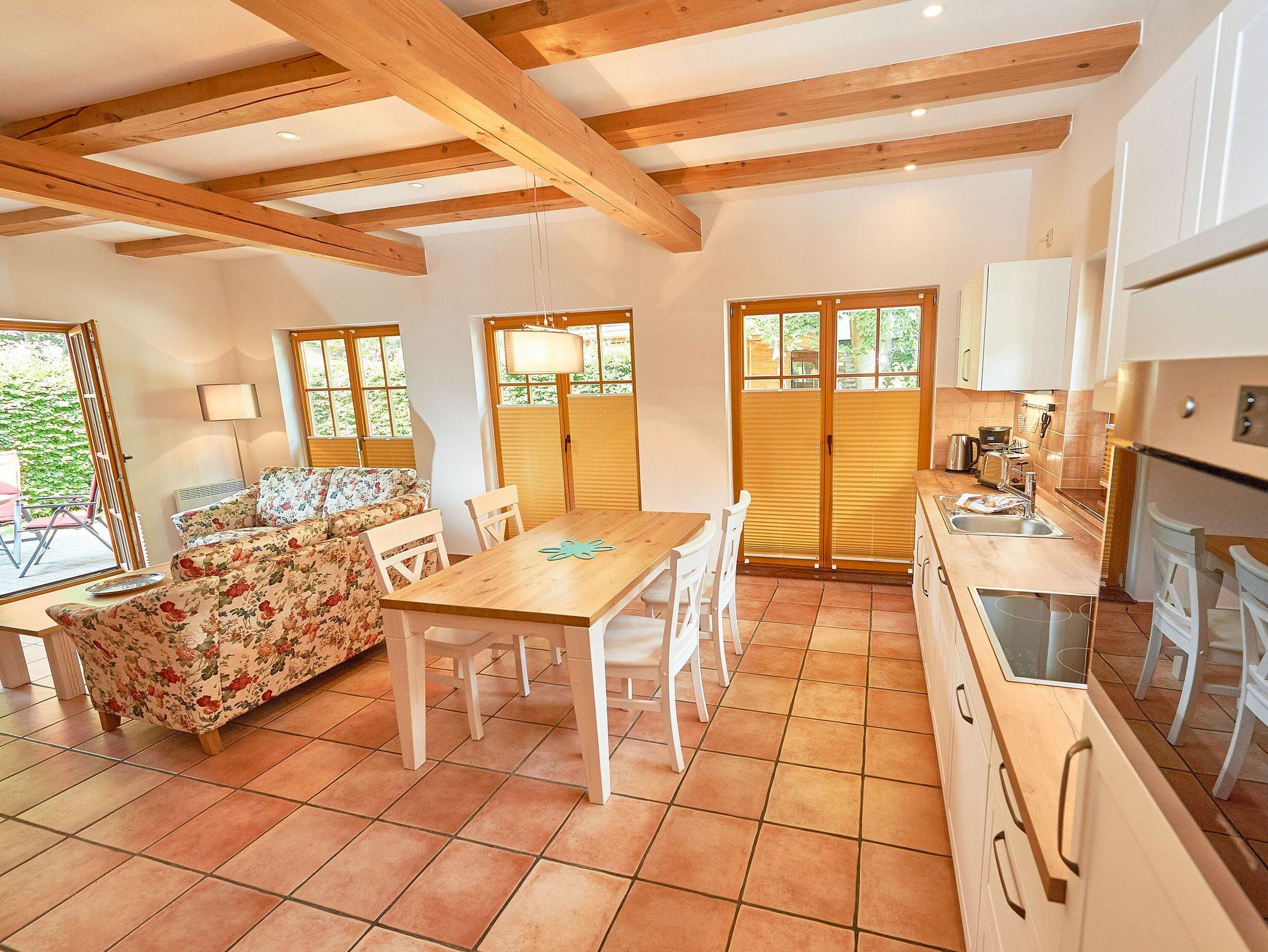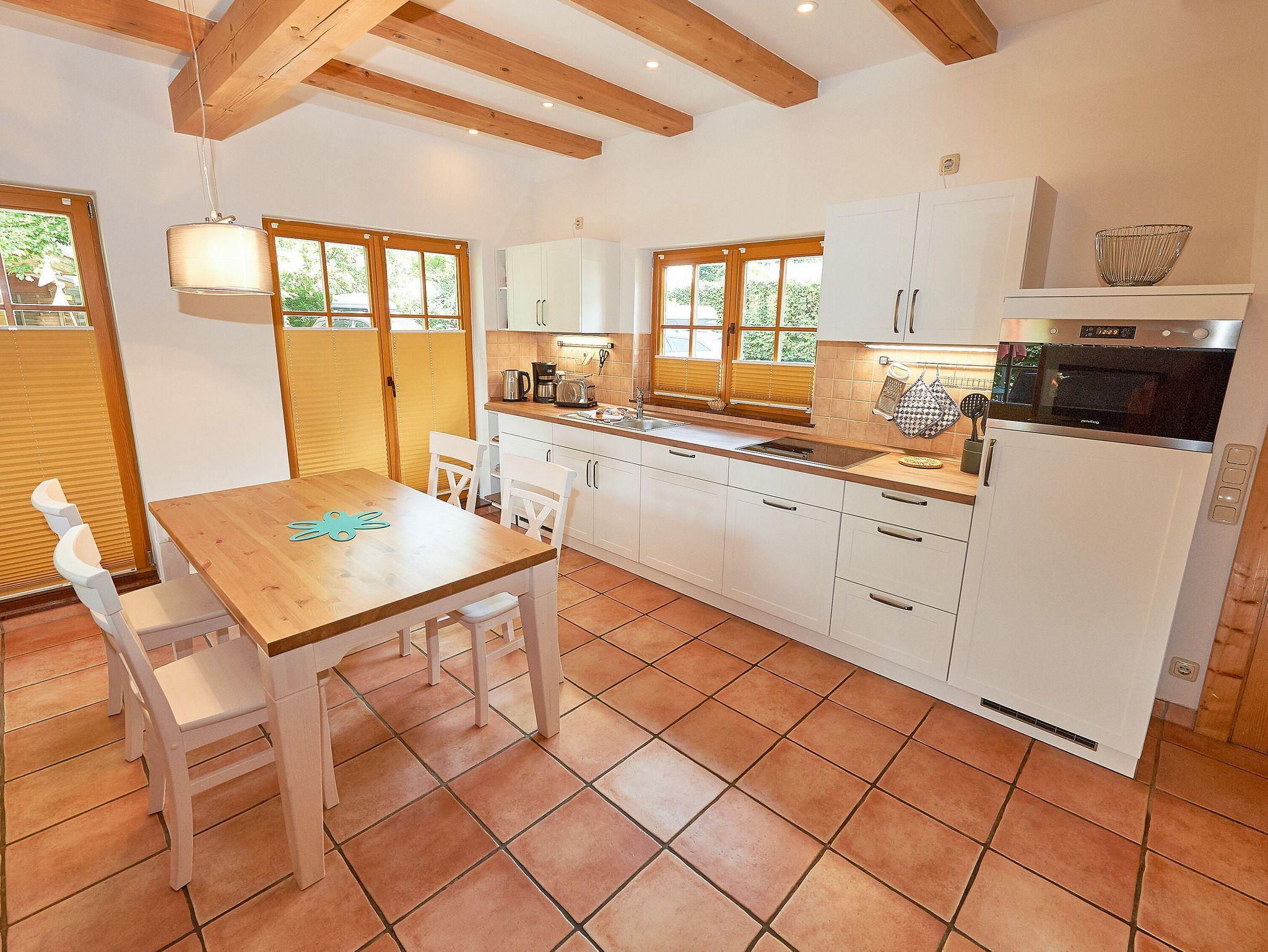 Zwei Sofas vor dem großen Flachbild-TV, kostenfreies W-LAN und der Kaminofen ermöglichen angenehme Abende, auch wenn die Sonne mal nicht vom Himmel lacht. Der große Esstisch ist für 4 Personen geeignet. Die harmonisch im Wohnbereich integrierte Küchenzeile ist ausgestattet mit einem 4-Zonen-Cerankochfeld, einem Kühlschrank mit Gefriermöglichkeit, einer Spülmaschine, einer Mikrowelle mit Grill, Kaffeemaschine, Toaster, Wasserkocher und diversem Kleininventar, das die Ausstattung komplettiert. Auch Ihre kostenfrei nutzbare Waschmaschine finden Sie hier.