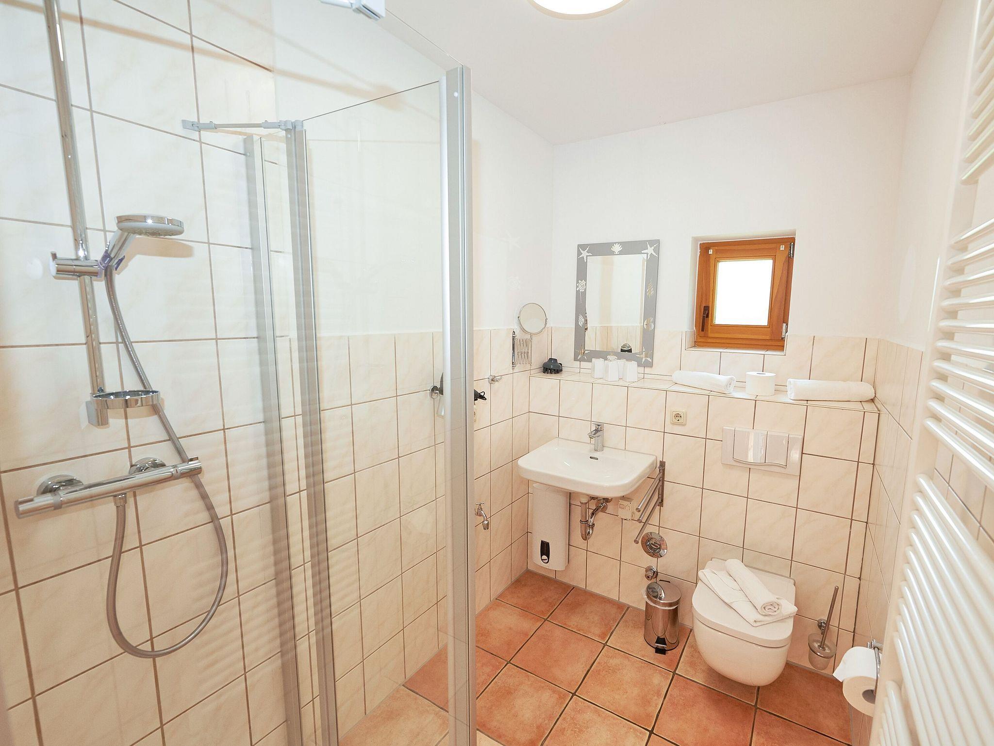Das Badezimmer Ihrer Urlaubsunterkunft erwartet Sie ebenfalls im Erdgeschoss. Es ist mit Dusche/WC, einem beheizbaren Handtuchtrockner sowie Waschtisch inklusive Fön ausgestattet.