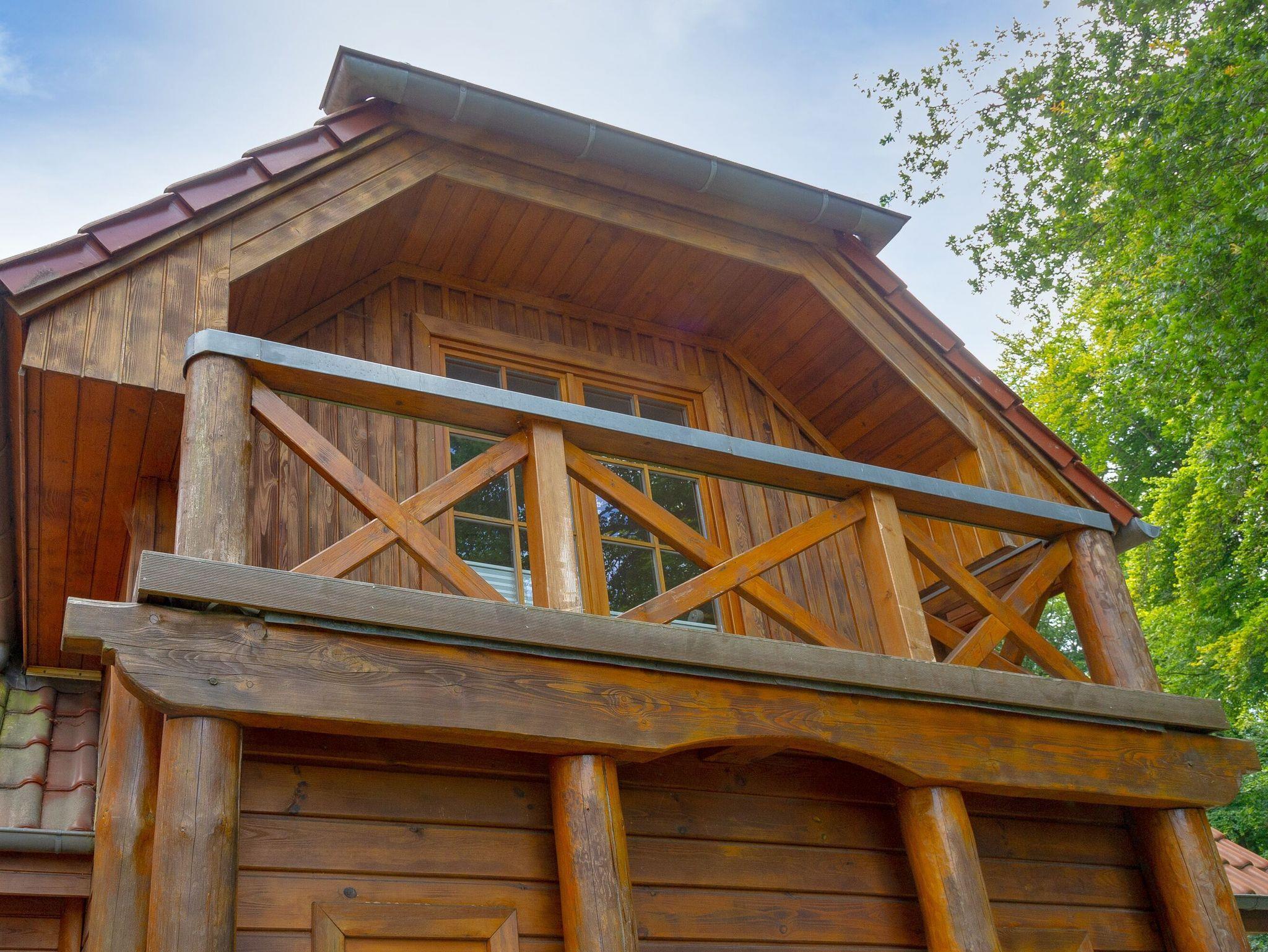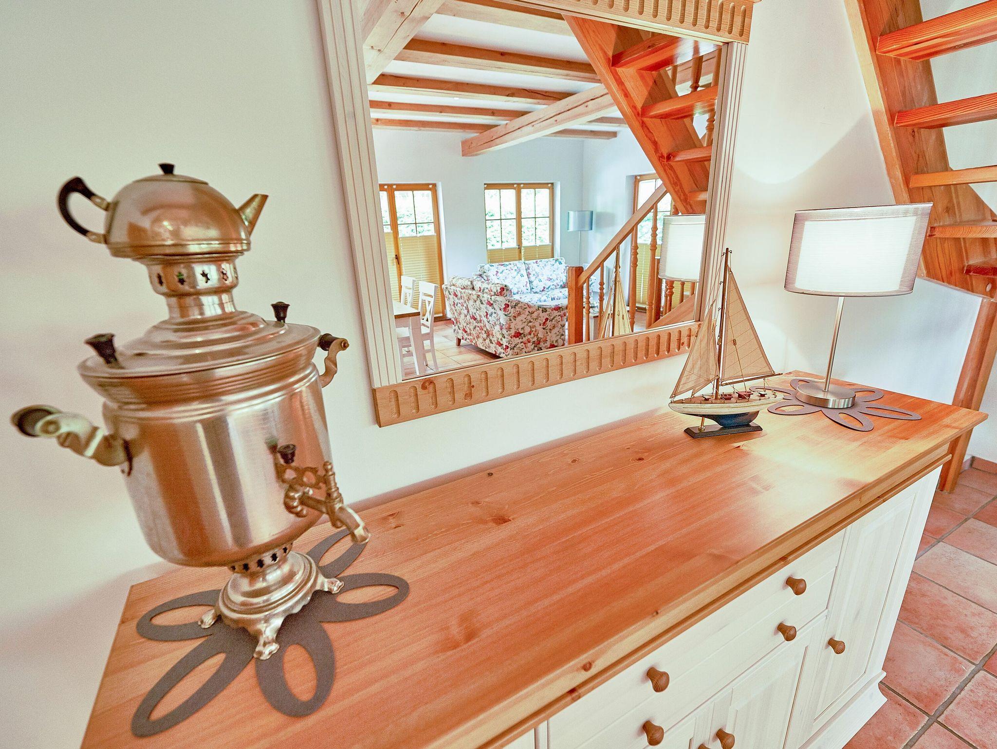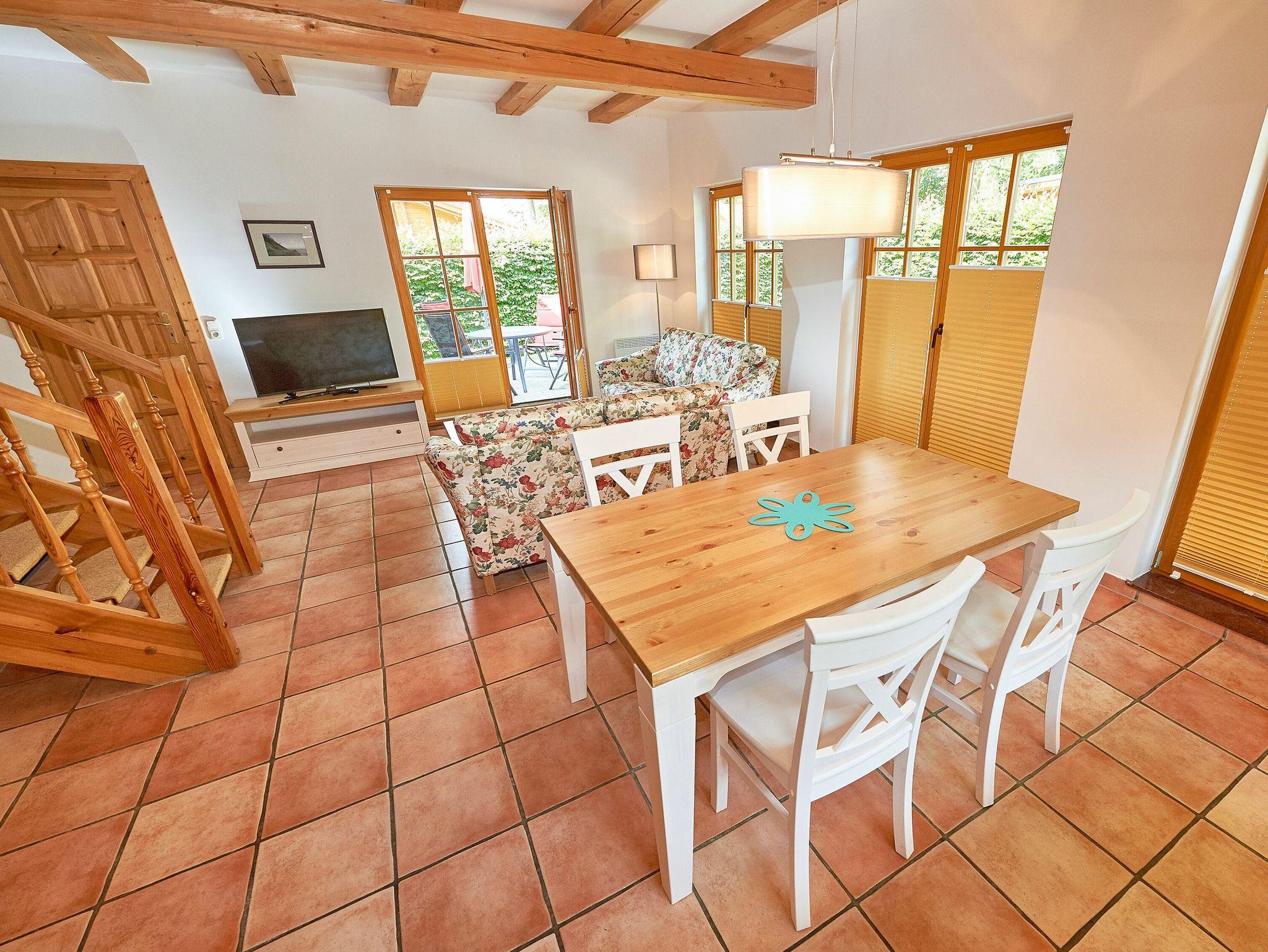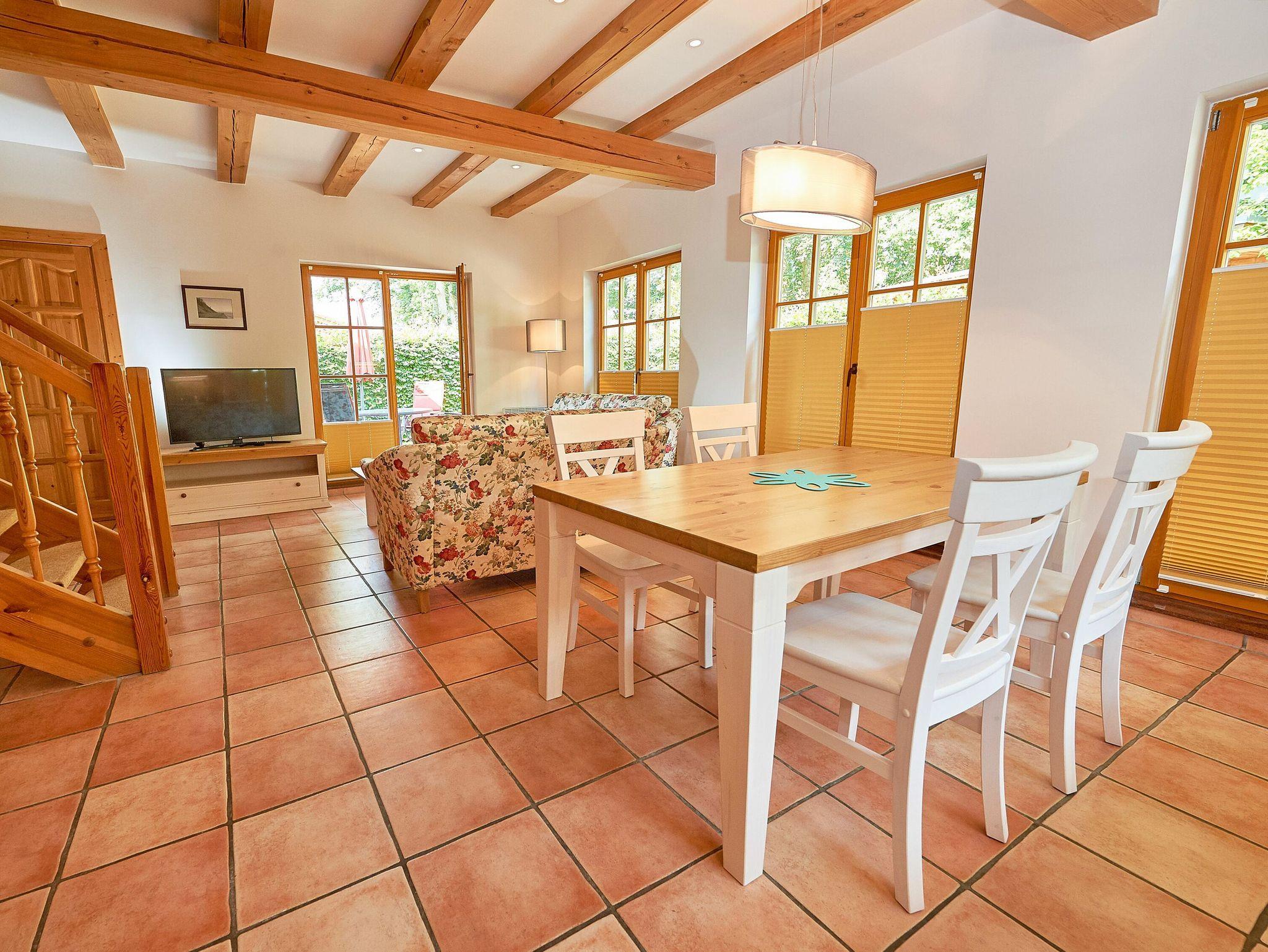 Die Haushälfte 4 begrüßt Sie an den hinteren Außenseite des Strandschlösschens Sellin mit auf zwei Ebenen verteilten Wohnfläche von rund 100 m² und vorgelagerter Terrasse. Wie in den anderen Haushälften auch, befindet sich das durch die offenen Balken besonders gemütlich wirkende Wohnzimmer im Erdgeschoss.
