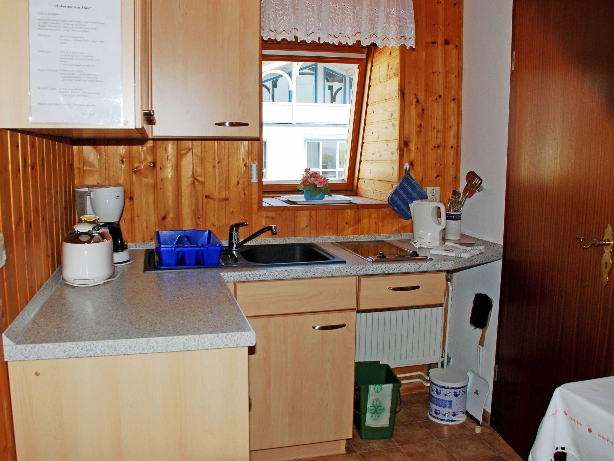 Die offene Küche ist mit einem Herd, Wasserkocher, Kaffeemaschine, Toaster und Kühlschrank komplett ausgestattet. Hier steht in einer Nische eine Liege, die auf Wunsch auch für ein Kind bis 12 Jahre zusätzlich aufgebettet werden kann.