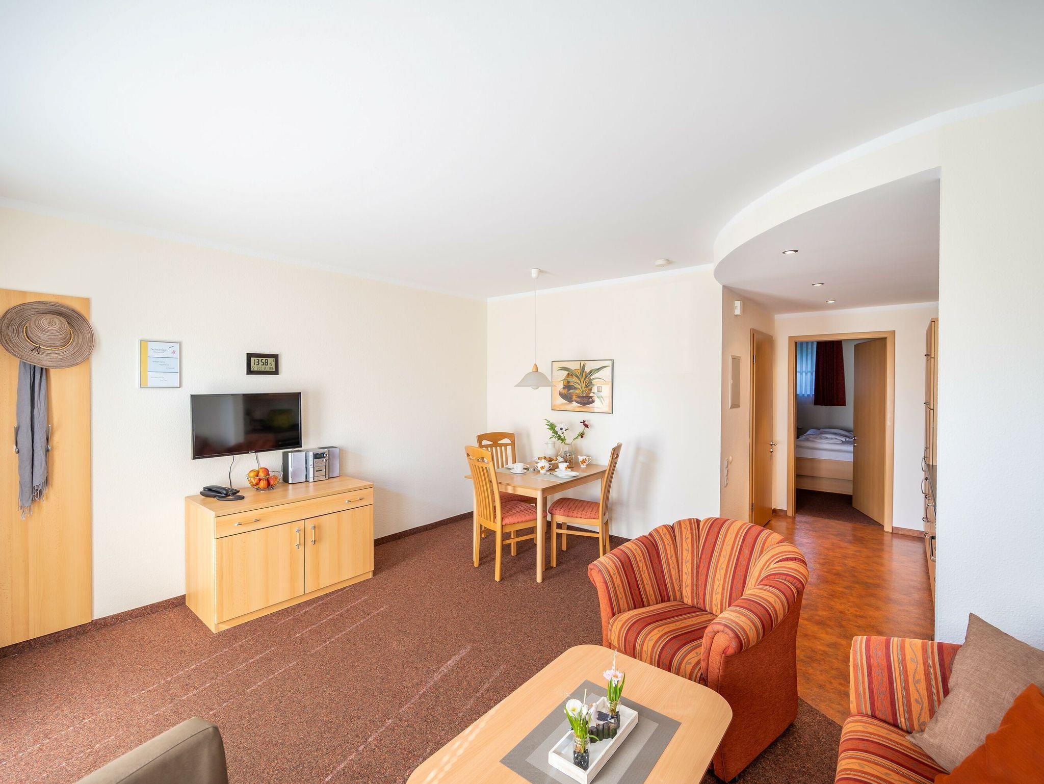 Das helle Wohnzimmer verfügt über eine bequeme Couchgarnitur,[nbsp] einen TV und eine kostenfreien WLAN-Zugang. Zudem erreichen Sie von hier aus die sonnige Terrasse inkl. Terrassenmöbel.