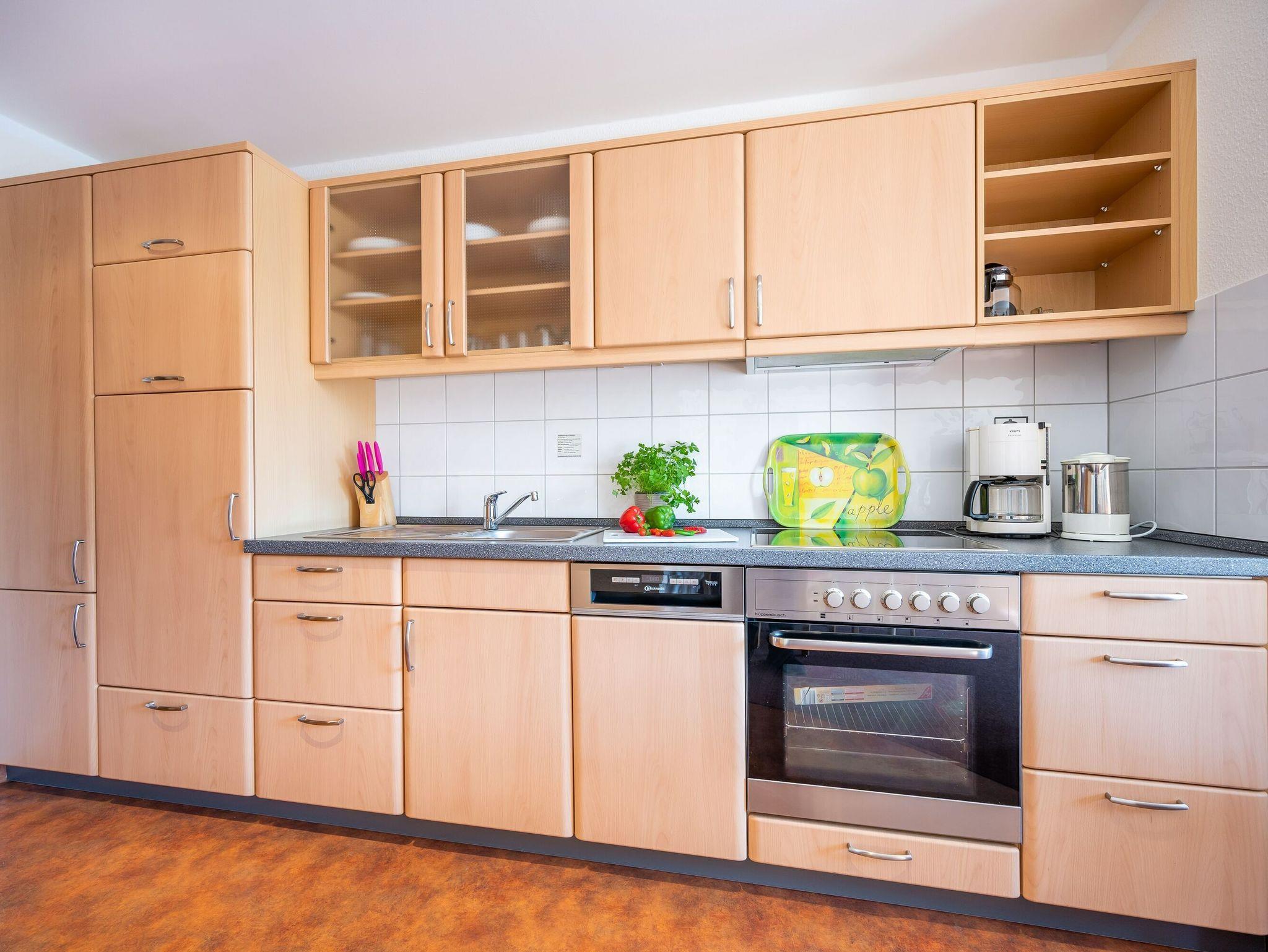 Die Küchenzeile ist mit einem Kühlschrank, einem Ceranfeld mit Backofen, einer Spülmaschine und einer Mikrowelle ausgestattet. Ebenso finden sich hier alle nötigen Küchenkleingeräte (Wasserkocher, Kaffeemaschine, Toaster..).
