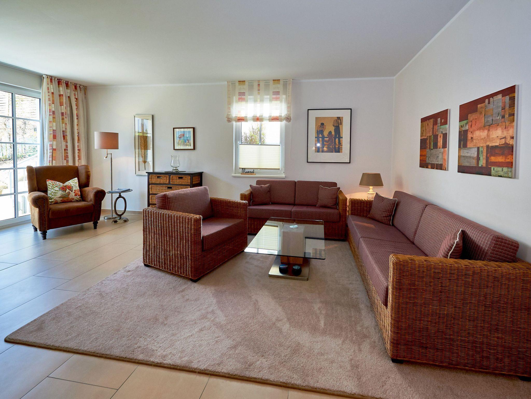Das neu eingerichtete, ca. 94 m² große 4-Raum-Appartement liegt im Erdgeschoss der Villa Annika. Sie ist ruhig gelegen, verfügt über 4 Zimmer, 2 Bäder und 2 Terrassen - eine Westterrasse und eine Ostterrasse mit je ca. 16 m². Die Terrassen sind vom Küchen- und Wohnbereich begehbar und bieten einen geschützten Aufenthalt mit Gartenmöbeln und einem Sonnenschirm.