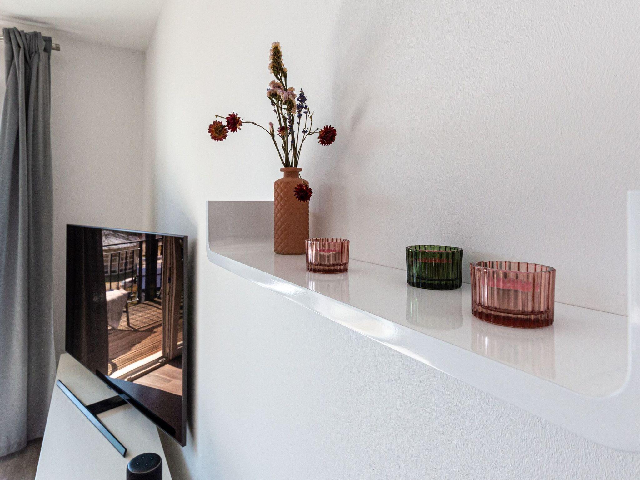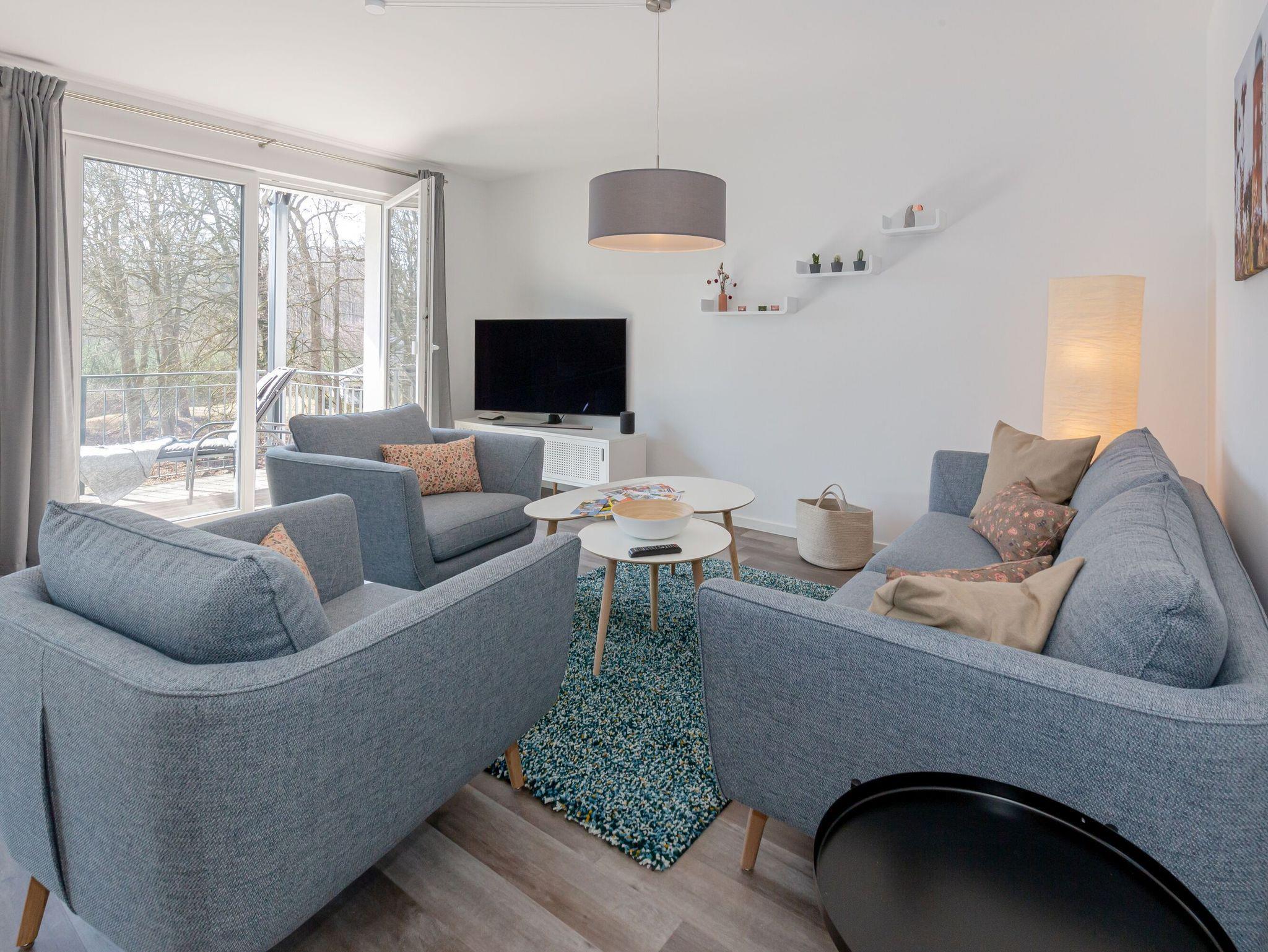Der großzügige Wohnbereich verfügt über eine gemütliche Couch und zwei Sessel. Ein Smart-TV mit Internetanschluss, ein Amazon Echo und der kostenfreie WLAN-Zugang komplettieren die moderne Ausstattung.