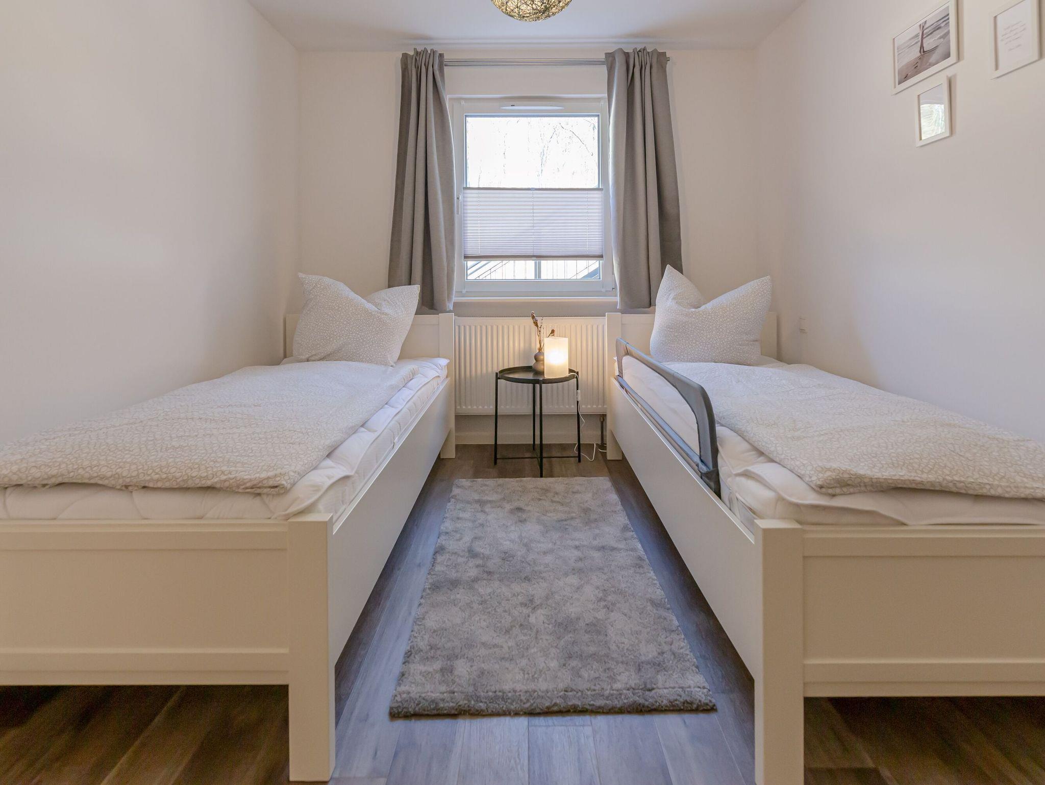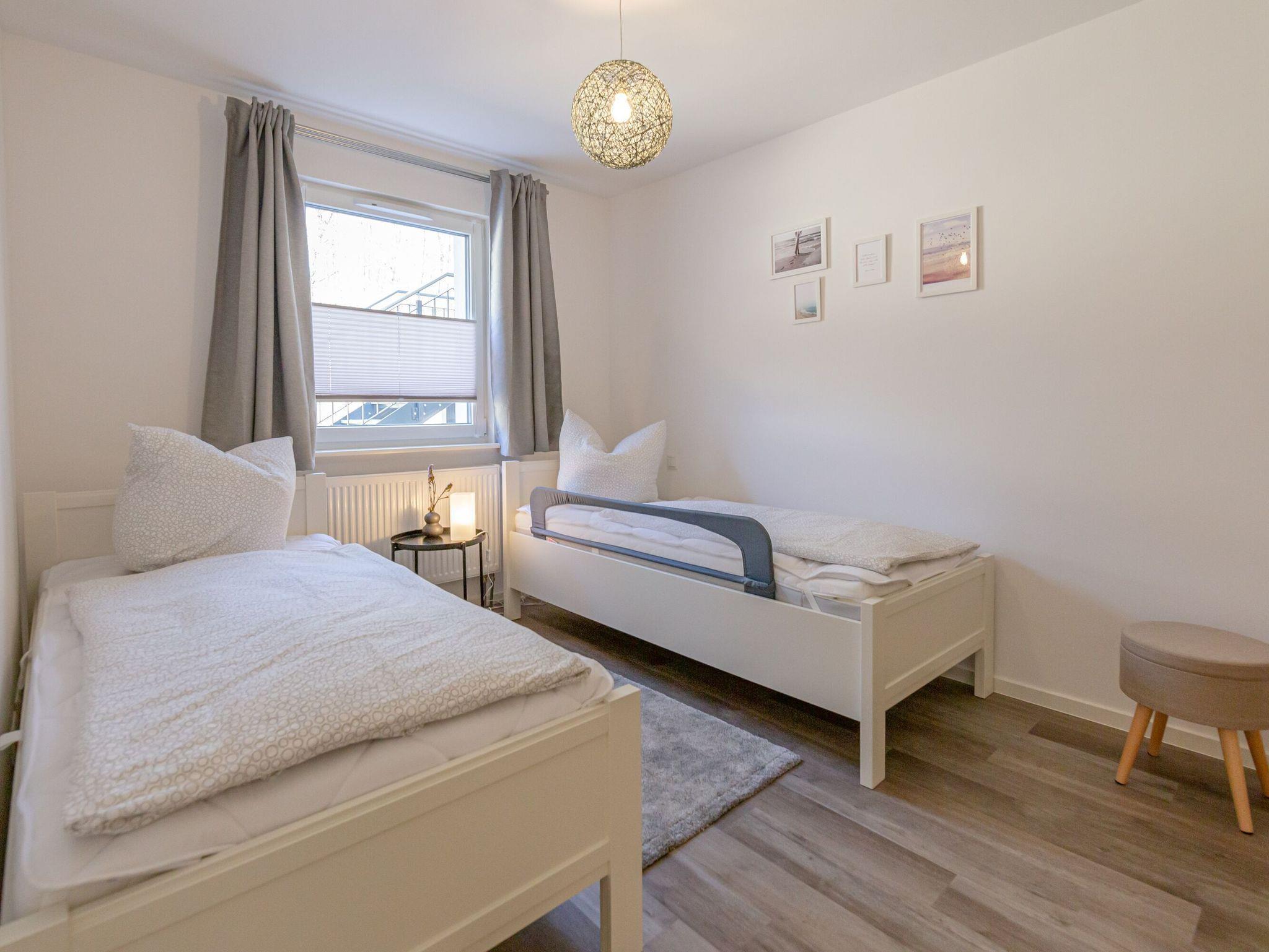 Zwei komfortable Schlafzimmer sorgen für die nötige Privatsphäre; eines der beiden ist mit einem hochwertigen Doppelbett, das andere mit zwei Einzelbetten ausgestattet.