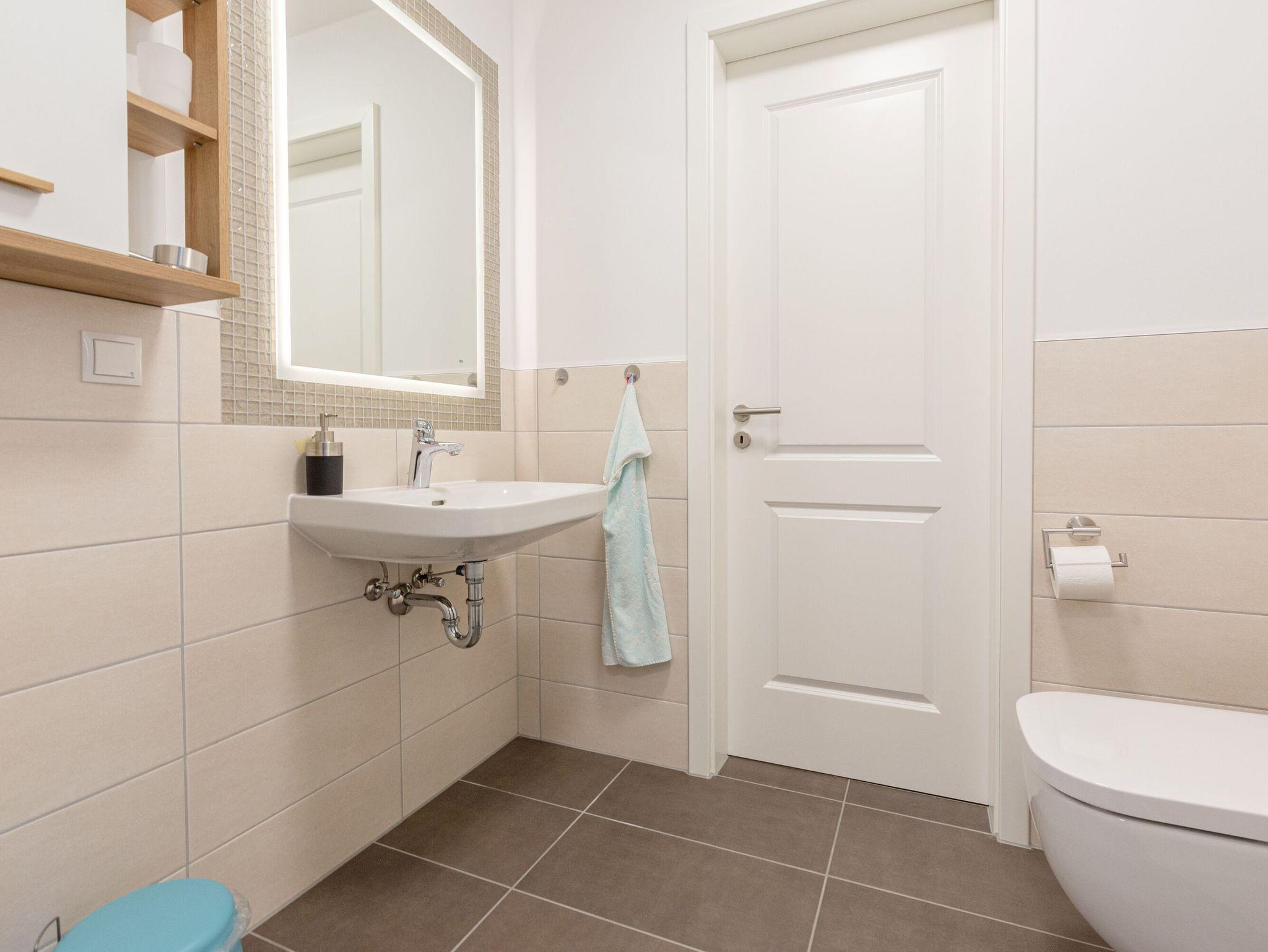 Neben einem Badezimmer mit edler Glasdusche und WC befindet sich ein zusätzliches Gäste-WC in der Wohnung.