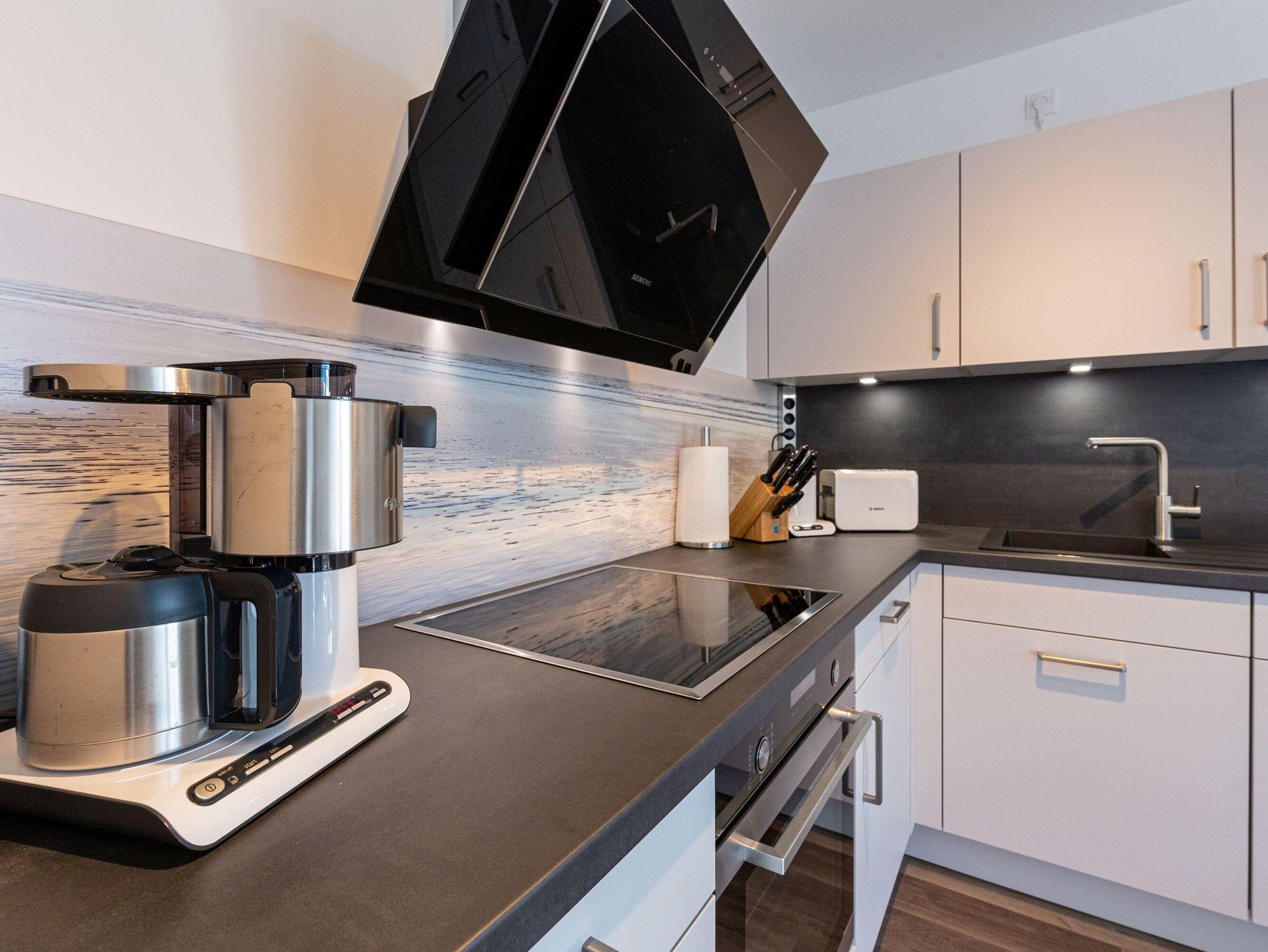 Die offene Küche ist voll ausgestattet und lädt Sie zu ausgiebigen Kochabenden ein. Mit einem großen Kühlschrank, einem Herd mit Induktionskochfeld und einer Geschirrspülmaschine der gehobenen Klasse bleiben keine Wünsche offen. Auch eine Kaffeemaschine, ein Wasserkocher und allerlei Küchenkleingeräte stehen für Sie bereit. Ein heller Essbereich mit einem großen Esstisch schließt sich direkt an die offene Küche an.