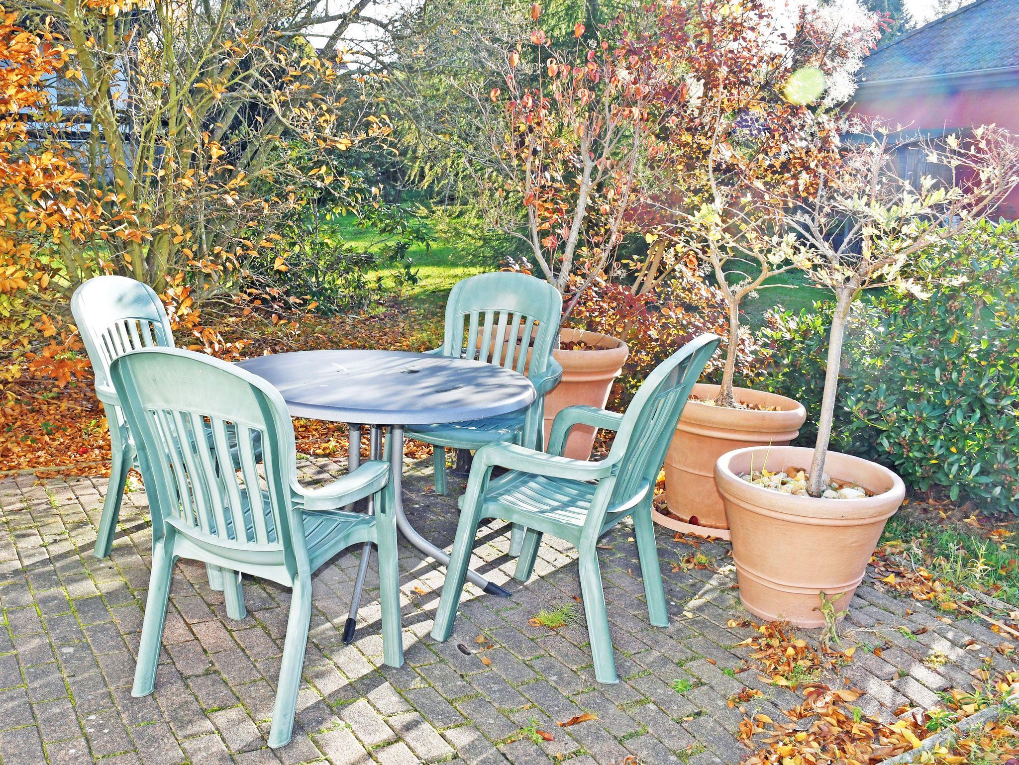 Zum Ferienbungalow gehört auch eine Terrasse mit Gartenmöbeln.