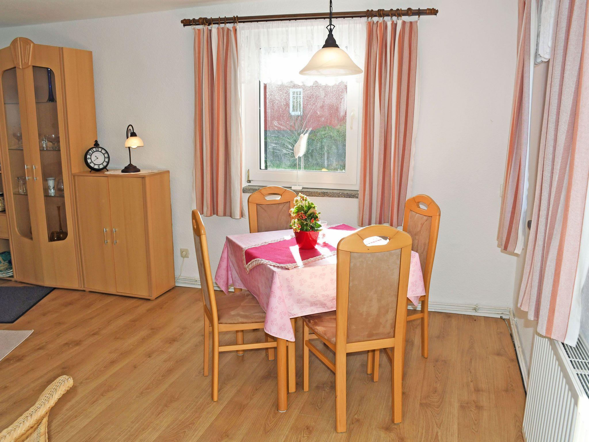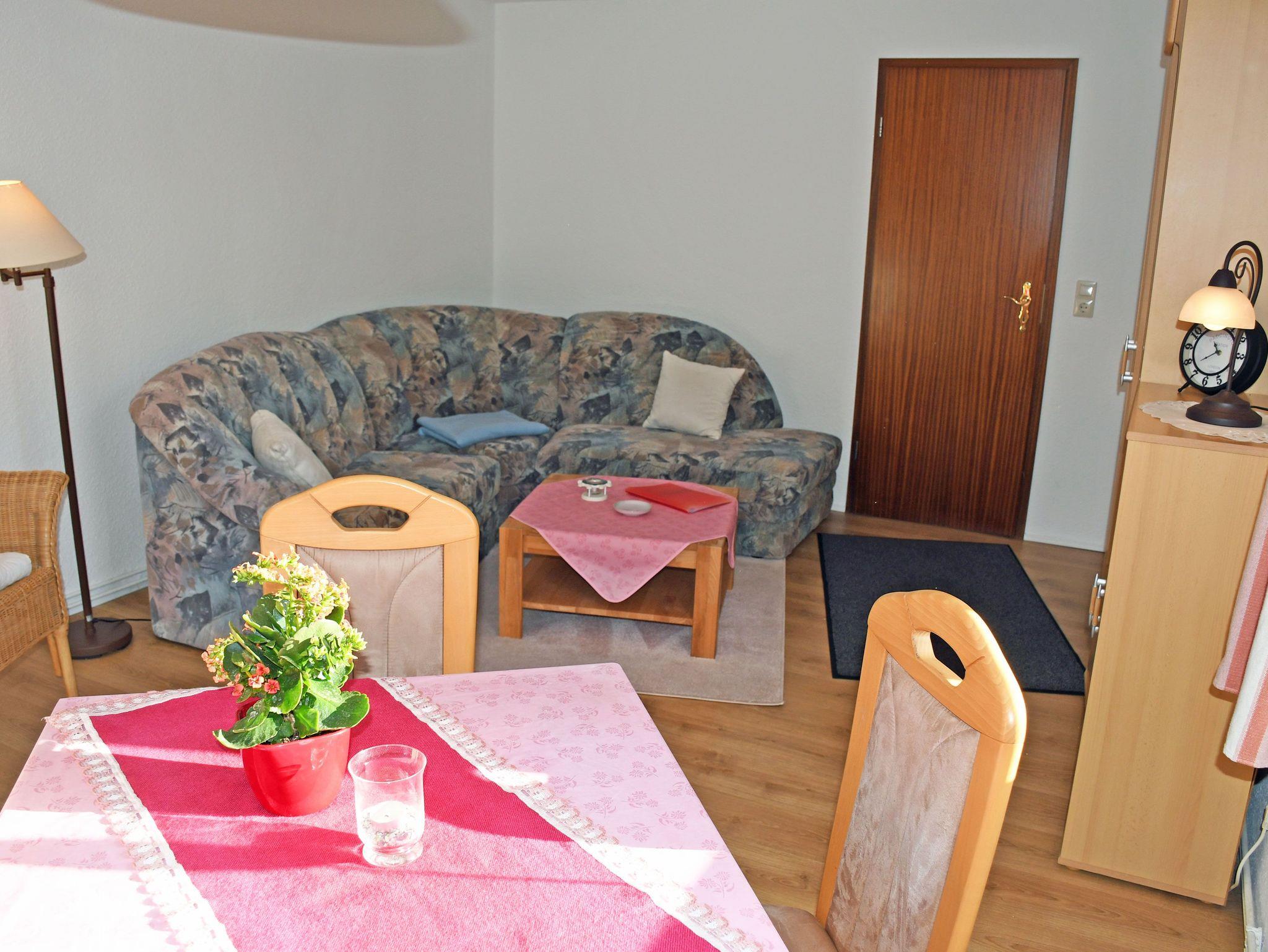 Im Wohnraum befinden sich eine Sitzcouch mit Tisch und Sessel, ein modernes Flachbild-TV-Gerät und eine Schrankwand. Durch das große Türfenster zur Terrasse haben Sie einen sehr schönen Ausblick in den Garten und die umliegende Natur.