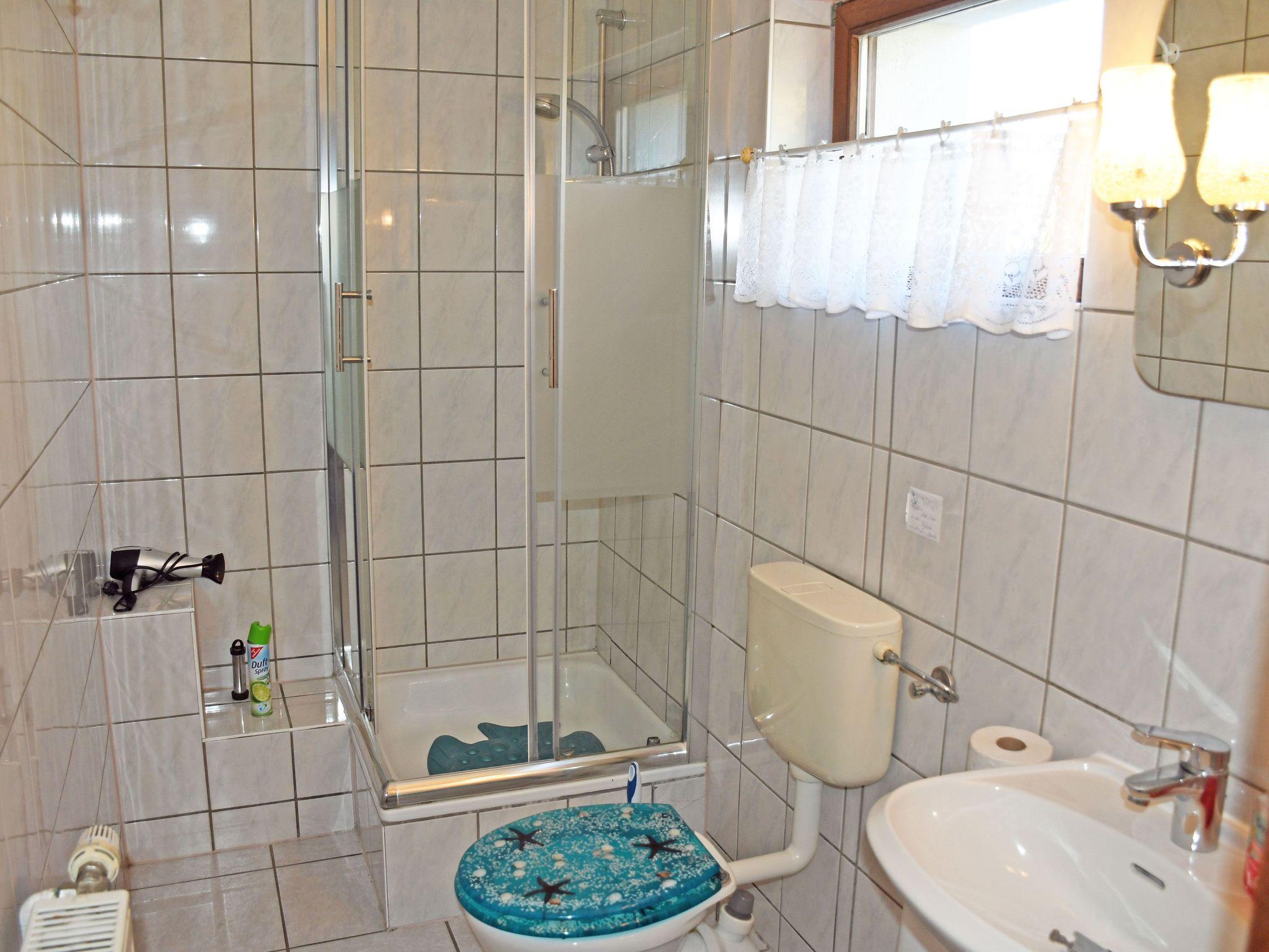 Das Bad ist mit Dusche, WC und Waschbecken ausgestattet.