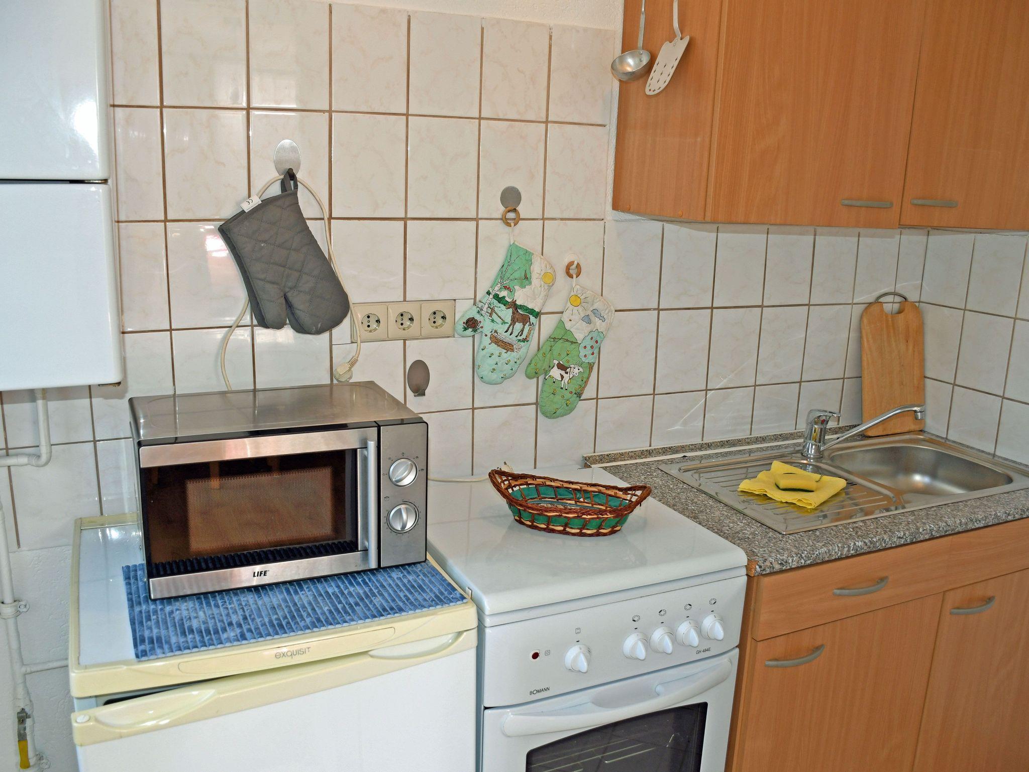 Die kleine Küchenzeile ist mit Herd, Kühlschrank, Backofen, Toaster, Mikrowelle, Wasserkocher und Kaffeemaschine ausgestattet. Hier steht auch ein Esstisch mit Stühlen.