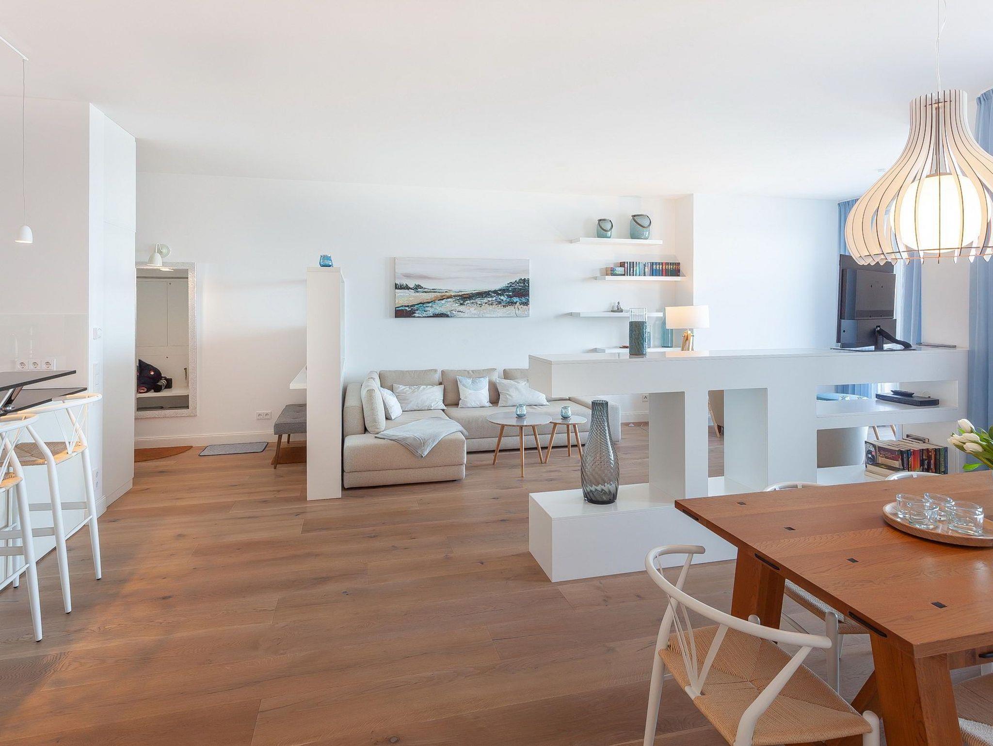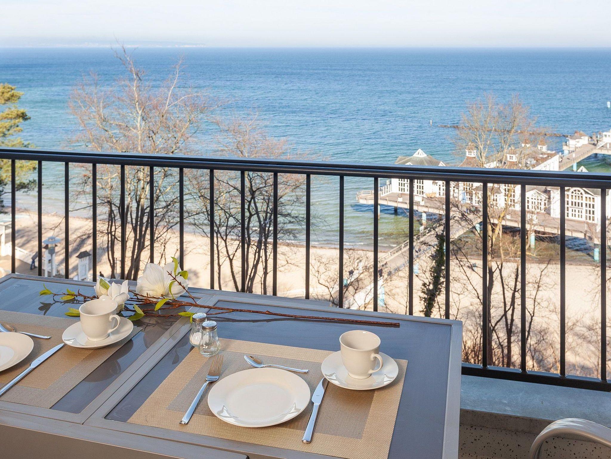 Im offen gestalteten Wohn- und Essbereich können Sie in einer gemütlichen Sitzecke mit einem Schlafsofa und 2 Sesseln die Ruhe und den fantastischen Panoramablick über die Ostsee genießen. Bei schönem Wetter lassen Sie den Blick von dem Balkon aus auf sich wirken, der jederzeit zu einem gemütlichen Frühstück mit Meeresbriese einlädt. Für zeitgemäße Unterhaltung im Wohnzimmer sorgen ein Flachbild-TV, eine Musikanlage, ein CD/DVD-Player und kostenfreies W-LAN.