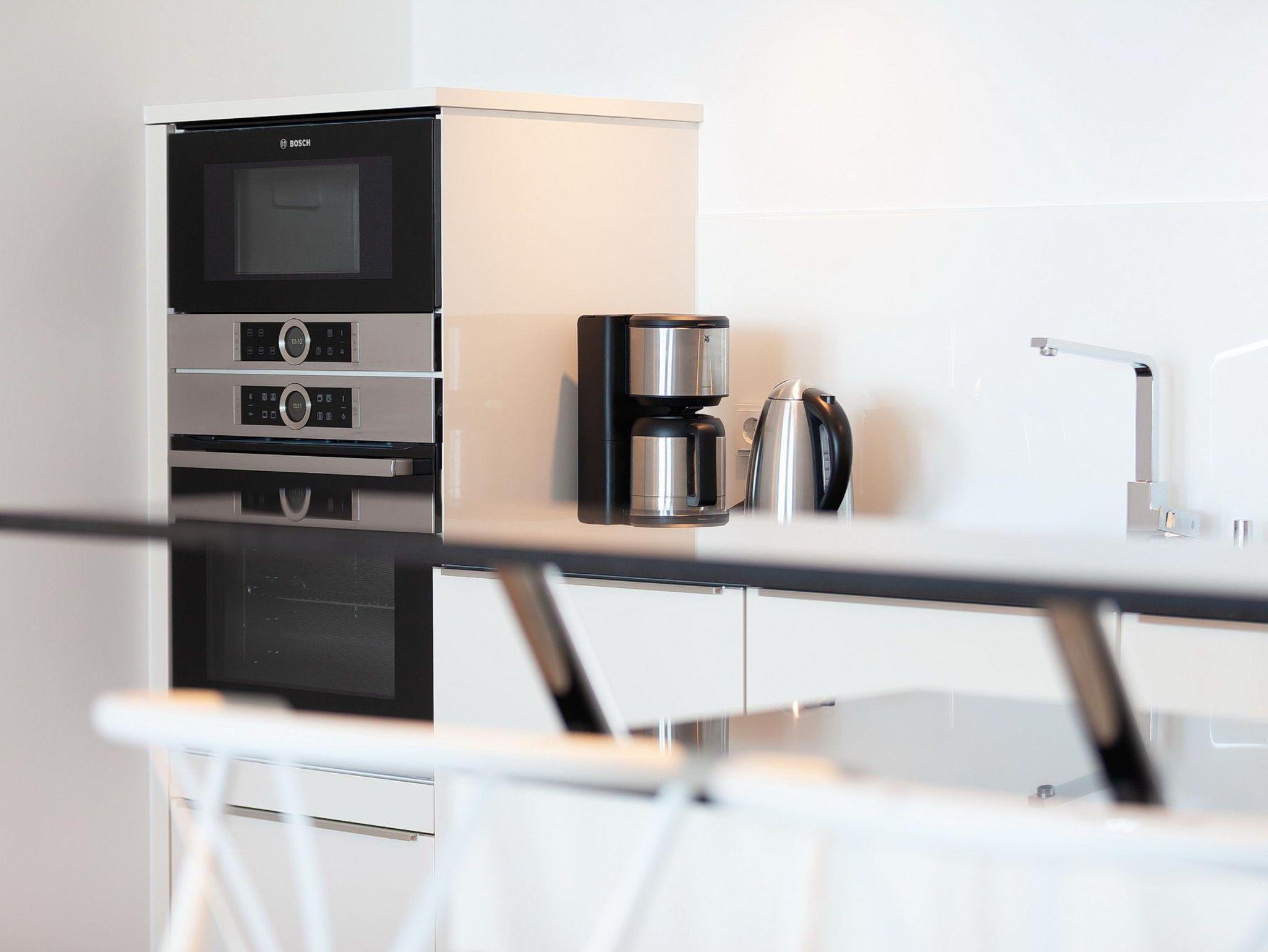 Wer gerne kocht, wird sich in der modernen, voll ausgestatteten Küchenzeile wohlfühlen. Sie verfügt über einen Herd mit 4 Ceranfeldern, einen Backofen, einen Geschirrspüler, einen Kühlschrank mit Gefrierkombination, einer Mikrowelle und diversen Küchenutensilien. Als Raumtrenner steht Ihnen ein Tresen als weitere Nutzfläche zur Verfügung. Der Küchenbereich wird ergänzt durch einen Esstisch mit Panoramablick.
